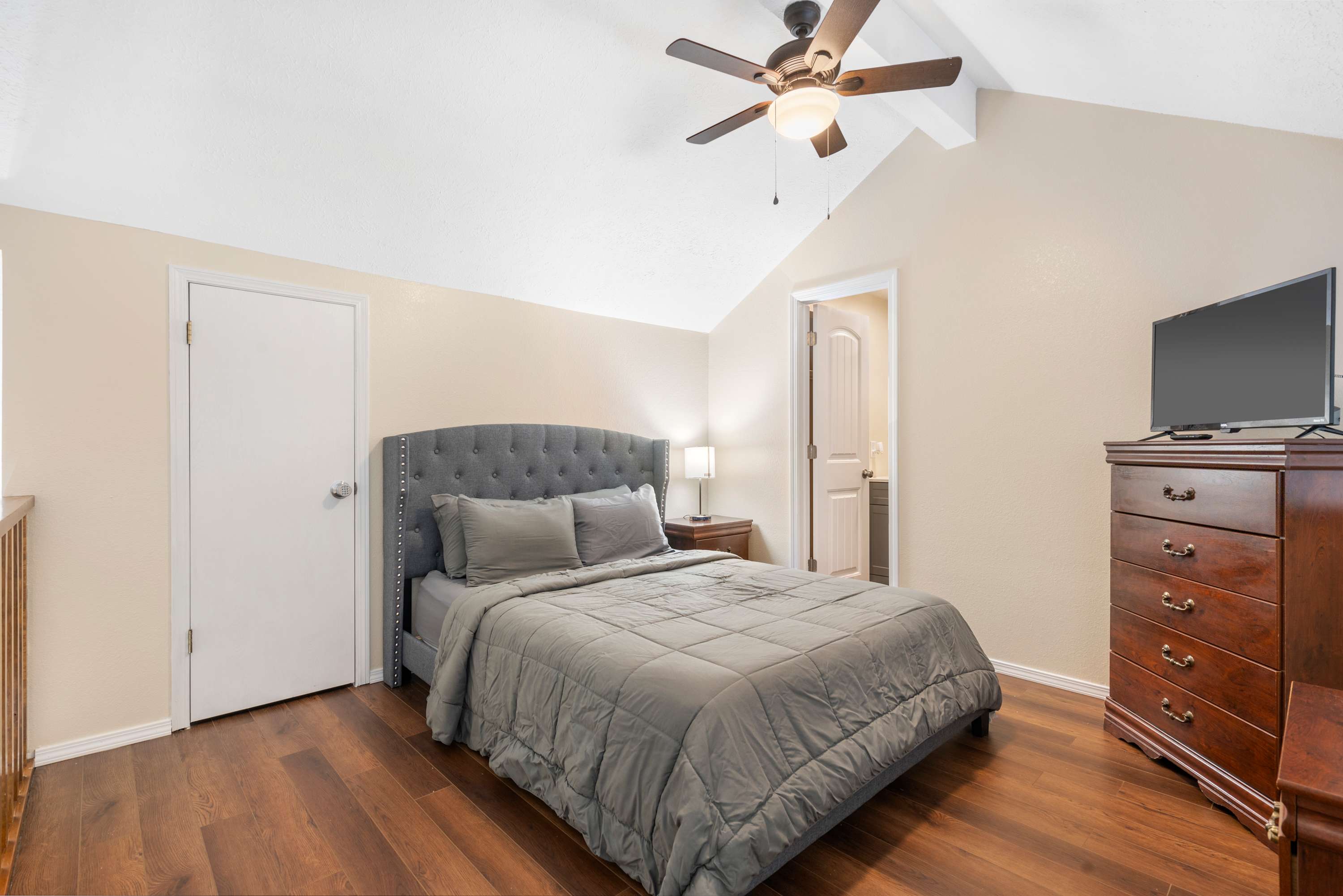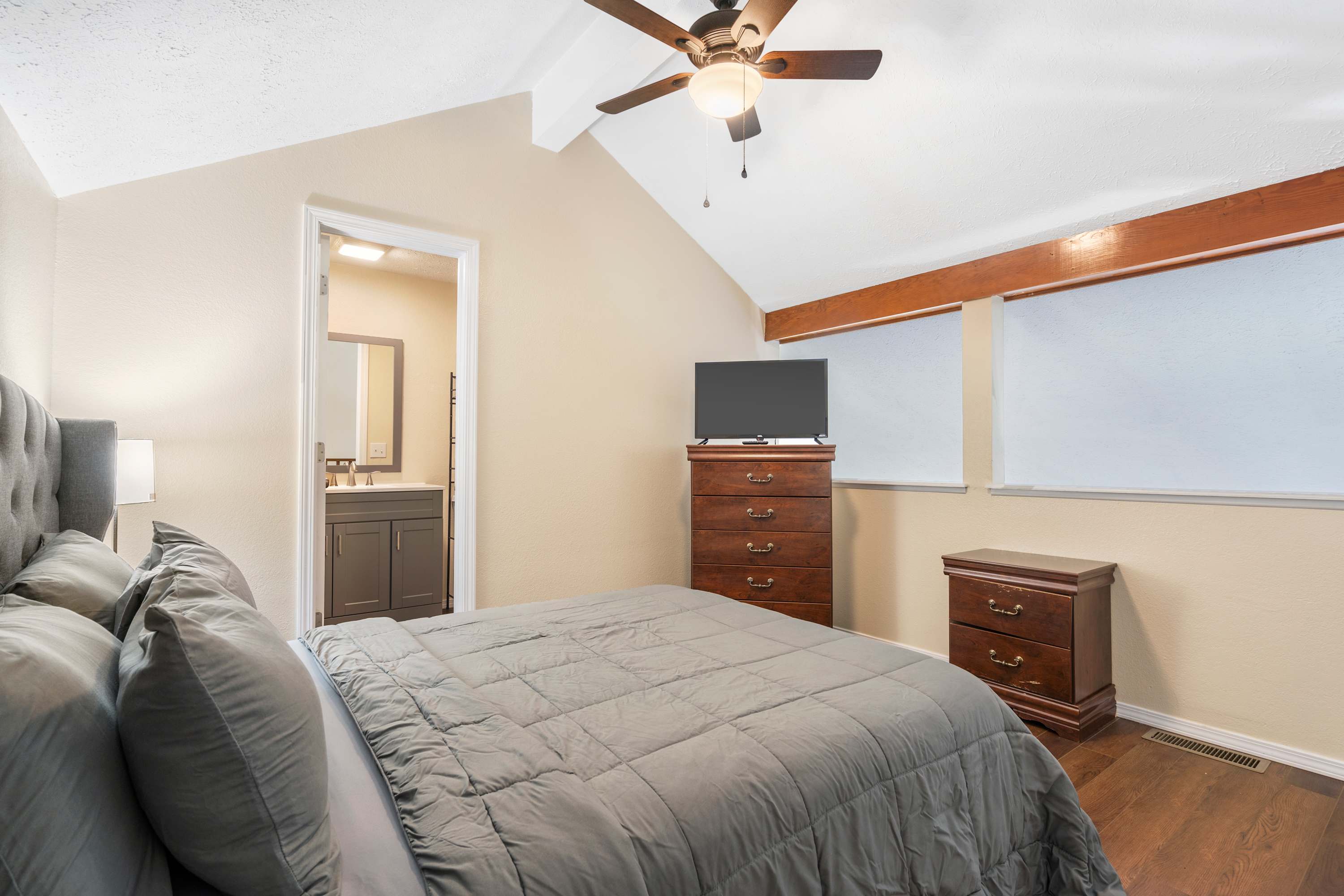 Bedroom #2 is a lofted bedroom and includes a queen size bed, smart TV, and ensuite bathroom with a single vanity and walk-in shower.