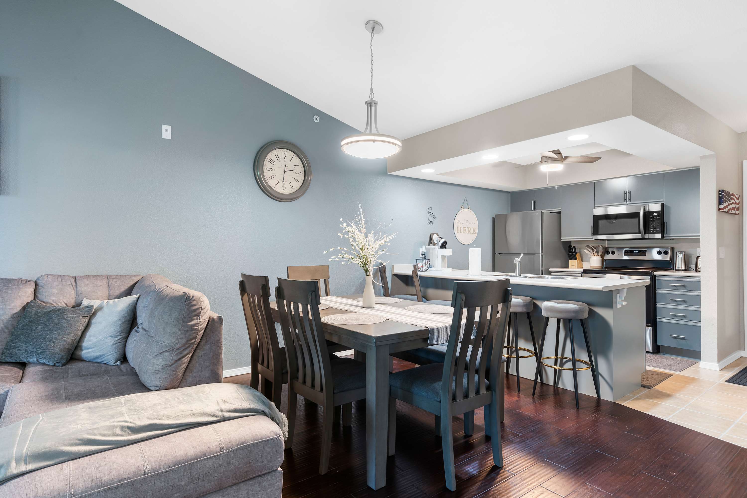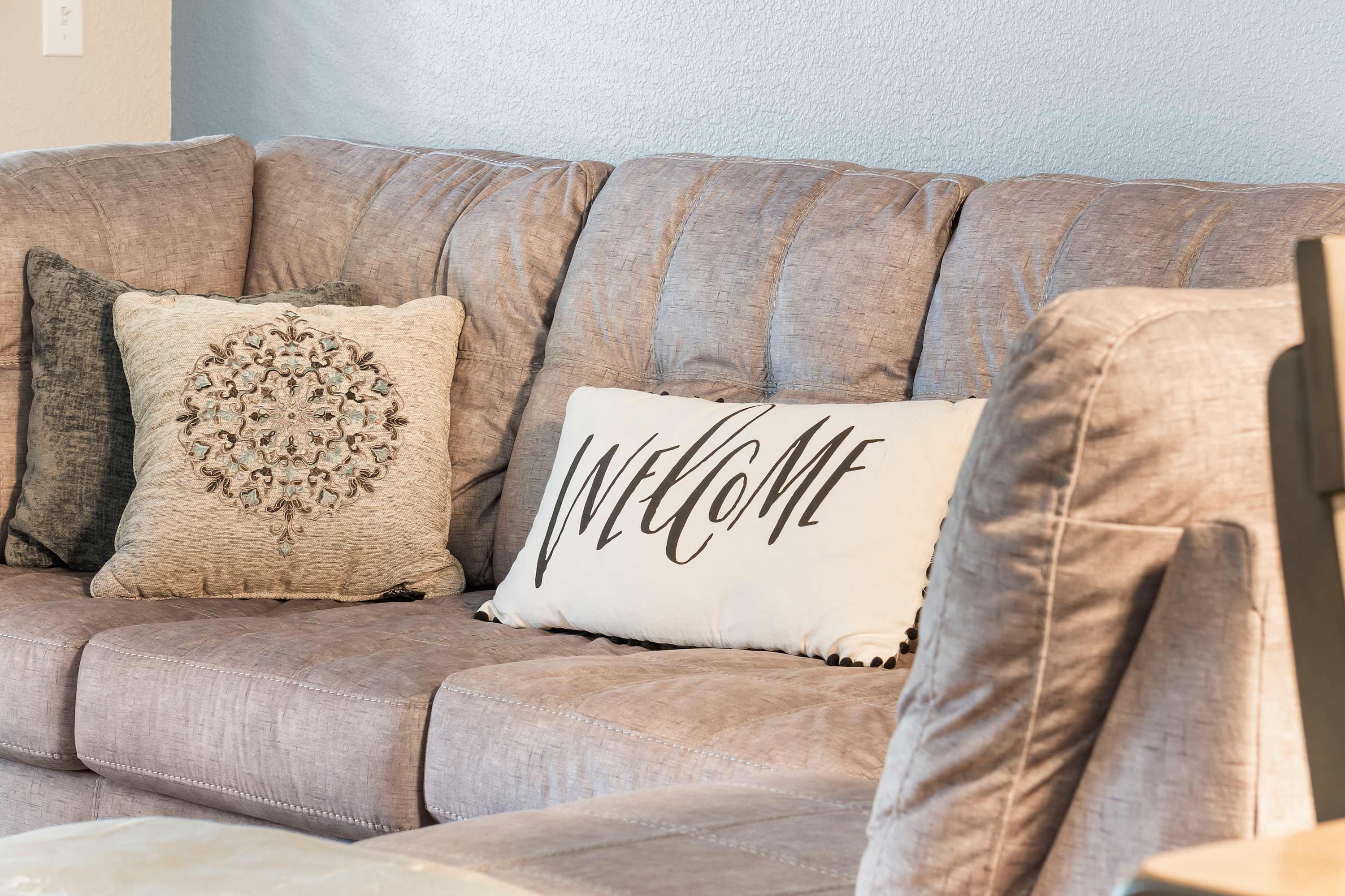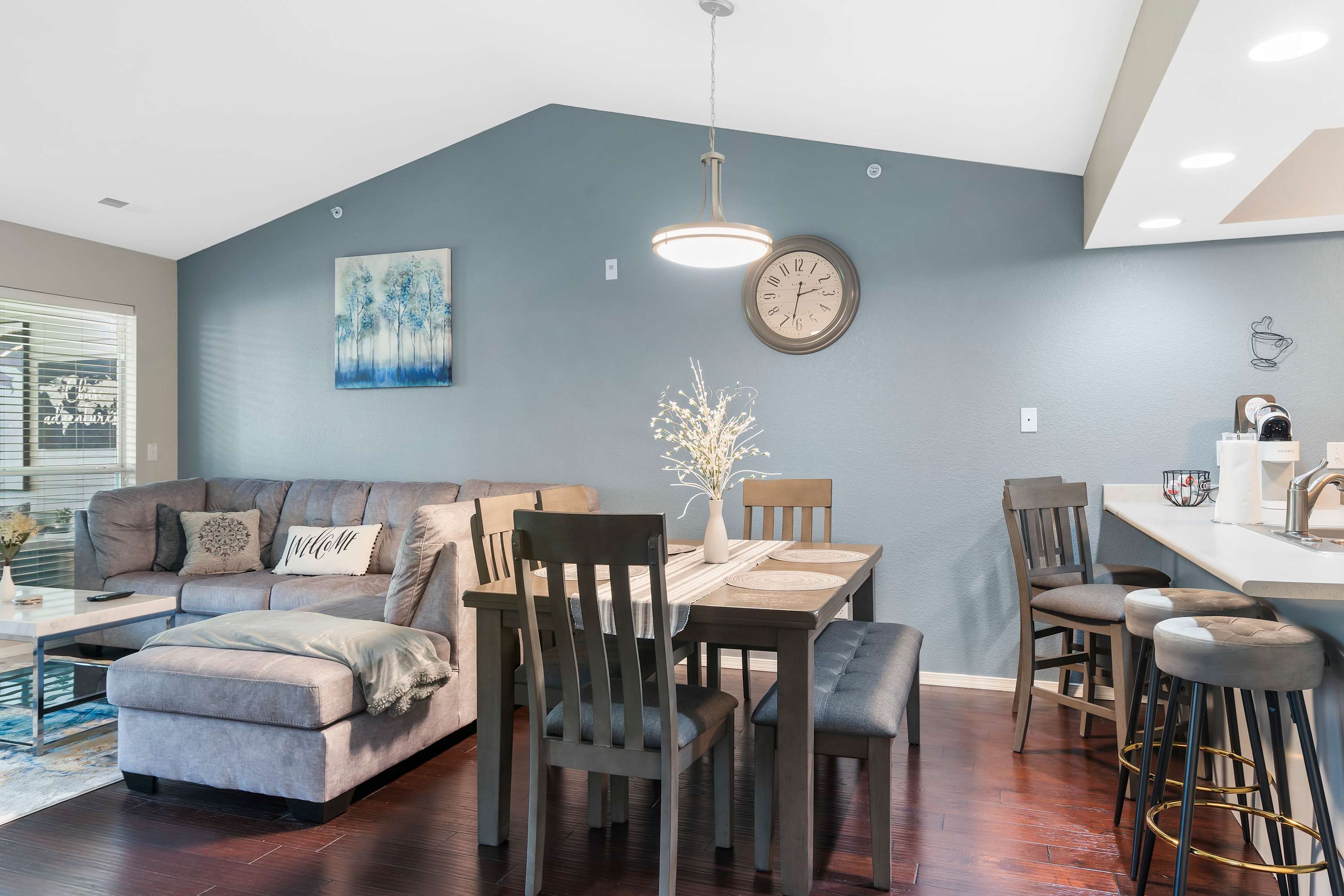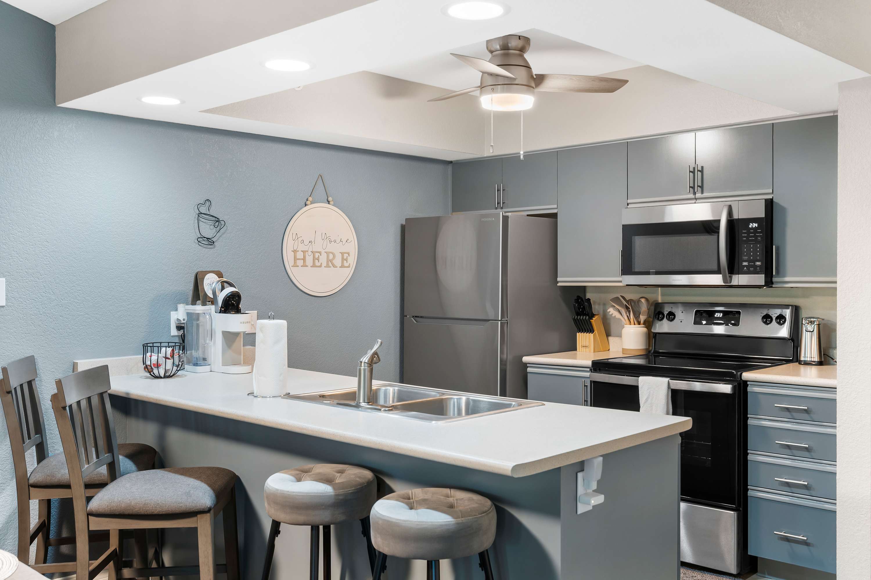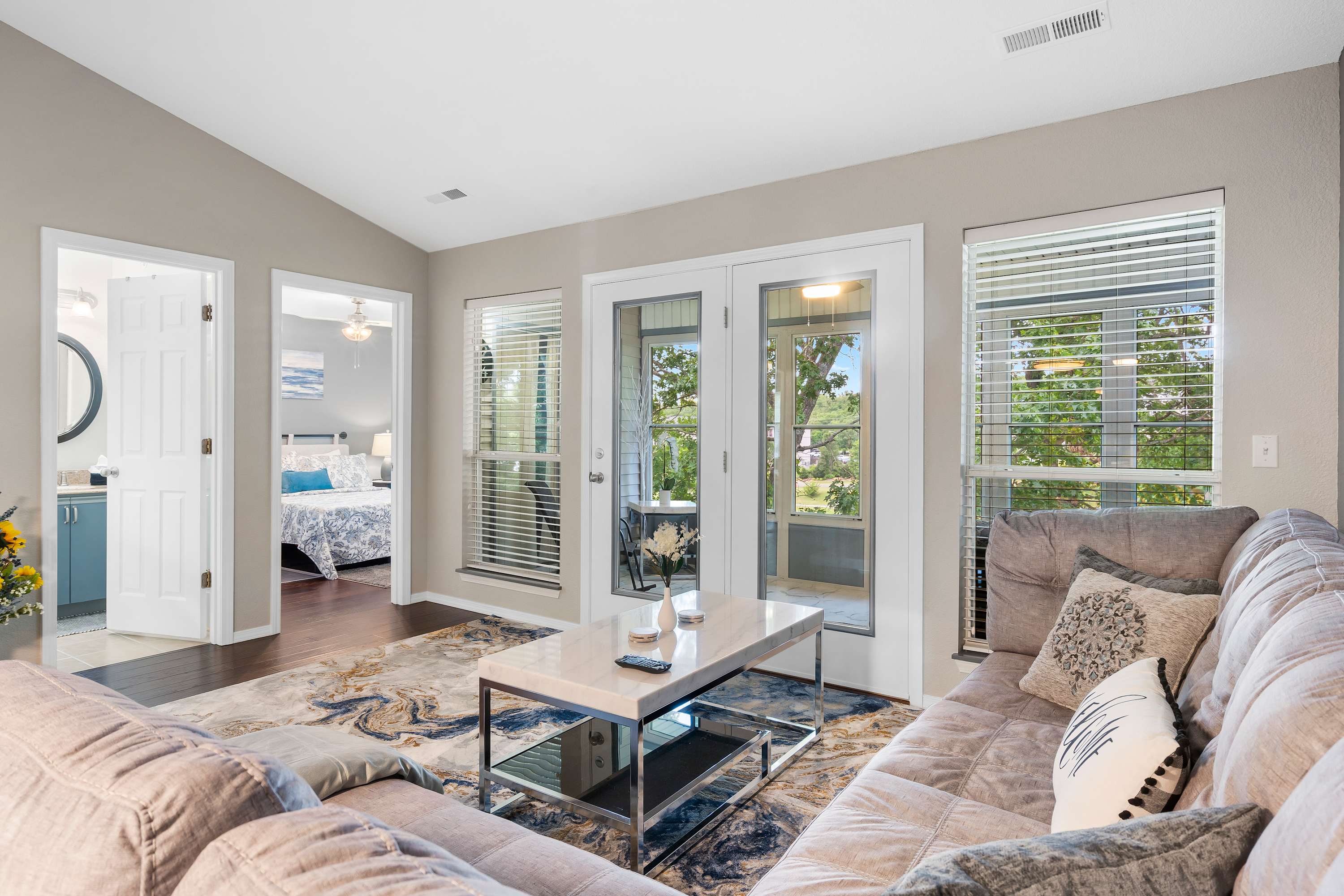 Inside the home, the open floorplan features soaring vaulted ceilings sitting atop brightly lit spaces expertly curated in comfortable furnishings and sophisticated décor. Relax in the living room on plush, L-shaped sofa seating while you stream all your favored entertainment on the smart TV. Step through the double doors and out into the 3-seasons sunroom overlooking serene views of the golf course and offering a quiet space for enjoying your morning coffee or an evening glass of wine. Back indoors, the well-equipped kitchen showcases stainless steel appliances alongside ample countertop space and cabinetry stocked with cookware and dining ware for assisting in all your culinary endeavors. Dine together at the formal table with seating for 6 or keep things casual at the counter with high-top stool seating for 4.