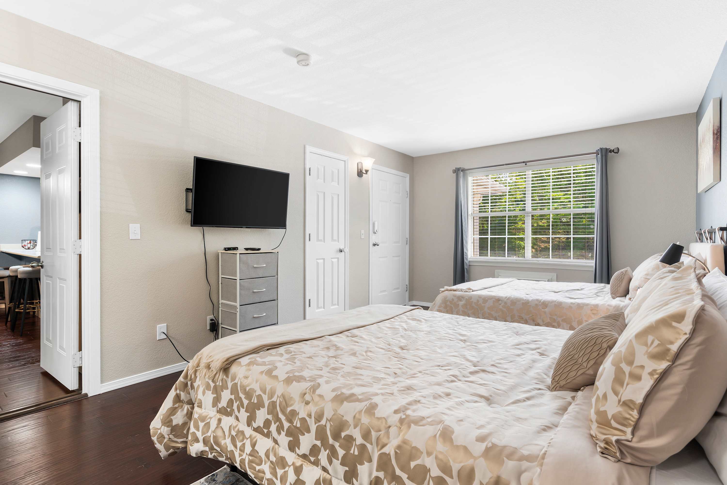 Bedroom #1 includes 2 queen size beds, a smart TV, and ensuite bathroom with a single vanity and shower/tub combo.