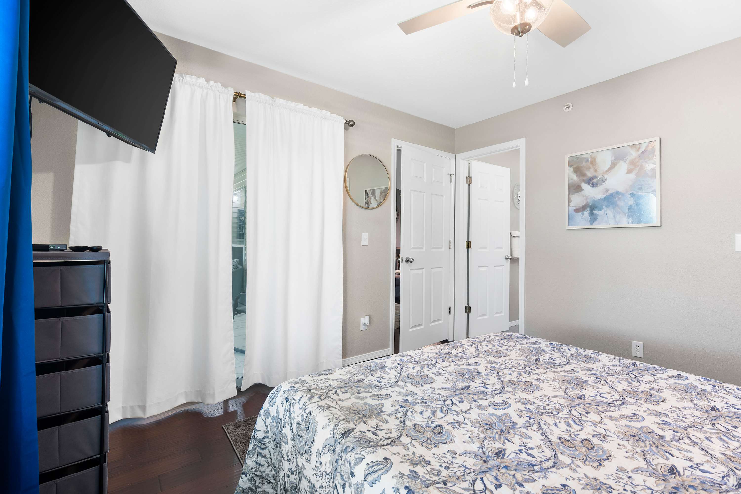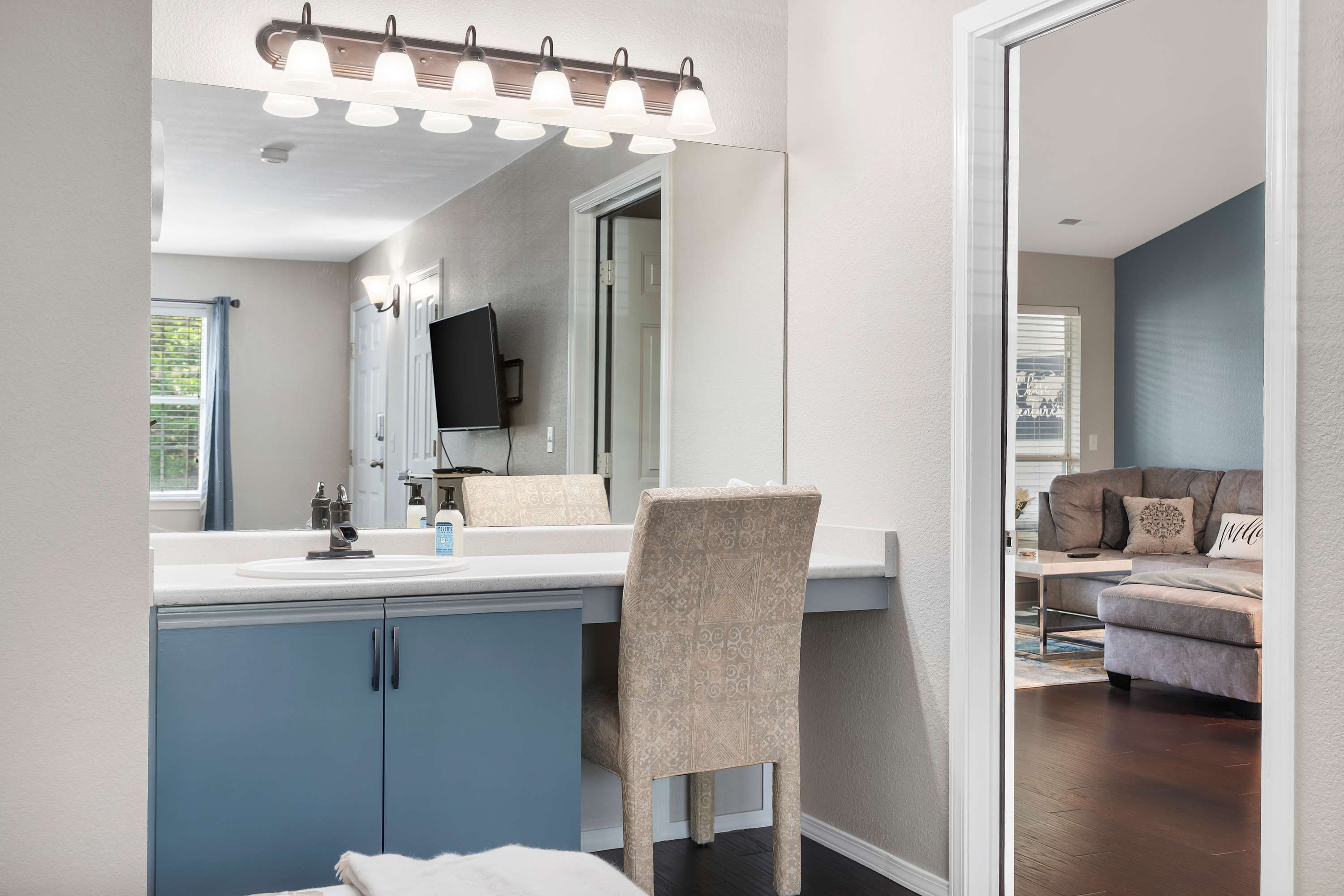 Bedroom #2 includes a queen size bed, smart TV, and ensuite bathroom with a single vanity and shower/tub combo.