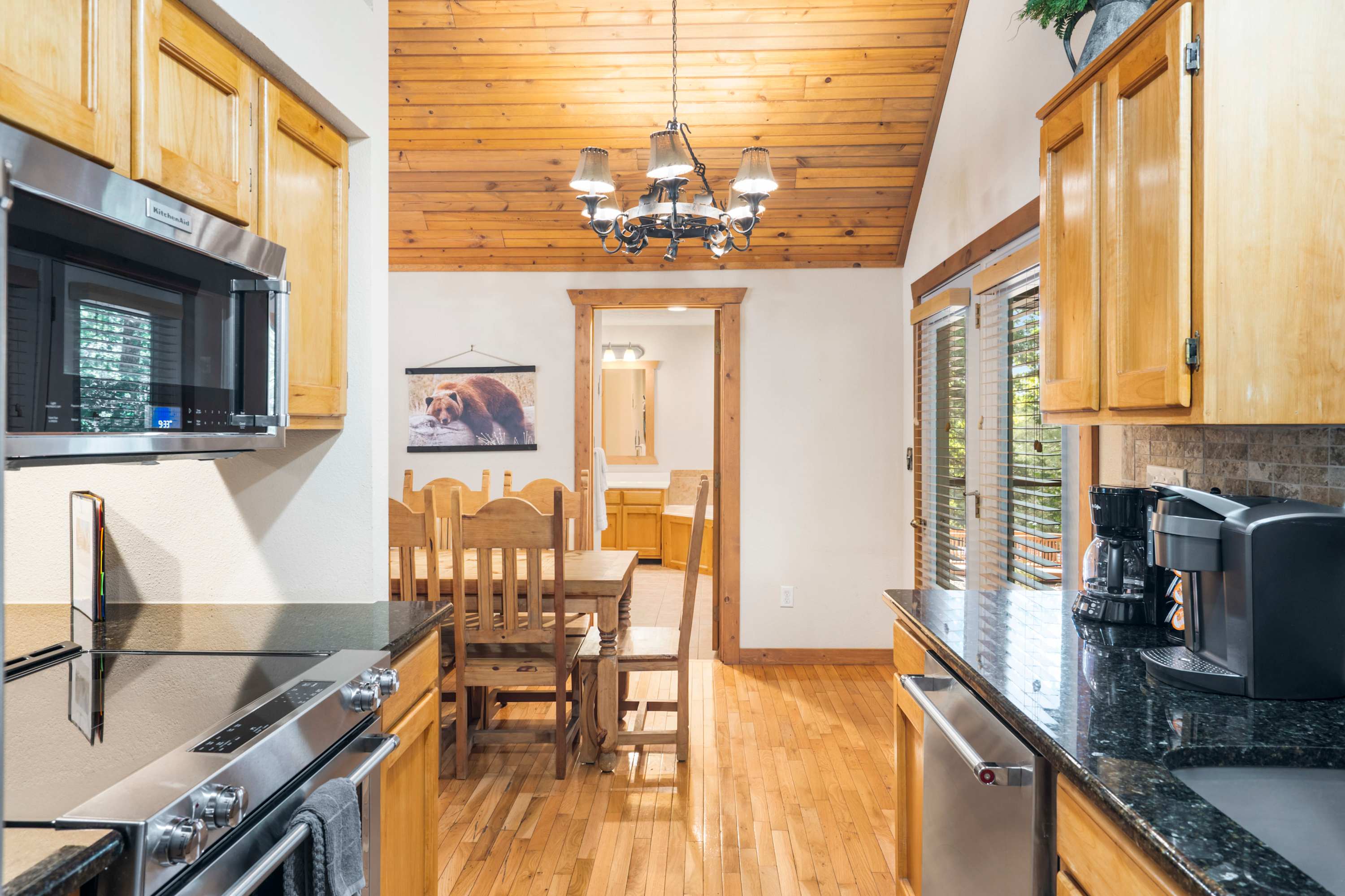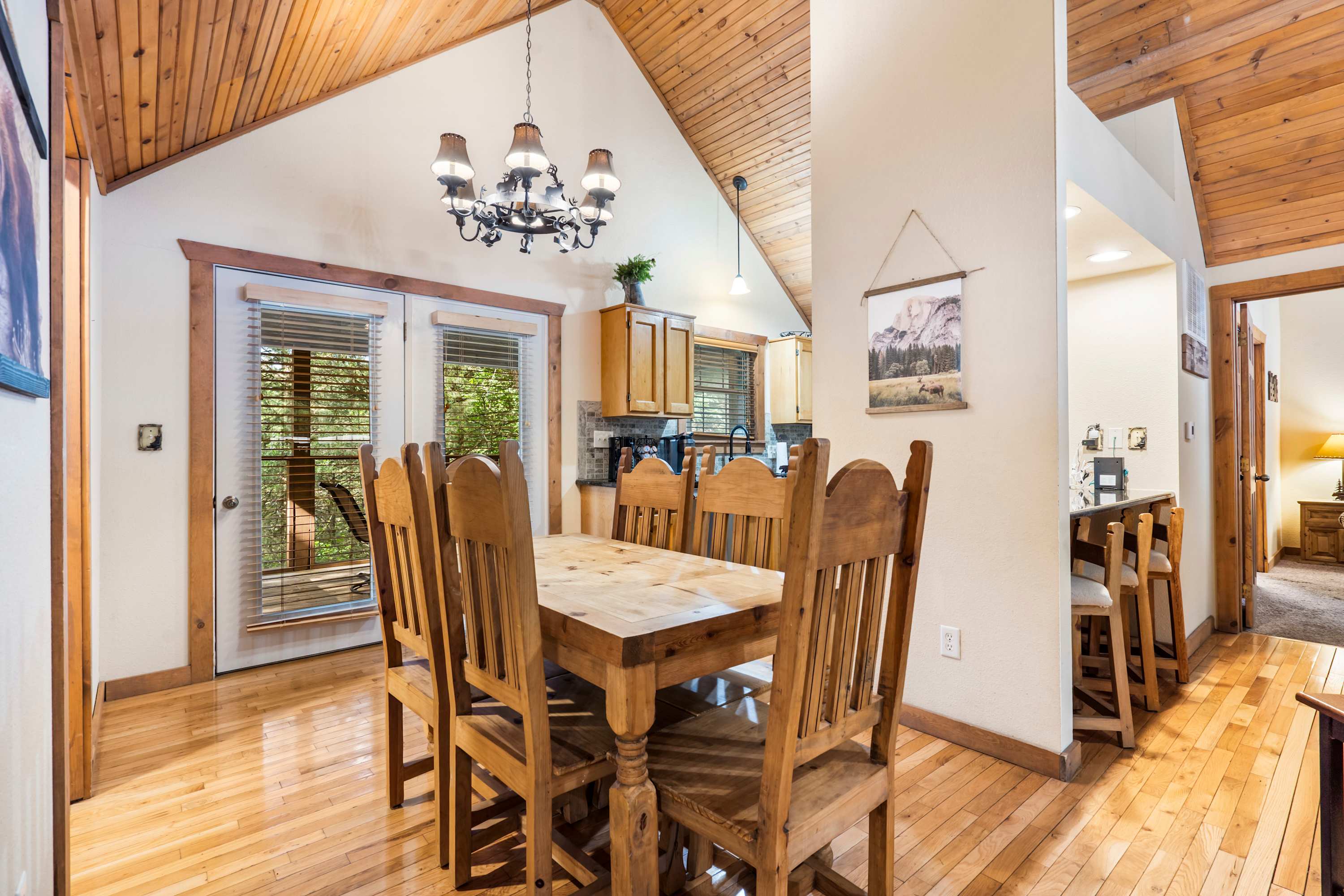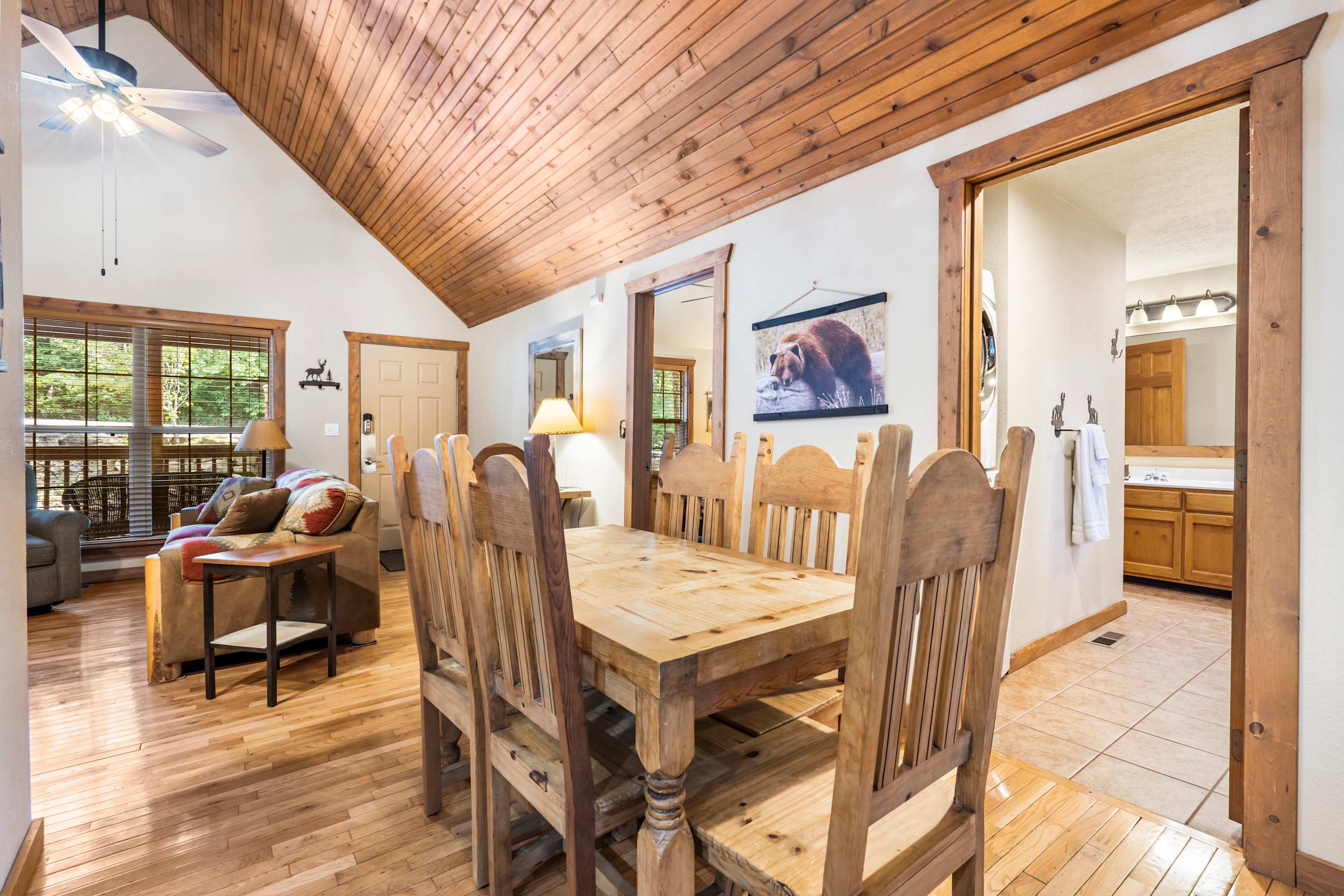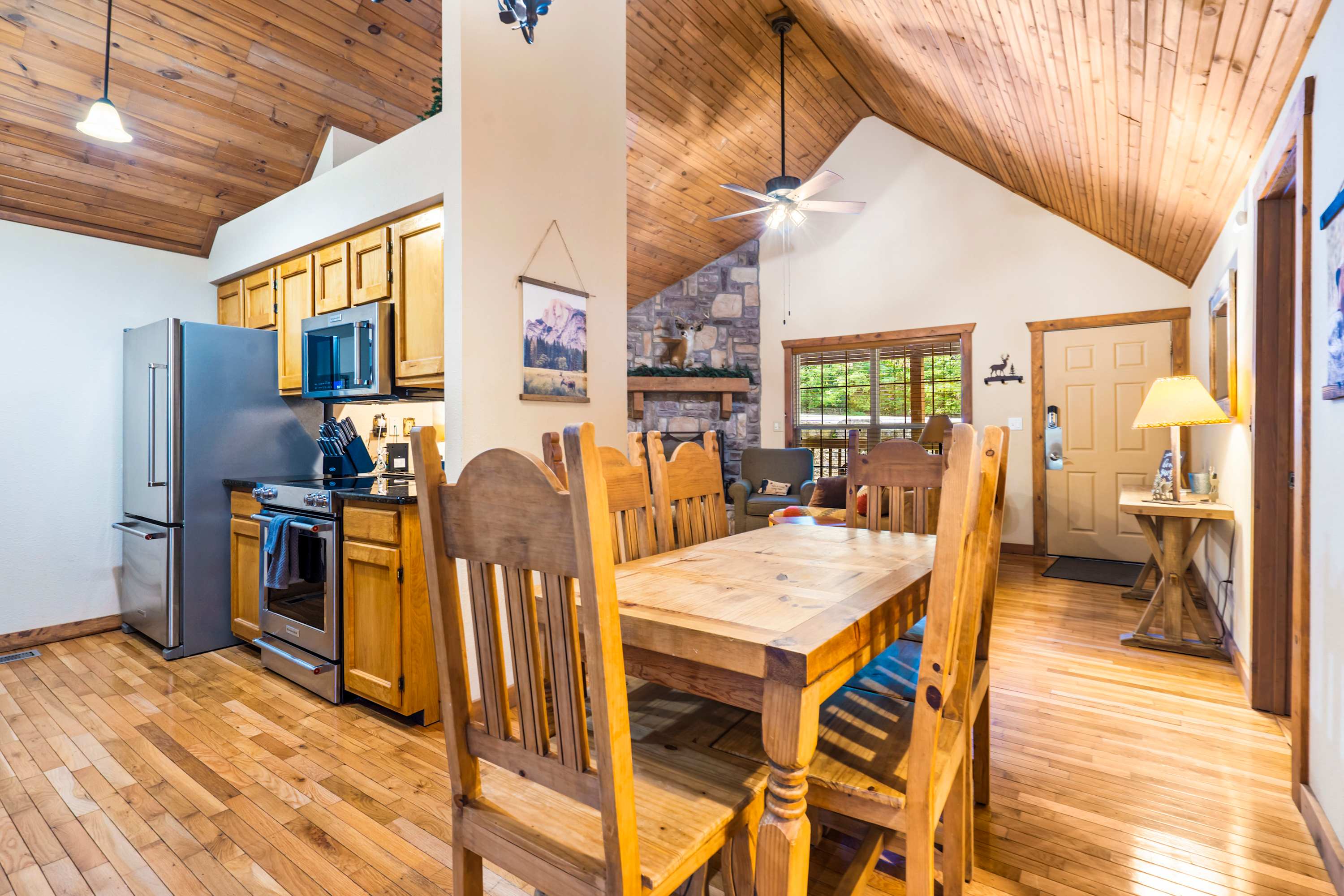 Indoors, the cabin vibes are in full effect from the soaring, wood-paneled ceilings to the rustic-chic décor and furnishings. Relax in the spacious living room offering plush sofa and armchair seating along with a smart TV for streaming episodes of all your favorite shows. The fireplace will keep you warm and toasty during the cooler months, creating the perfect ambiance for an immersive movie night. Steps away, the well-equipped kitchen showcases stainless steel appliances, glossy stone countertops, and ample cabinetry stocked with cookware and dining ware. Snag a high-top stool at the counter for 3 to nosh on a spread of afternoon appetizers or gather more formally at the table with seating for 6. The screened-in patio offers a serene spot for soaking up the fresh air and pine-lined vistas whether dining al fresco or enjoying a quiet moment with your morning coffee or an evening cocktail.