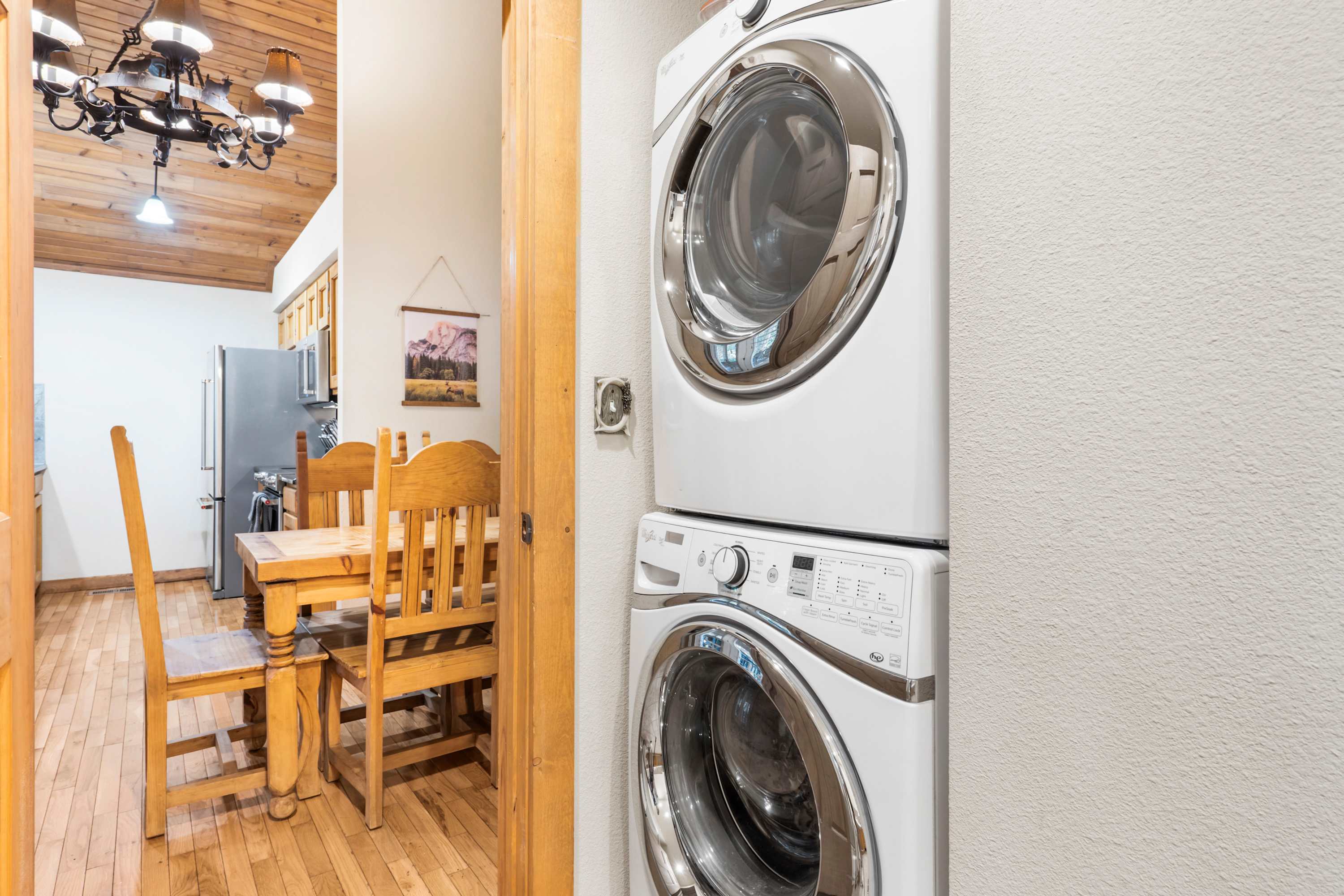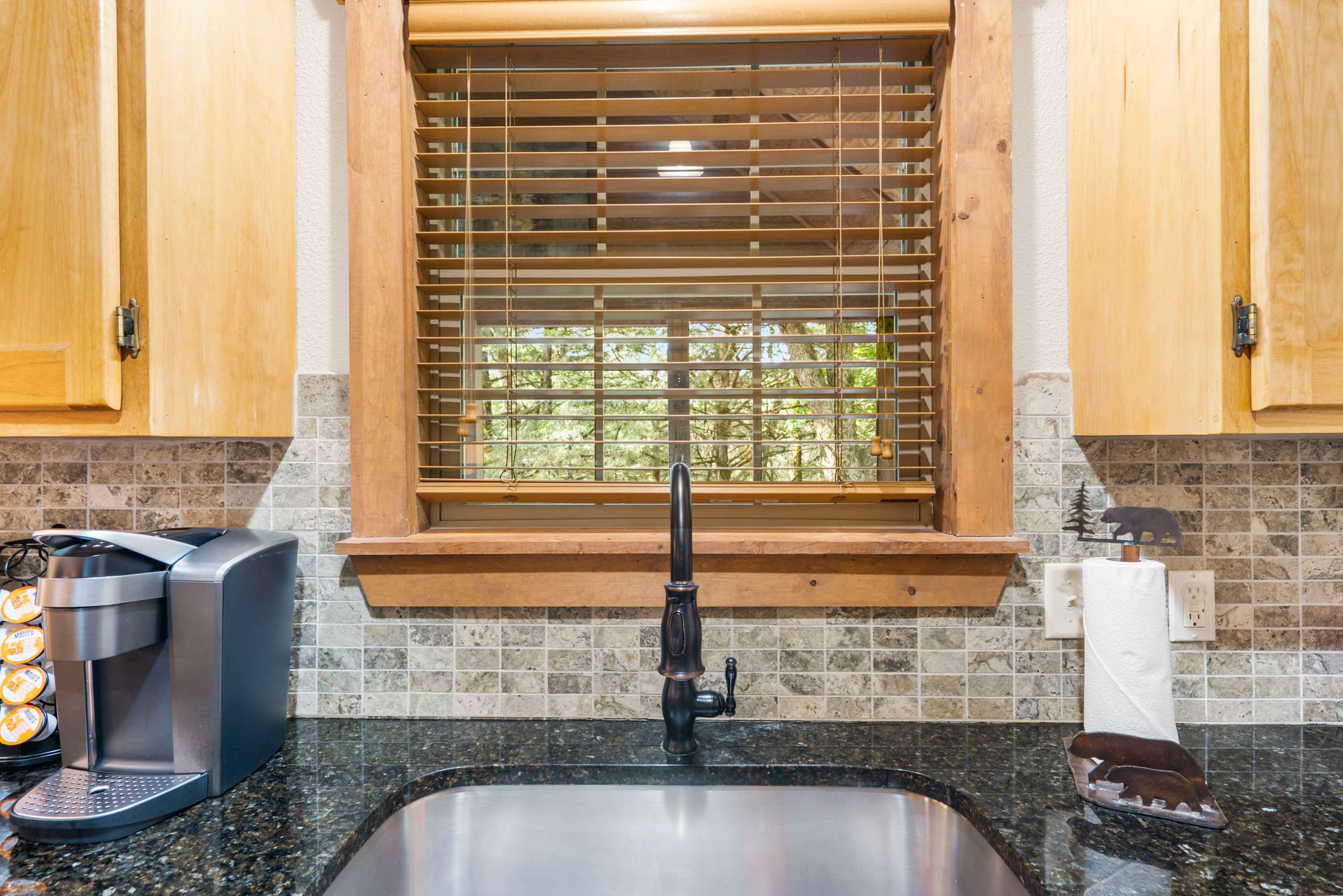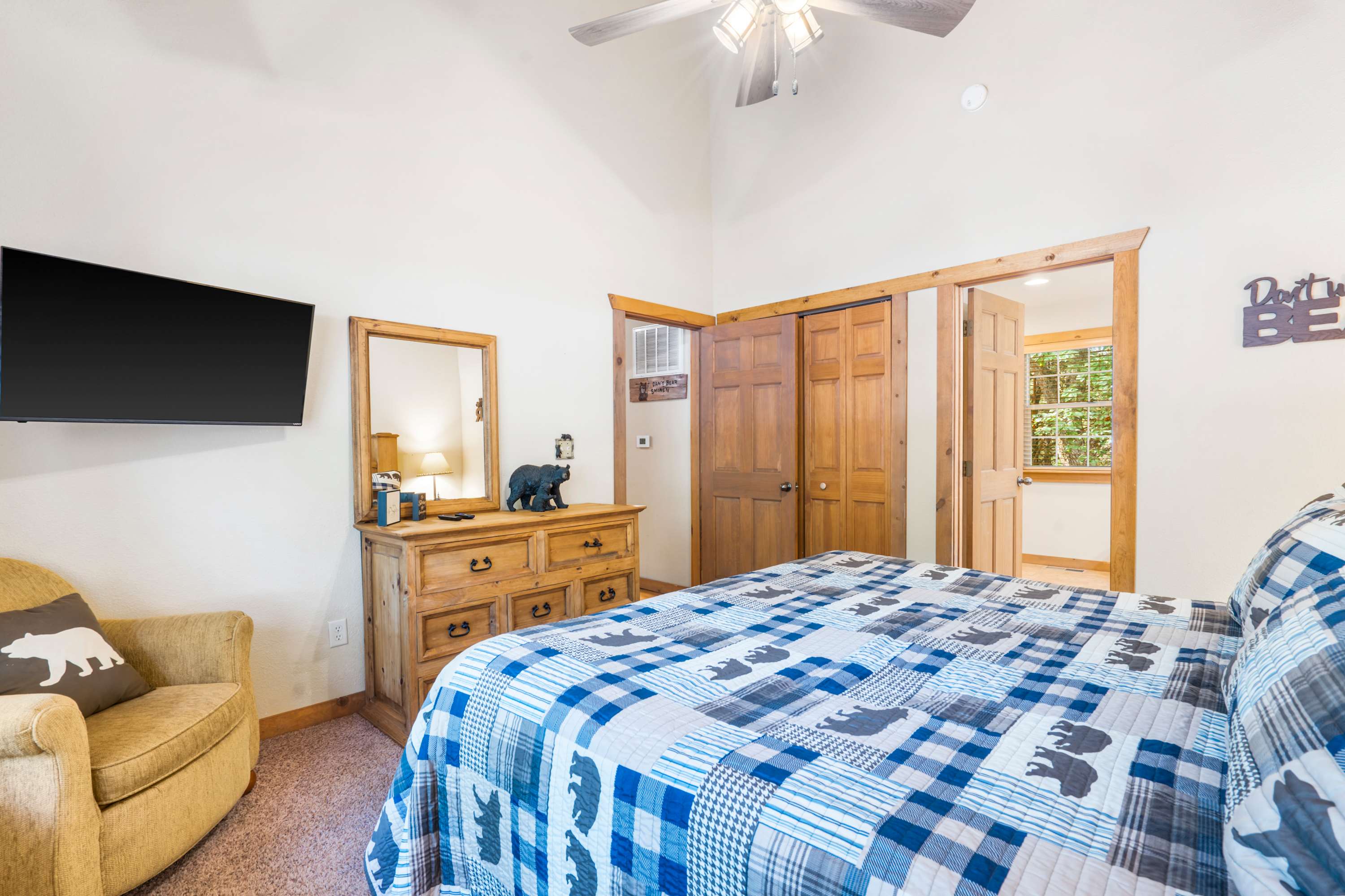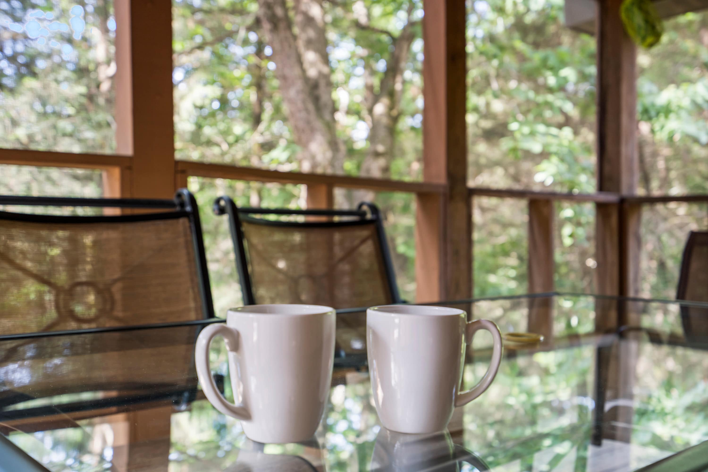 Indoors, the cabin vibes are in full effect from the soaring, wood-paneled ceilings to the rustic-chic décor and furnishings. Relax in the spacious living room offering plush sofa and armchair seating along with a smart TV for streaming episodes of all your favorite shows. The fireplace will keep you warm and toasty during the cooler months, creating the perfect ambiance for an immersive movie night. Steps away, the well-equipped kitchen showcases stainless steel appliances, glossy stone countertops, and ample cabinetry stocked with cookware and dining ware. Snag a high-top stool at the counter for 3 to nosh on a spread of afternoon appetizers or gather more formally at the table with seating for 6. The screened-in patio offers a serene spot for soaking up the fresh air and pine-lined vistas whether dining al fresco or enjoying a quiet moment with your morning coffee or an evening cocktail.
