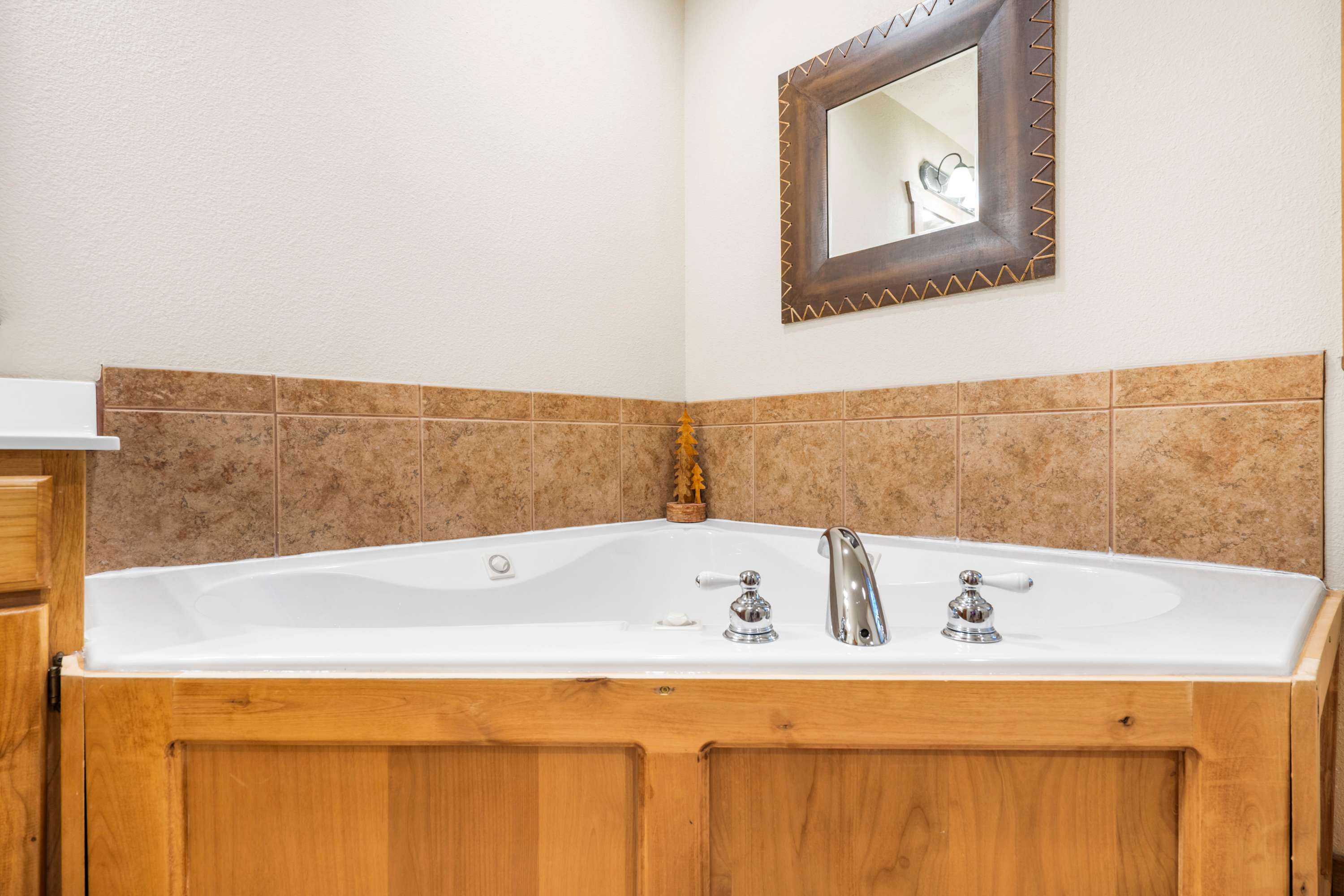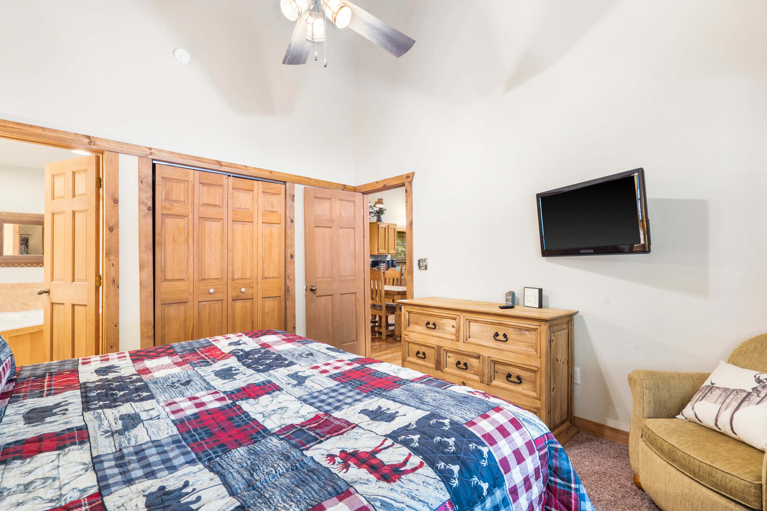 Bedroom #1 includes a king size bed, smart TV, and ensuite bathroom with a single vanity, soaking tub, and walk-in shower.