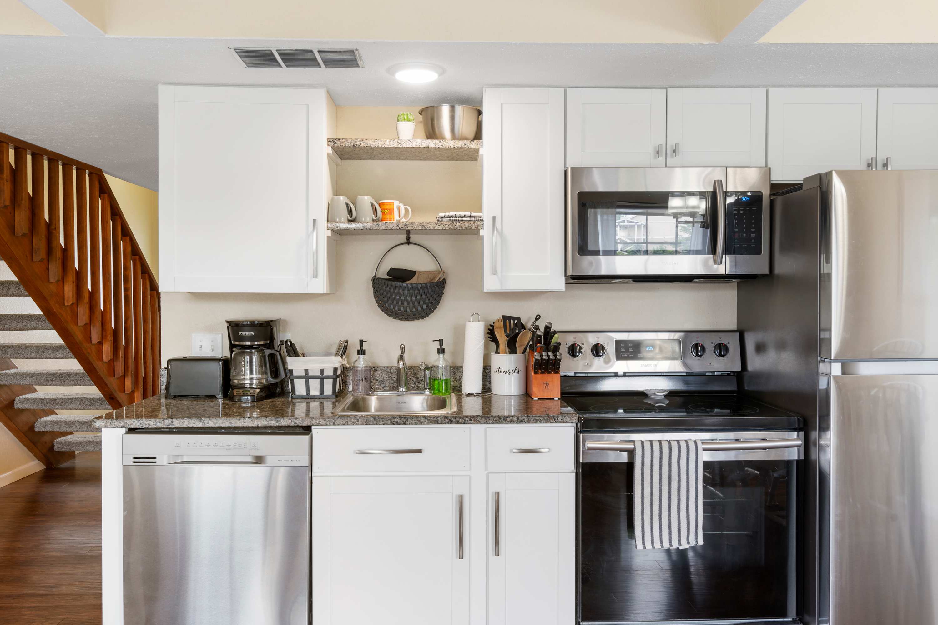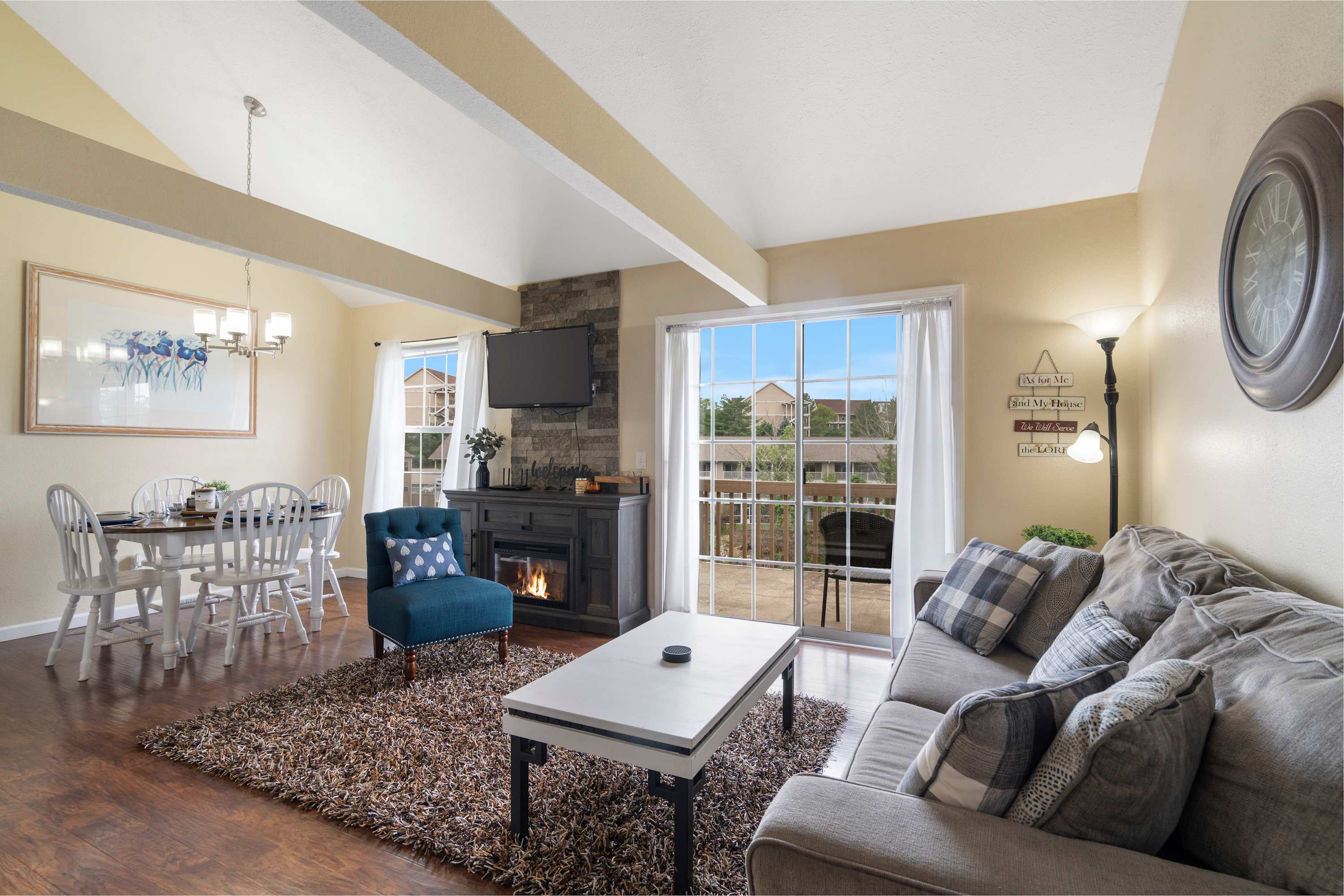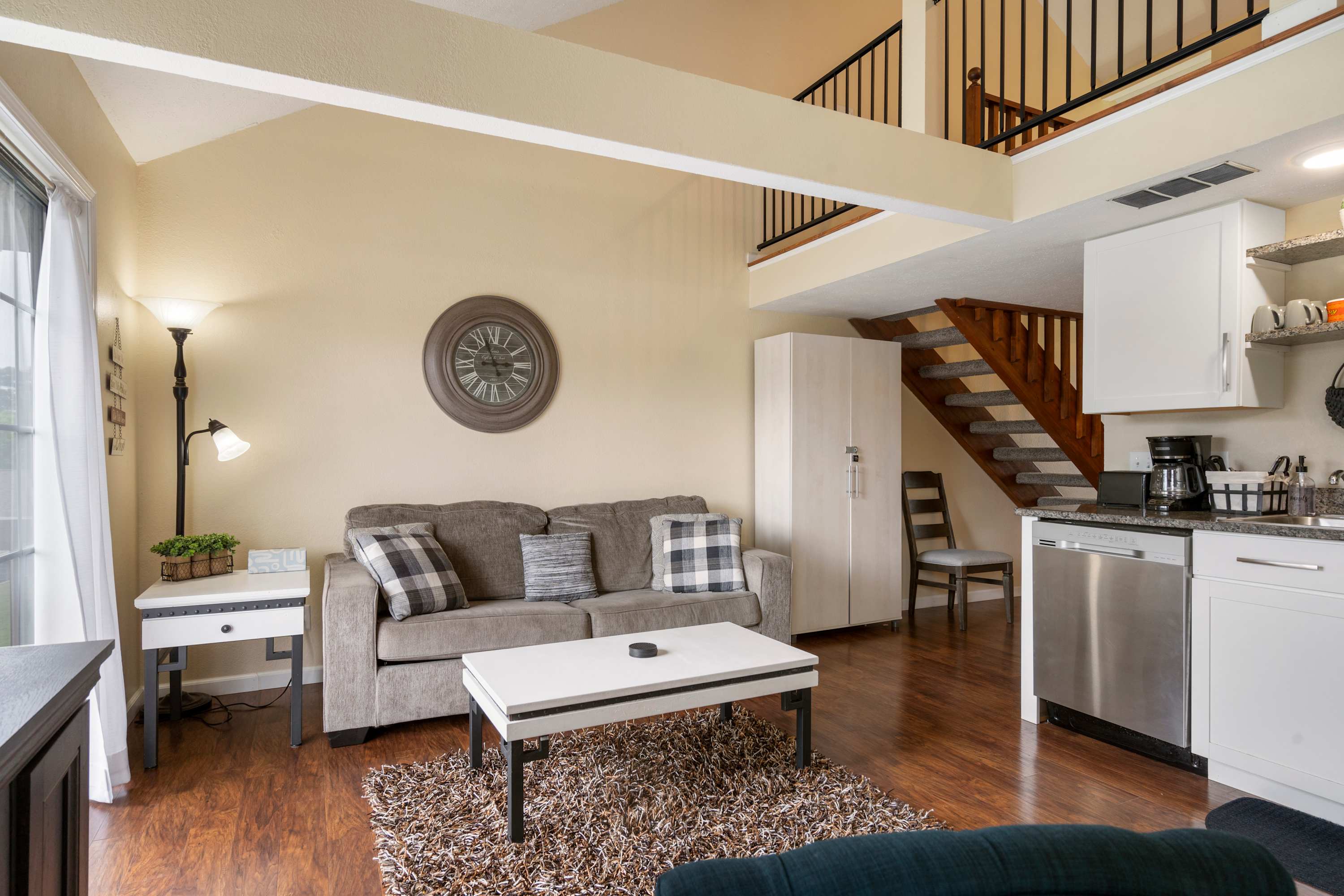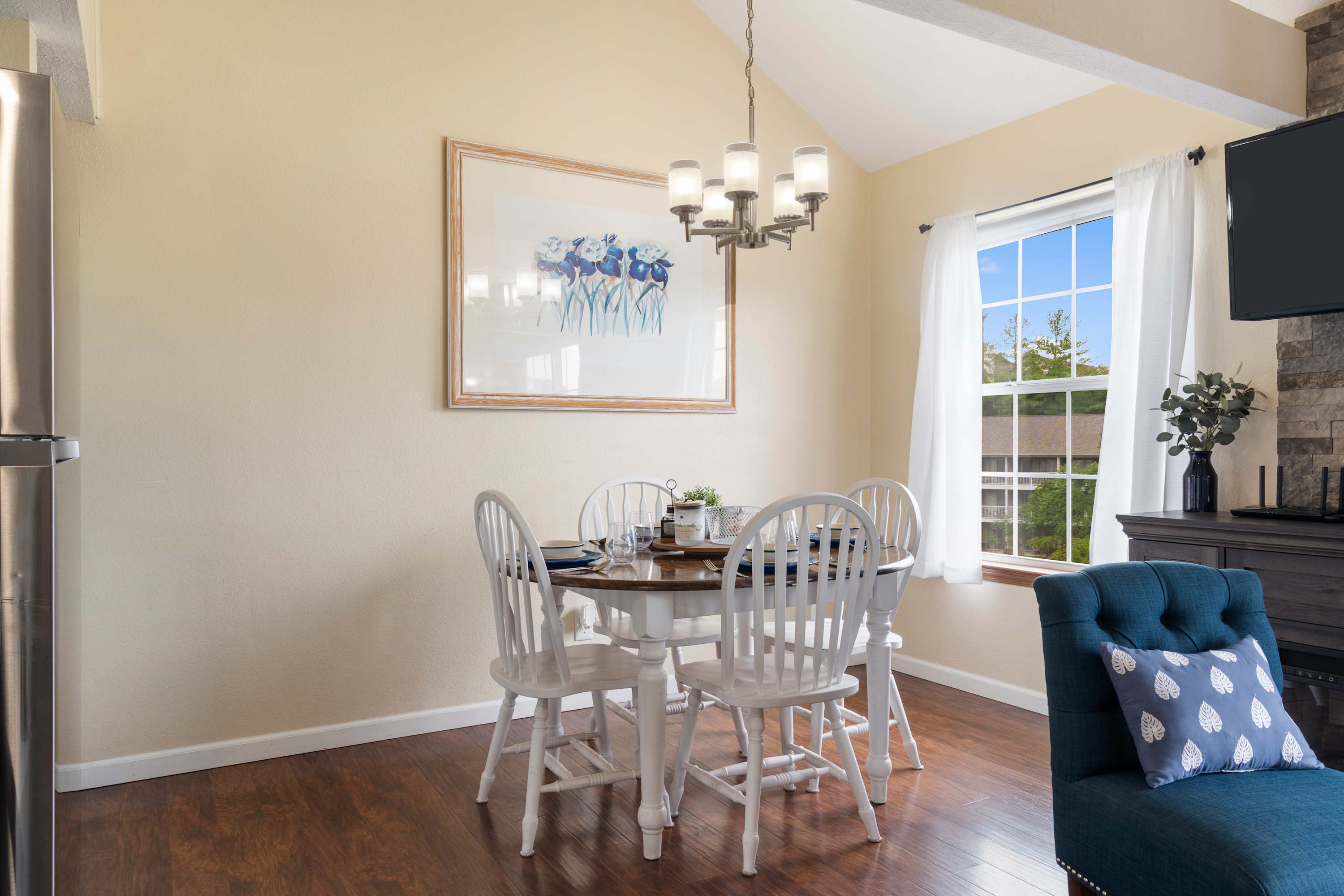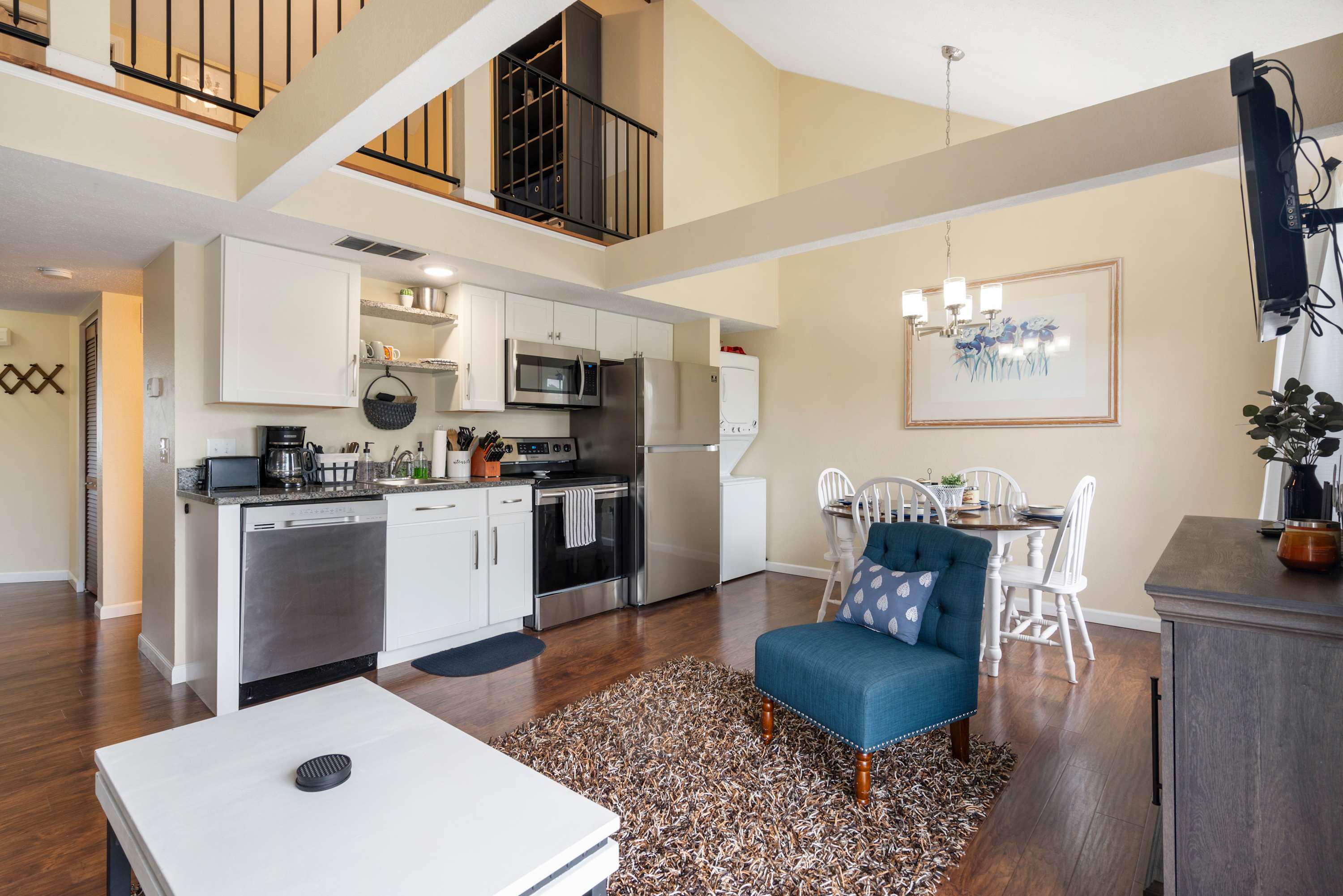 Indoors, soaring ceilings sit atop open, sophisticated spaces illuminated in natural light, curated with comfortable furnishings and chic décor. During your well-earned downtime, sink into plush sofa seating in the living room while you stream episodes of all your favorite shows on the smart TV. The fireplace will keep you warm and toasty during the cooler months, setting the stage for an immersive movie night. The efficient, well-equipped kitchen is ready to service all your mealtime aspirations whether whipping up delicious home-cooked meals or staging takeout from a newly discovered local restaurant. Gather together for dining at the table with seating for 4, doubling as a venue for a spontaneous game night. At the start of each morning, grab your freshly brewed cup of coffee and head out to the open-air balcony to soak in the sights and sounds of the tranquil waters below as you plan out the next set of day’s adventures.