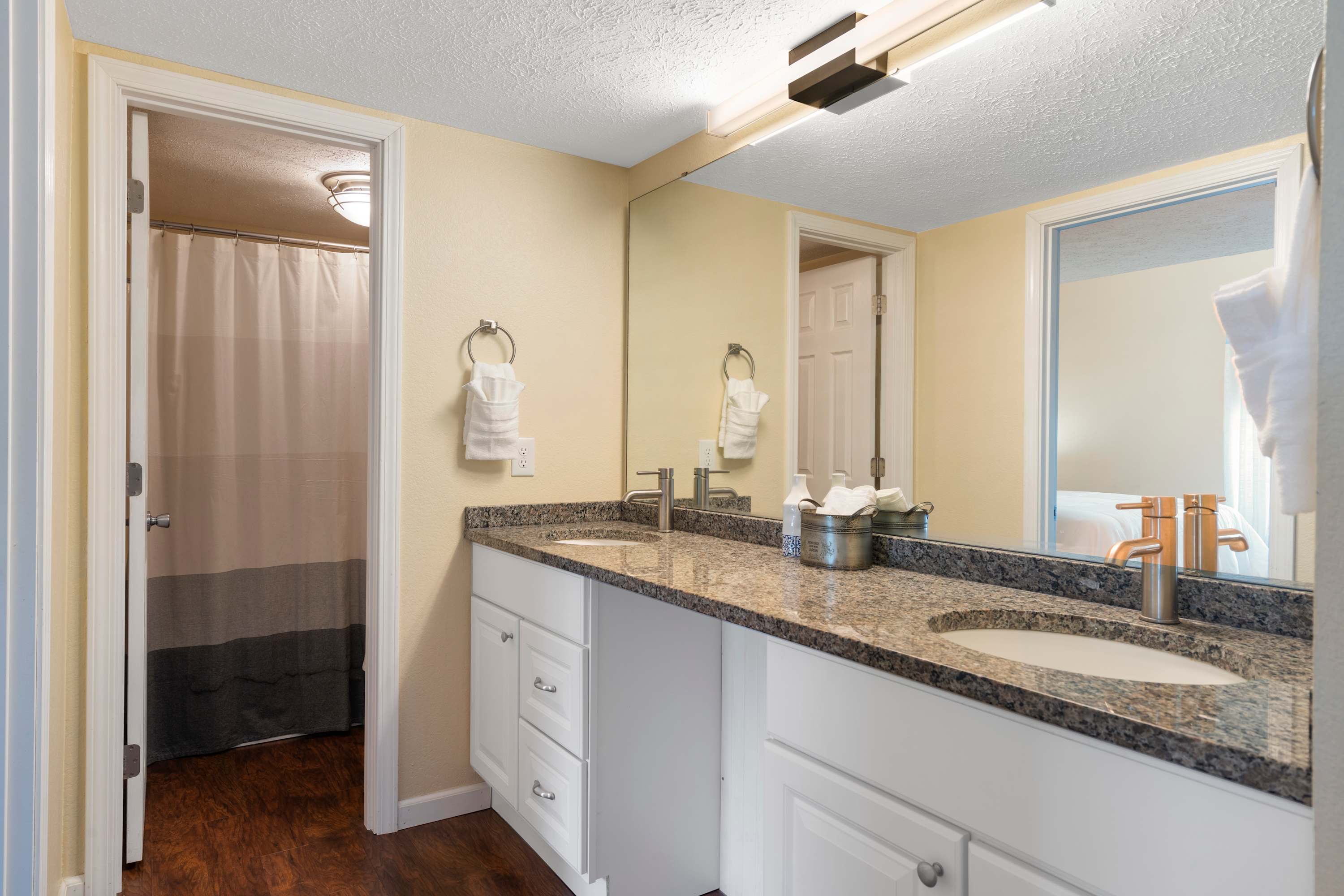 Bedroom #1 includes a queen-size bed, smart TV, and ensuite bathroom with a dual vanity and shower/tub combo.