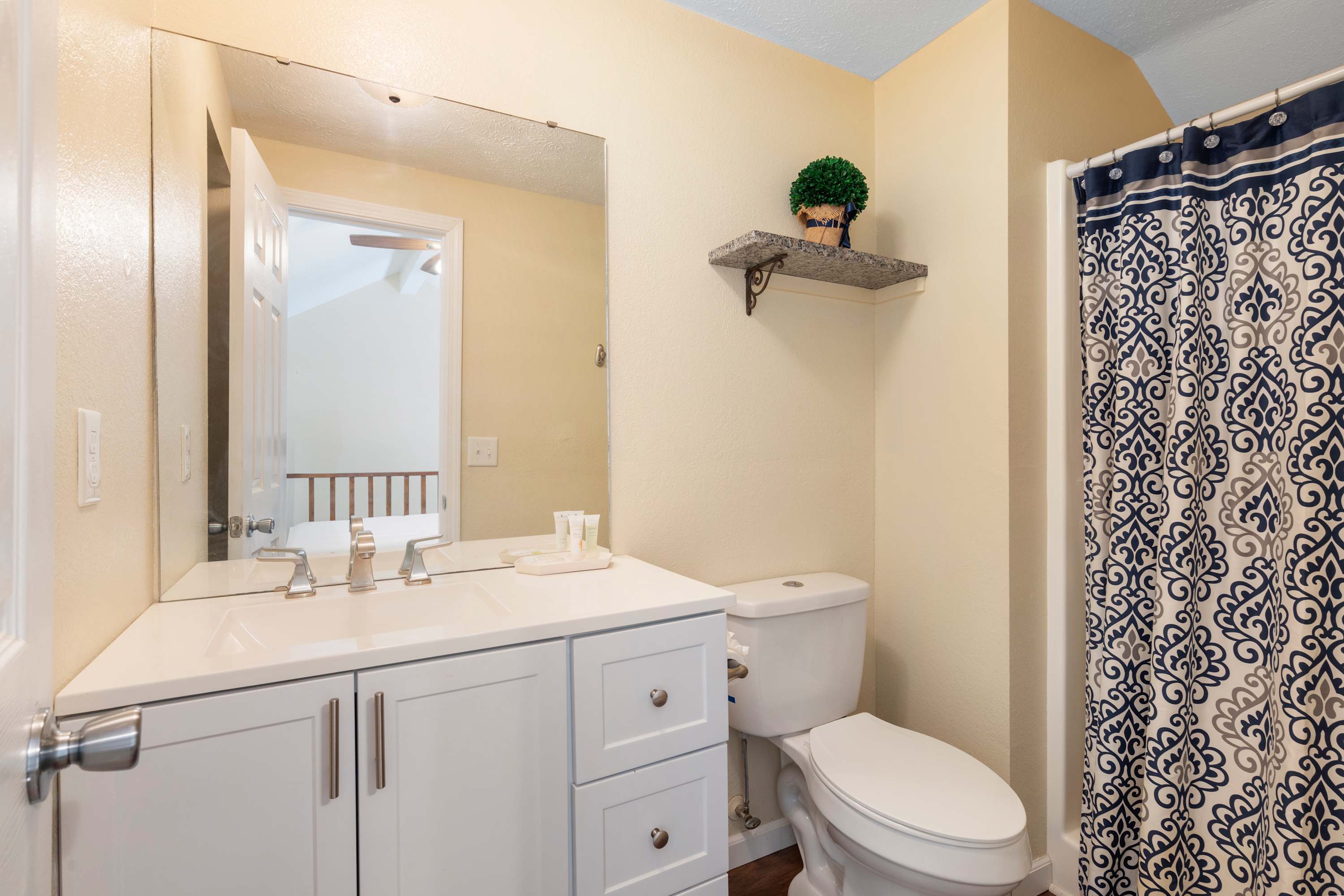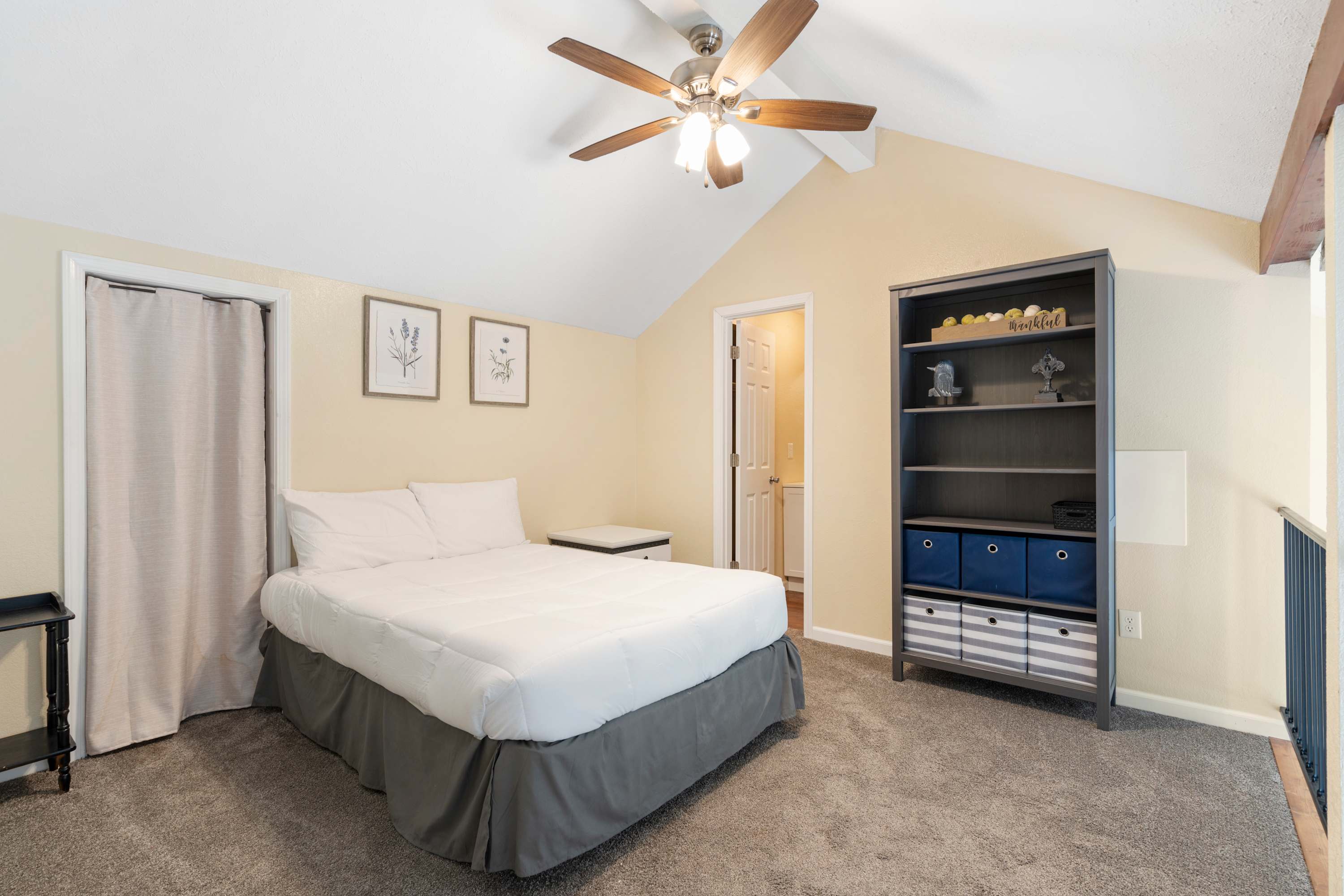 Bedroom #2, located in the loft, includes a full-size bed and ensuite bathroom with a single vanity and walk-in shower.