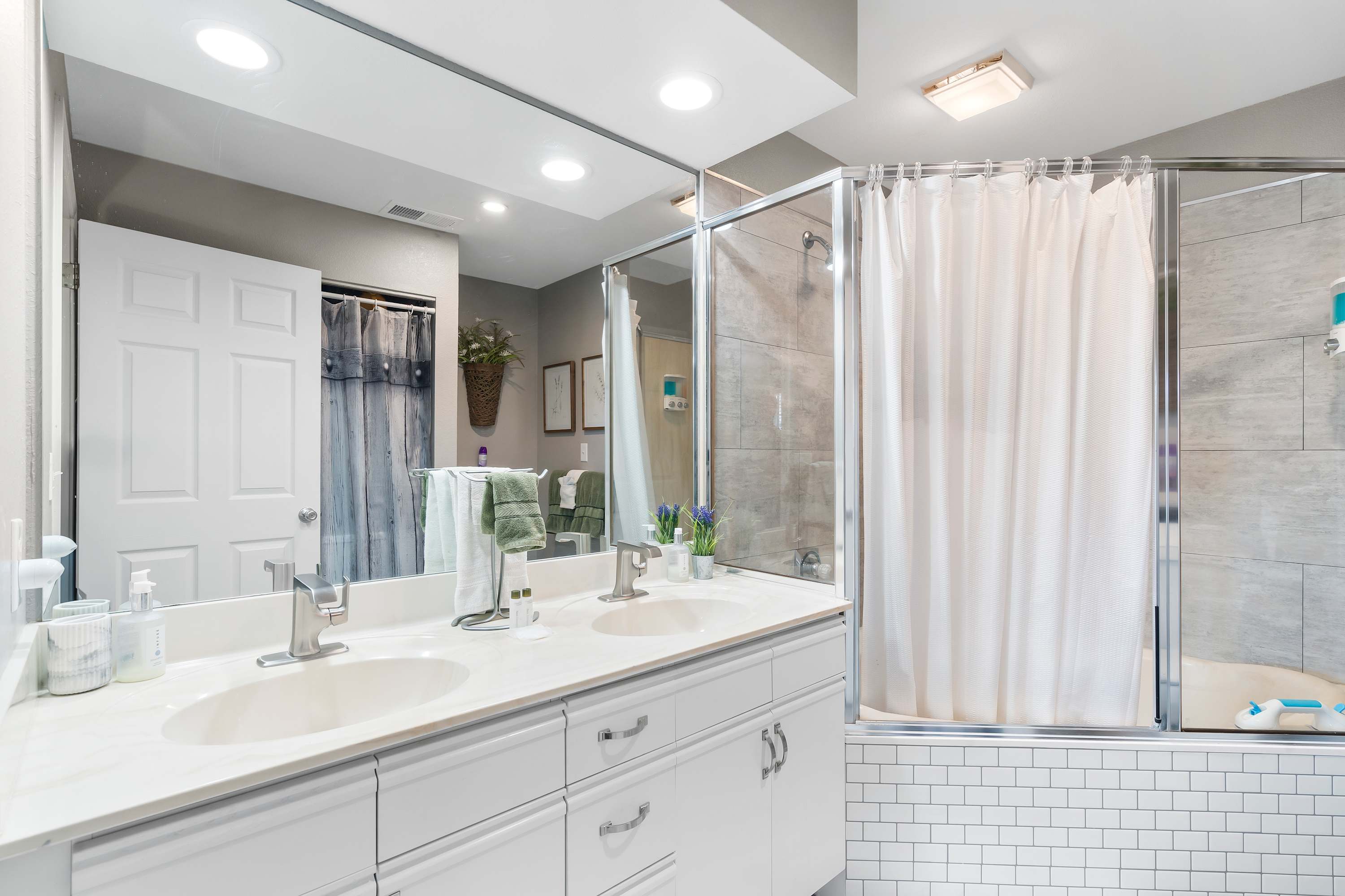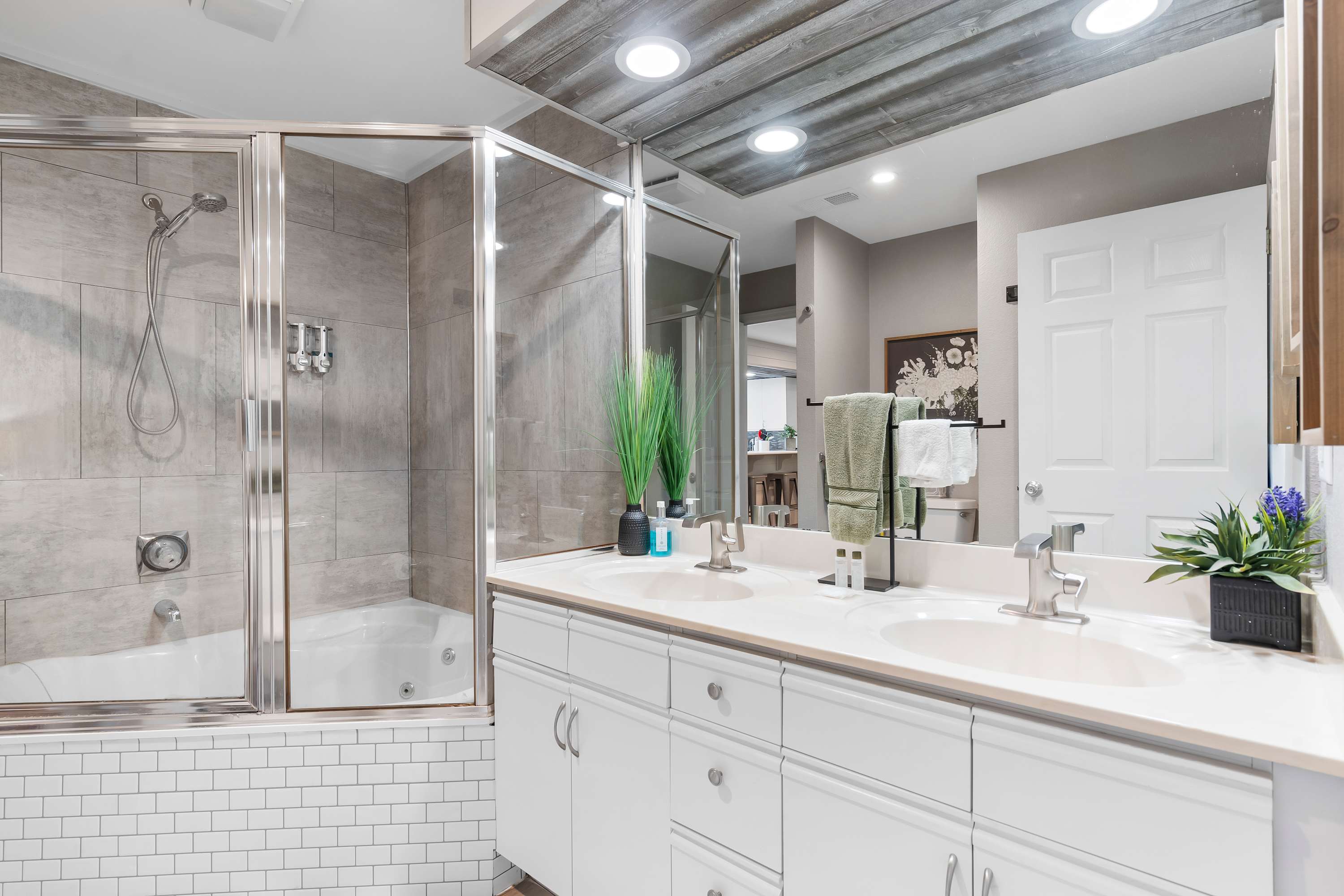 Bedroom #1 includes a king size bed, smart TV, and ensuite bathroom with a dual vanity and shower/soaking tub combo.