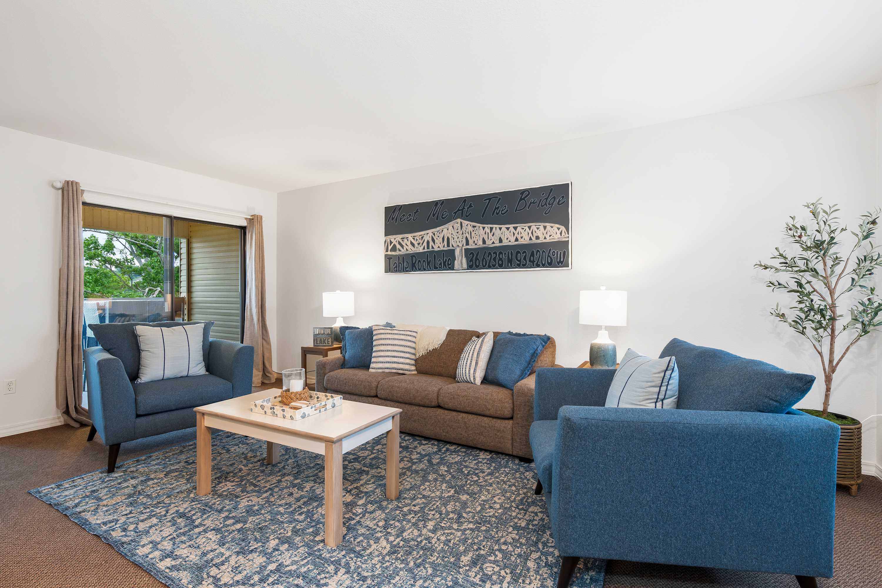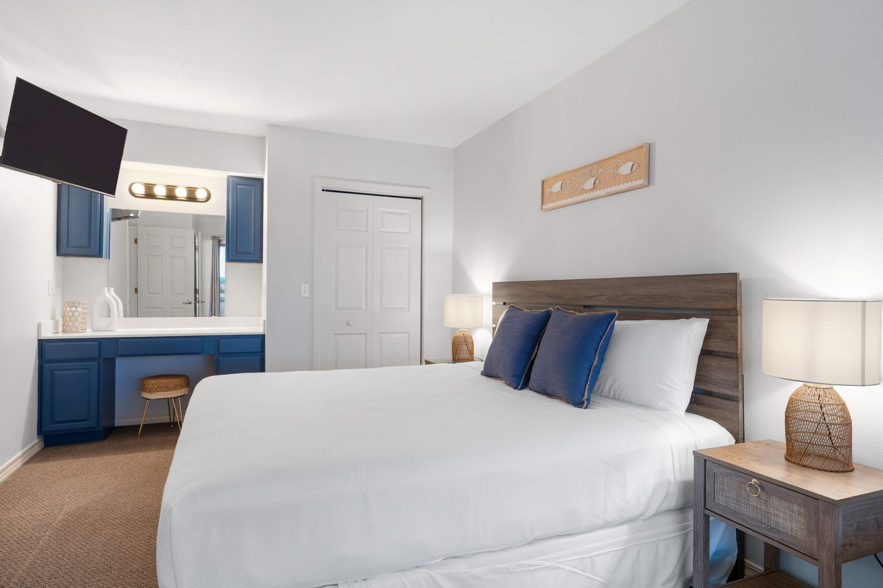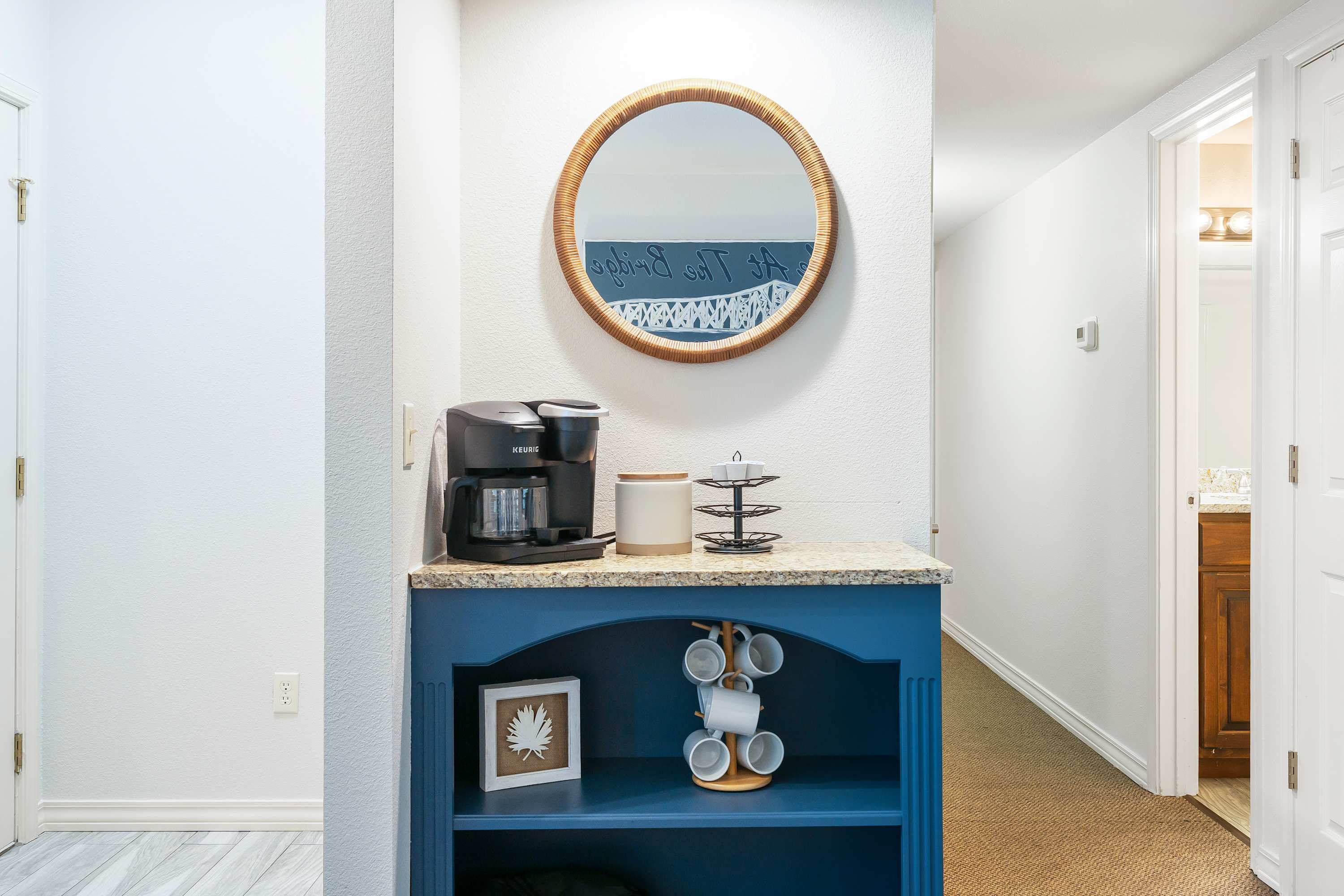 Indoors, serene spaces offer an escape from the hustle and bustle, where soothing cool tones and comfortable furnishings combine to help you relax and recharge. At the end of long days, sink into plush living room sofa and armchair seating while you stream a movie or episodes of your favorite show on the smart TV. The electric fireplace will keep you warm and toasty in the cooler months, offering a cozy ambiance for curling up with a good book. Step out on to the shaded balcony where a high-top table can seat 6 for meals al fresco, keep you fully immersed in the picturesque surroundings. Back indoors, the fully equipped kitchen offers all-black appliances, granite countertops, and ample cabinetry stocked with cookware and dining ware for preparing meals both large and small. The dining table seats 4 for light breakfasts, formal meals, and family game nights alike. In the quiet morning hours, find your way onto the second balcony complete with comfortable outdoor seating to sip on your fresh cup of coffee as you plan out the next set of adventures.