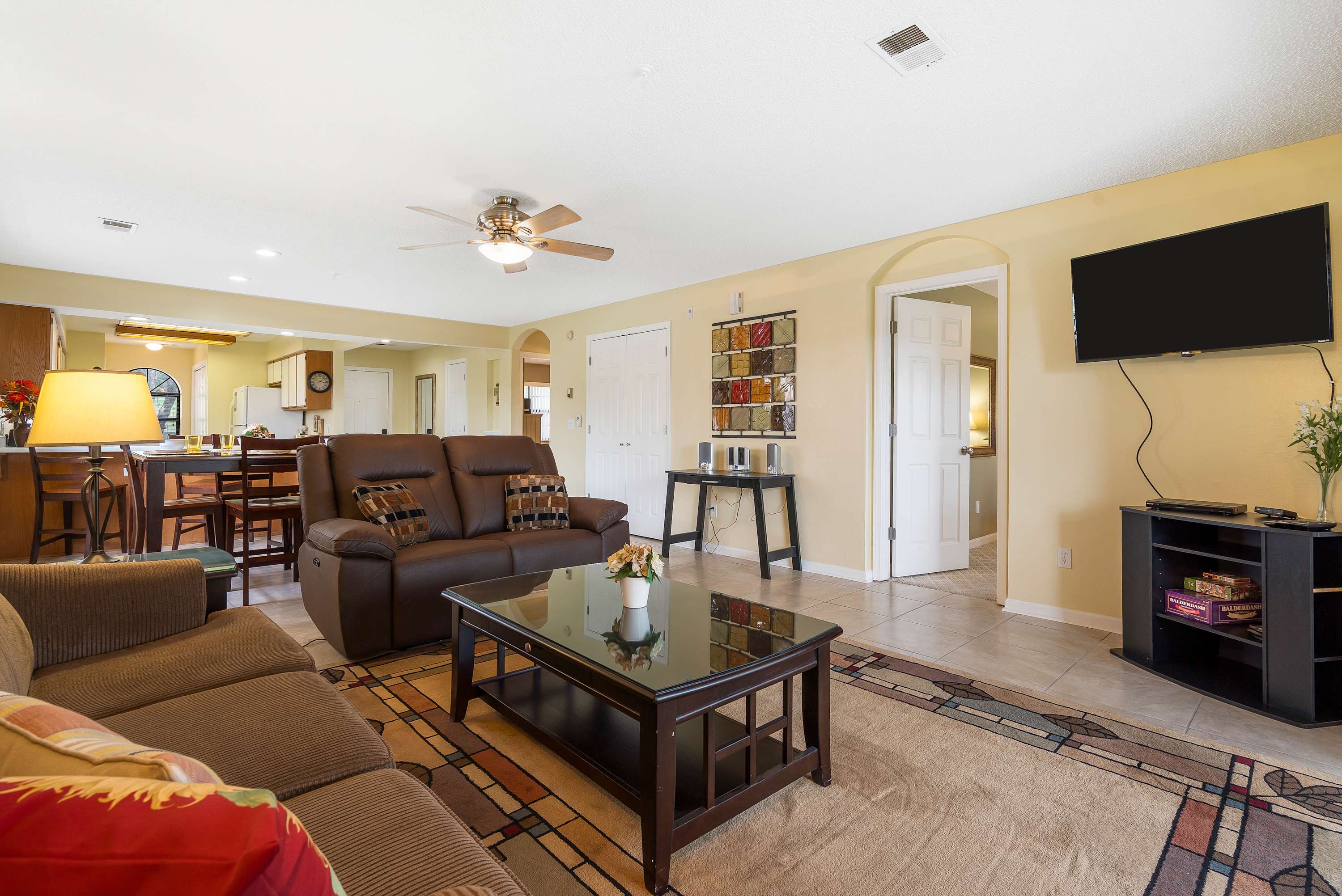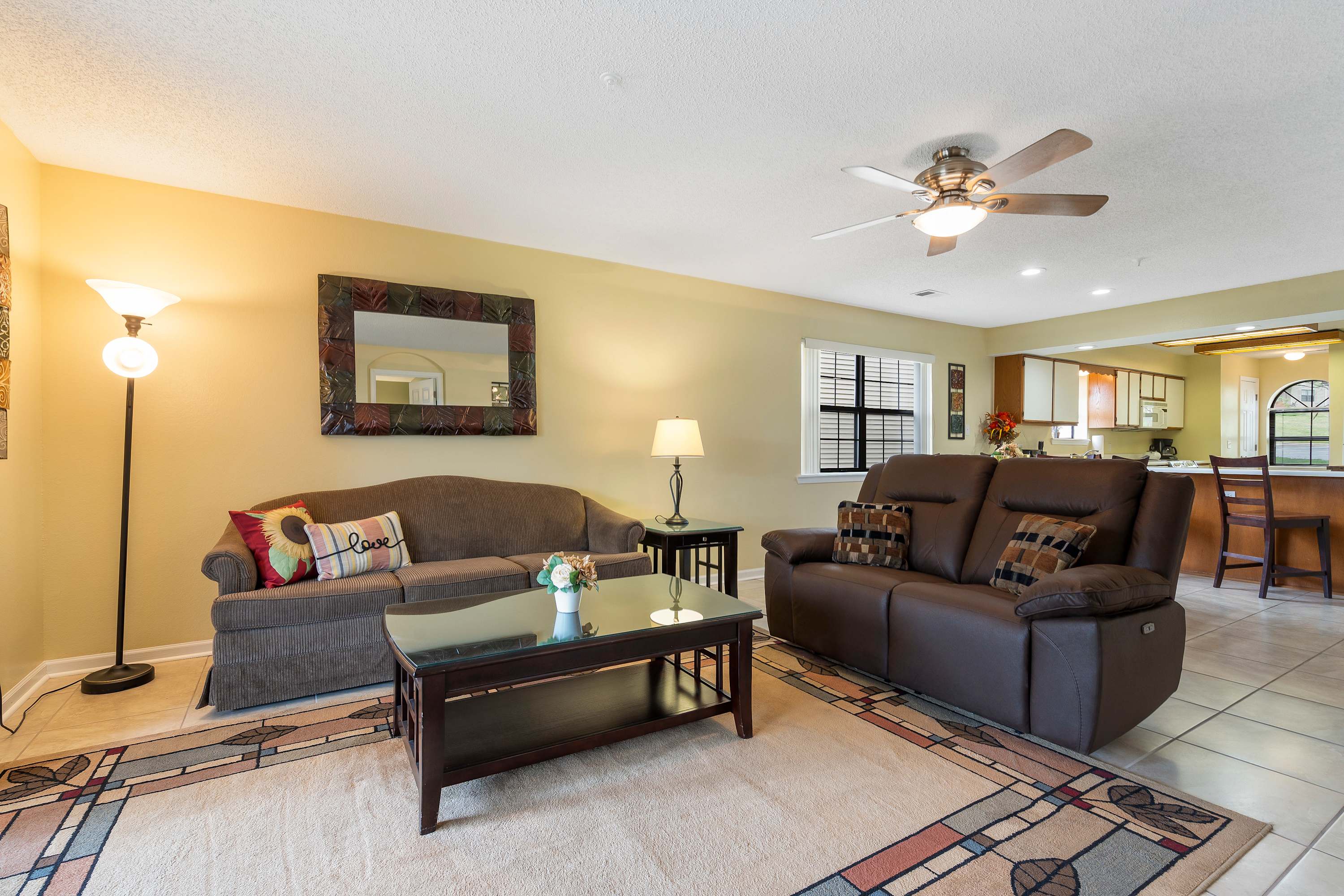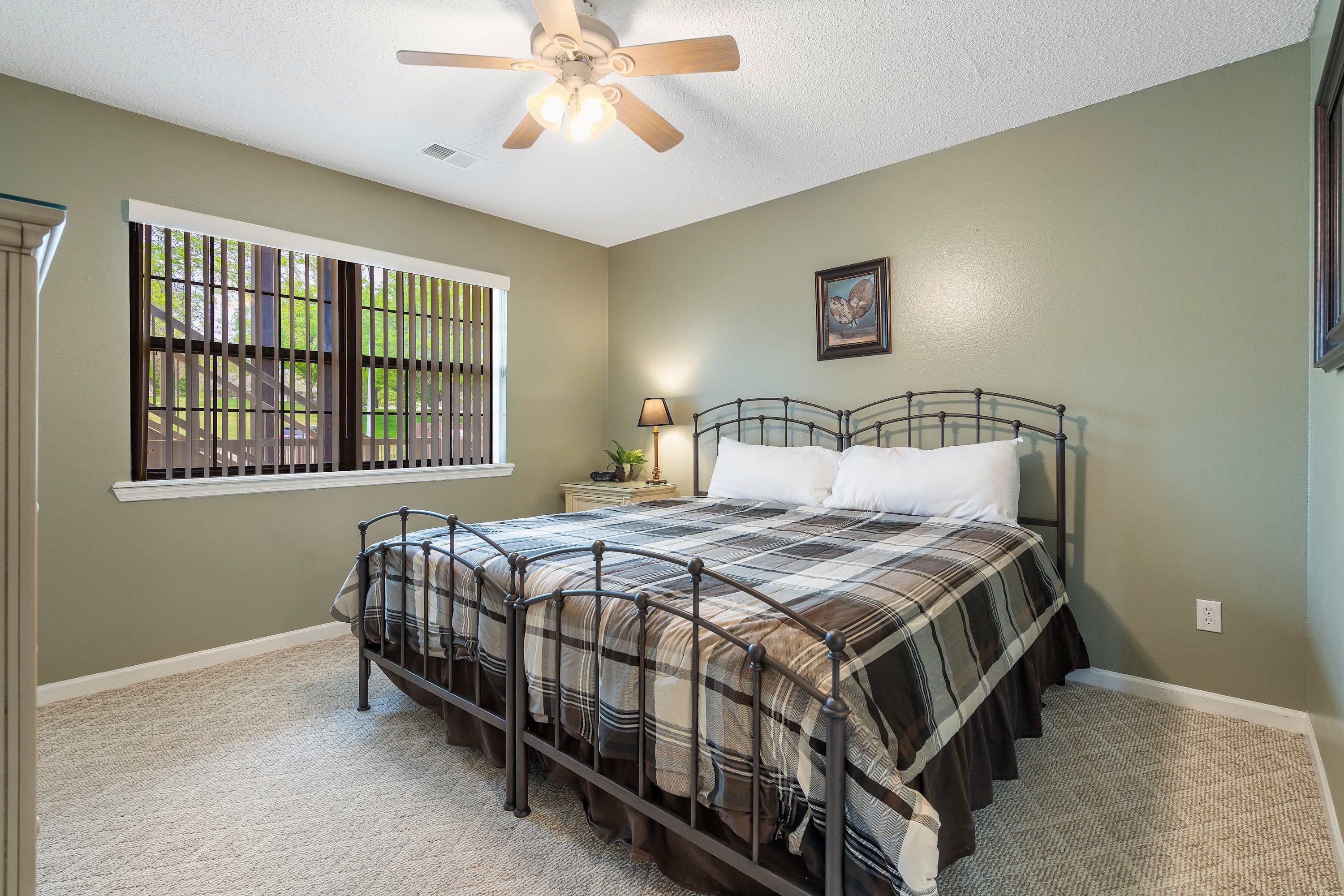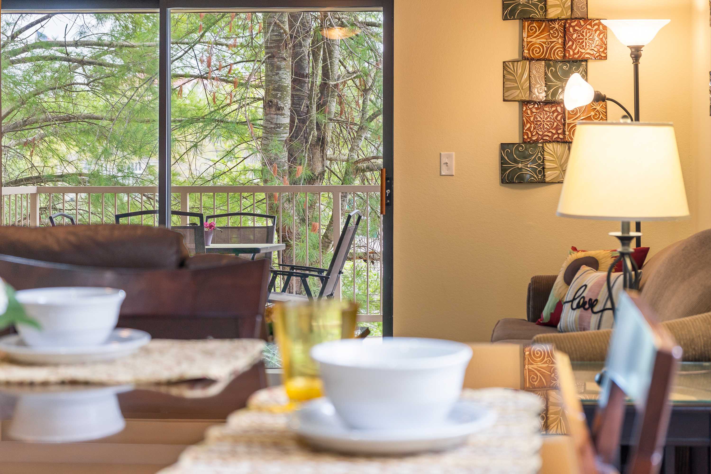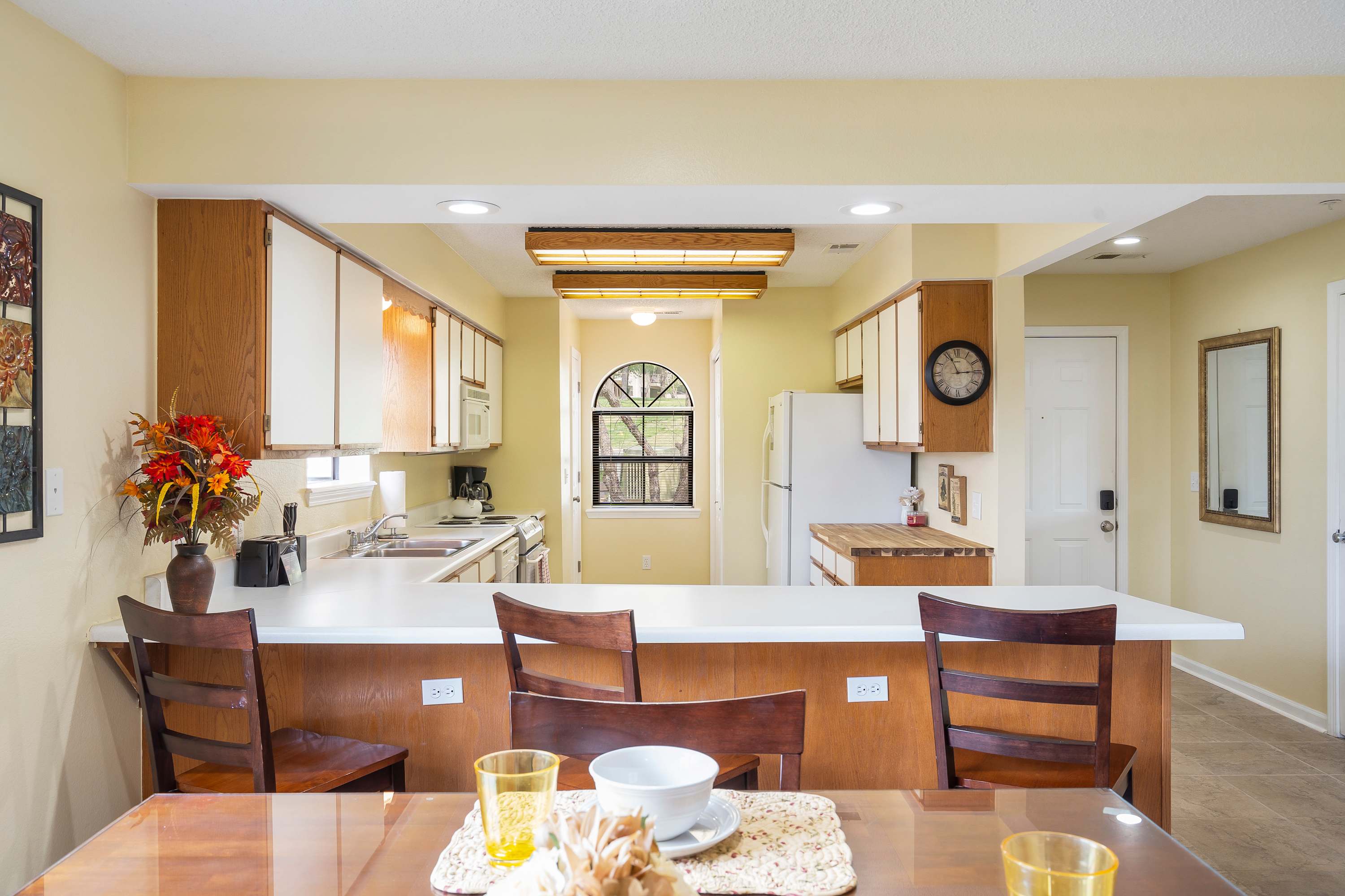 The home’s stately interior is a welcome retreat from the hustle and bustle of daily activities in and around the area, curated with comfortable furnishings and chic décor to maximize your experience. Sink into the plush living room sofa or loveseat while you queue up that new movie you’ve been saving on the mounted smart TV. You’ll have the option to blend indoor and outdoor living together by opening the sliding door onto the shaded balcony where you’ll be treated with that fresh Ozark air and an al fresco dining set for 4 with scenic views of the community. Back inside, make your way to the kitchen, fully stocked with everything you need to whip up delicious meals in the convenience of home. Sit down for formal meals at the high-top table with seating for 4 or grab a stool at the counter for overflow or a more casual dining option.