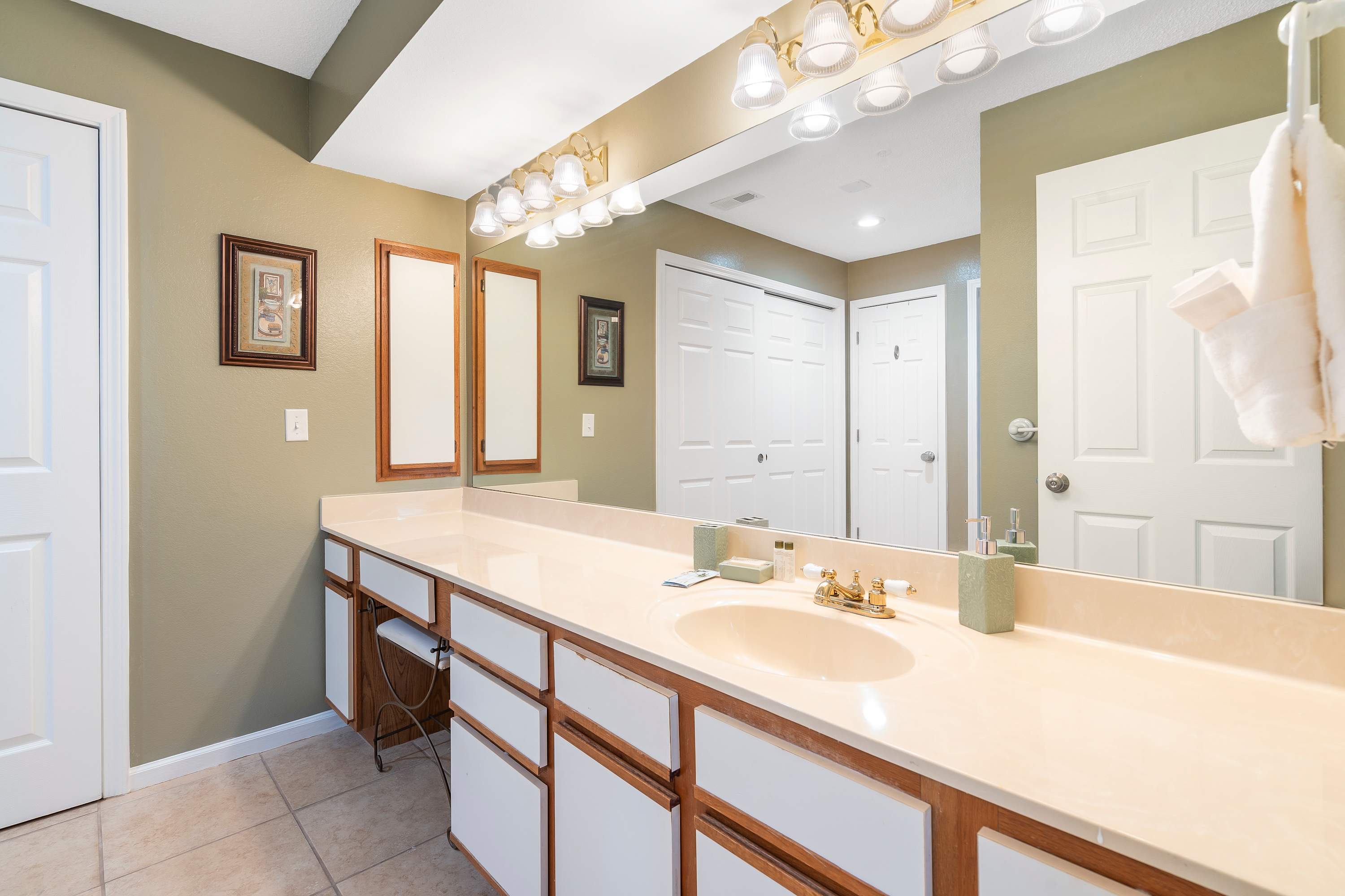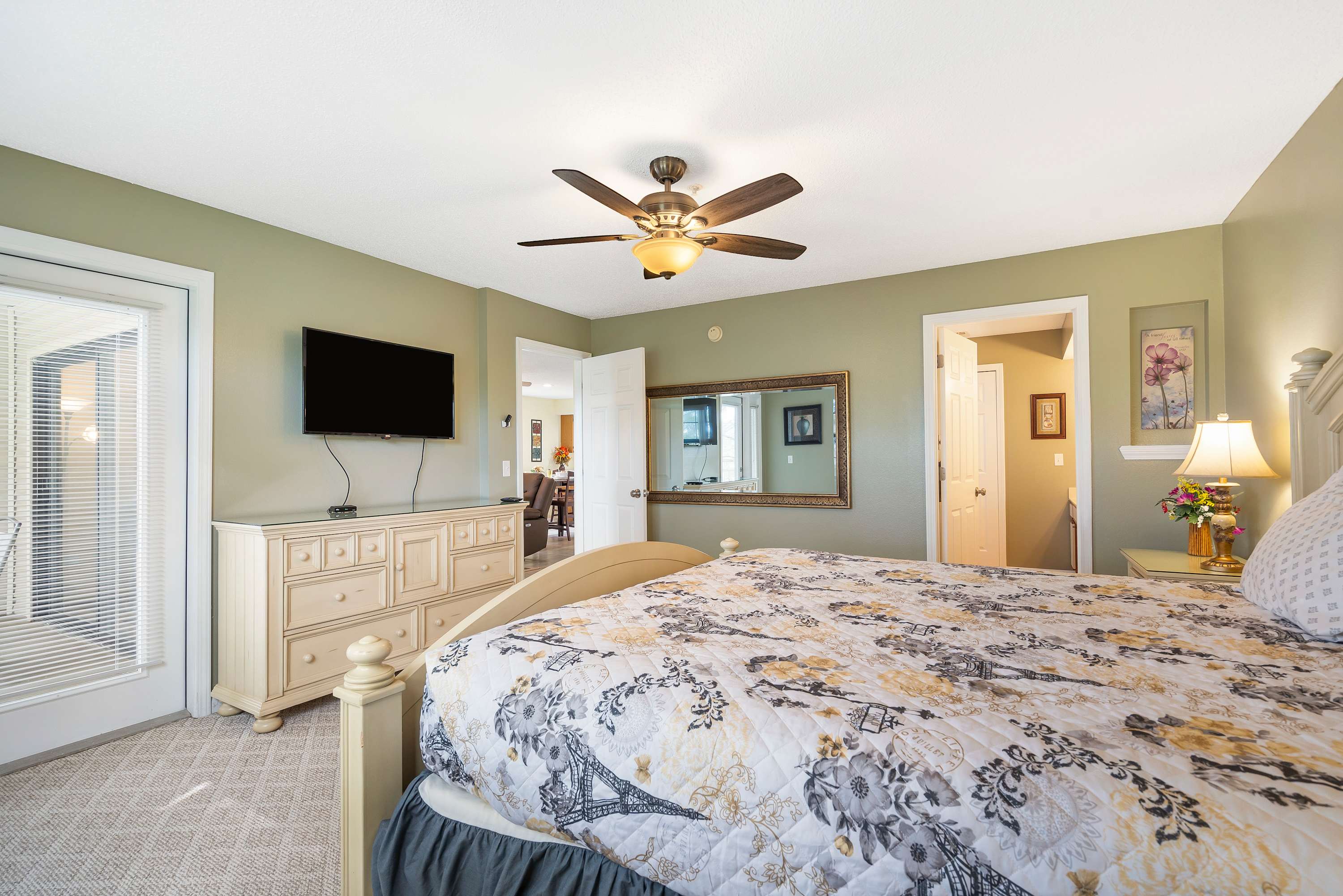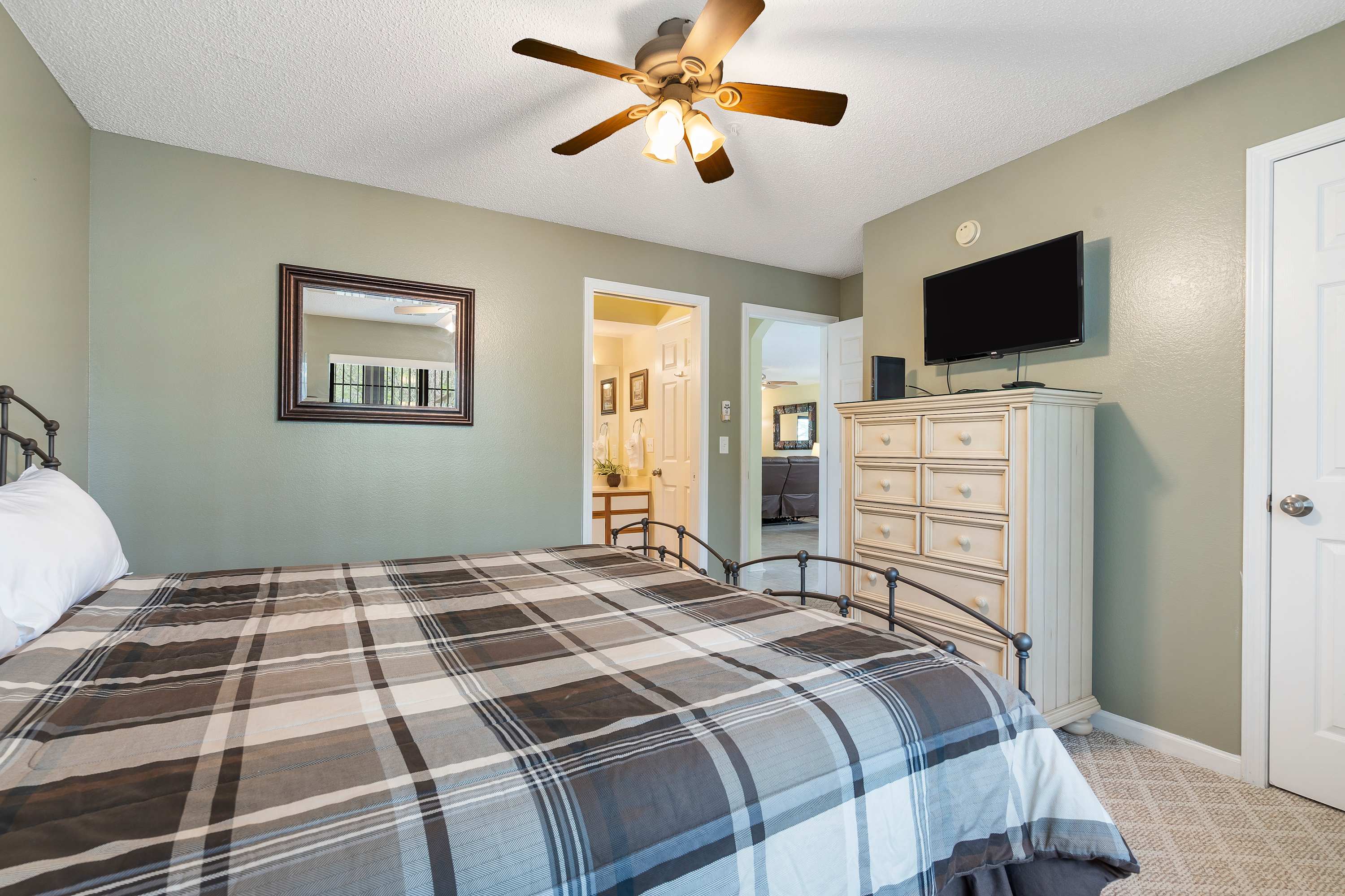 Bedroom #1 includes a king size bed, smart TV, and ensuite bathroom with an oversized single vanity and shower/tub combo.