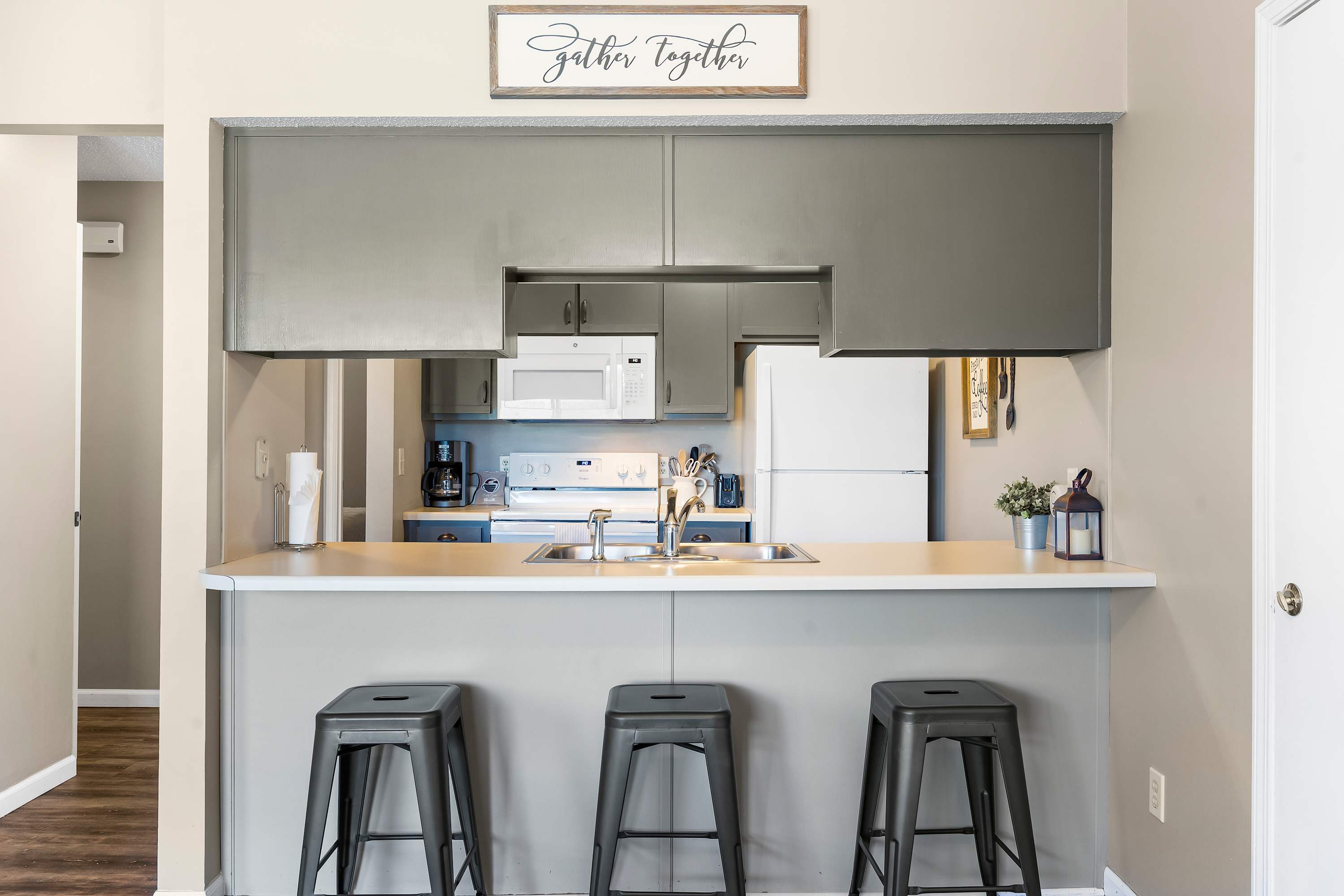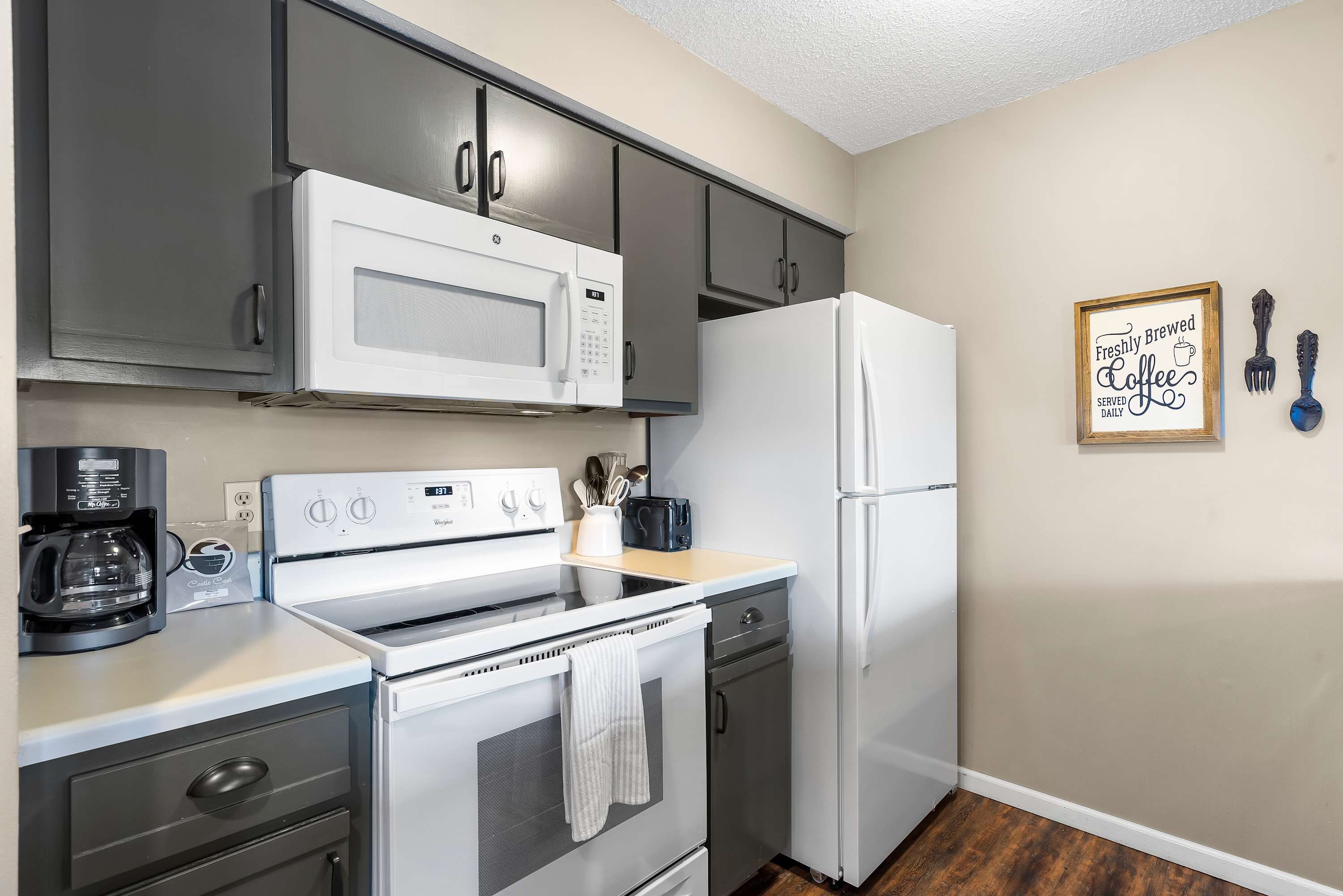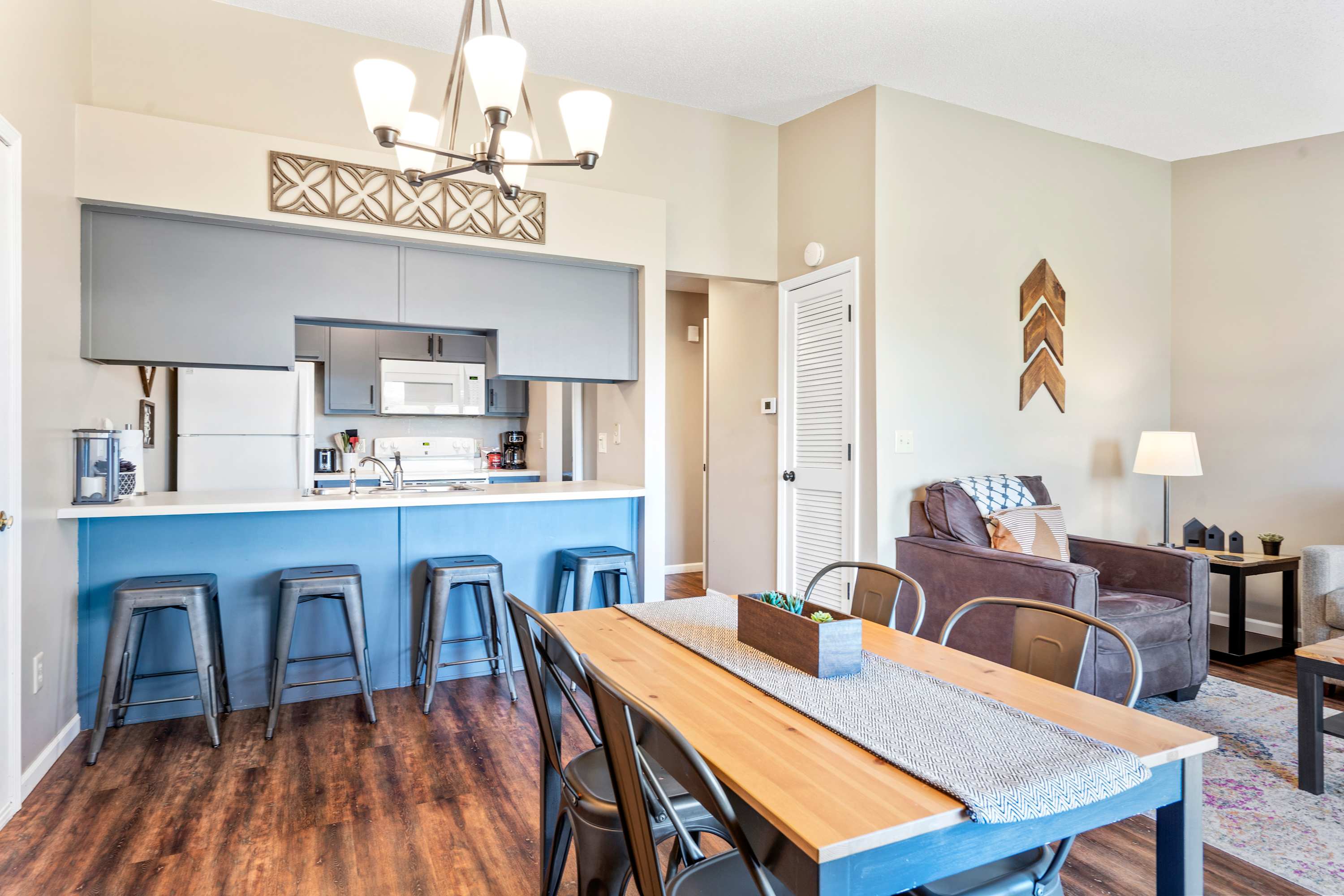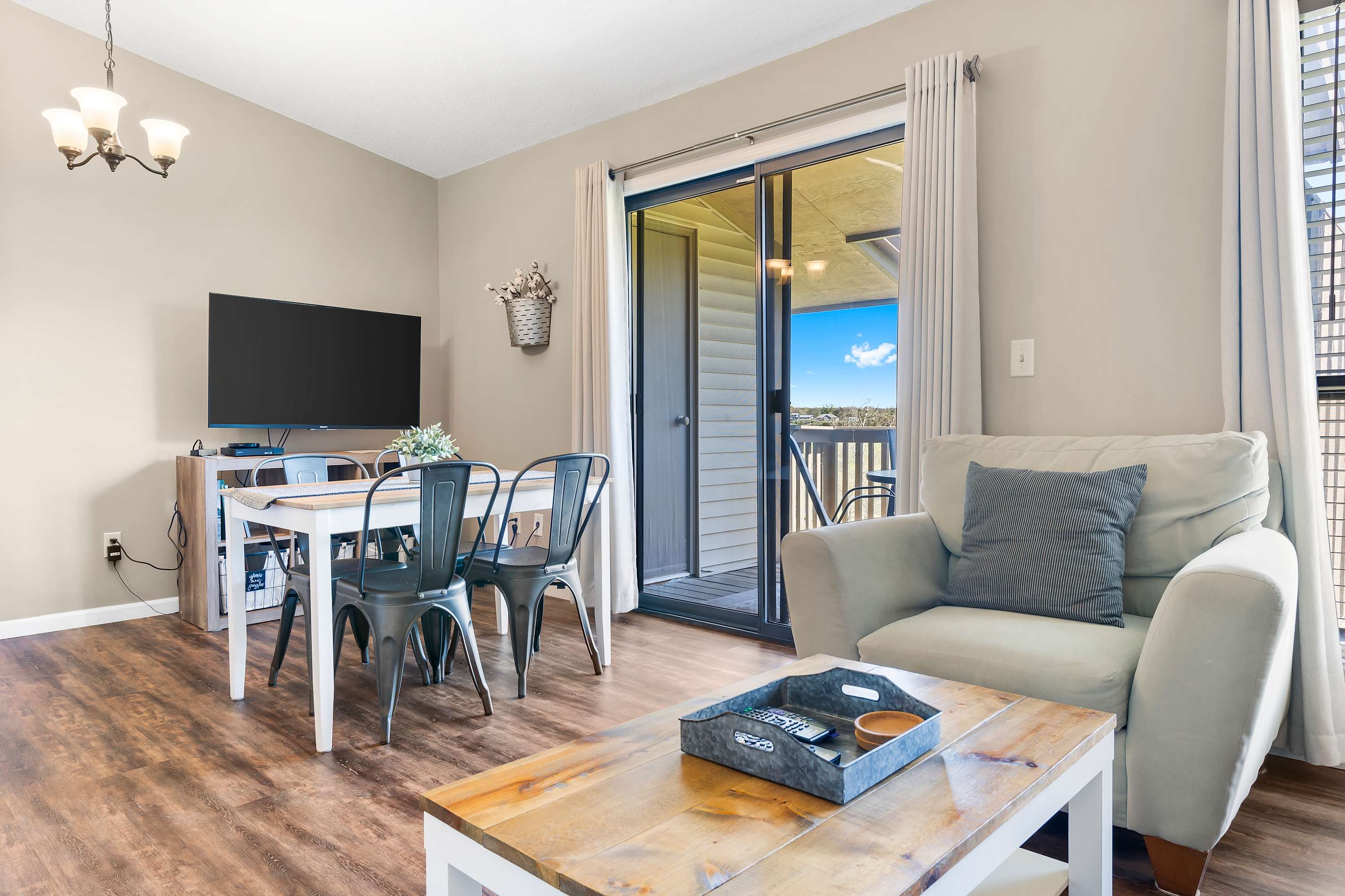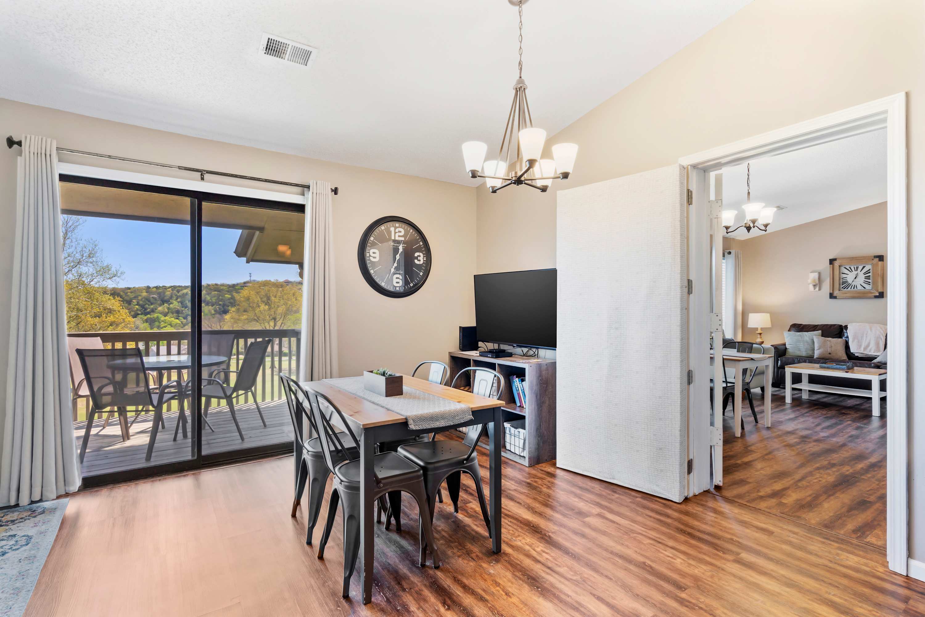 Each home features open spaces filled with abundant natural light, comfortable furnishings, and sophisticated décor. Plush living room sofas and armchairs will help you ease into relaxation mode while you flip through the channels or queue up a movie on the TV. Well-equipped kitchens include all the comforts from home, featuring all-white appliances and ample counterspace and cabinetry for food preparation and storage. You’ll have your choice of options for where to dine between formal indoor tables with seating for 4, casual high-top stools at the counter, or al fresco at the outdoor tables on the balconies surrounded by the fresh Ozark air and lush landscape.