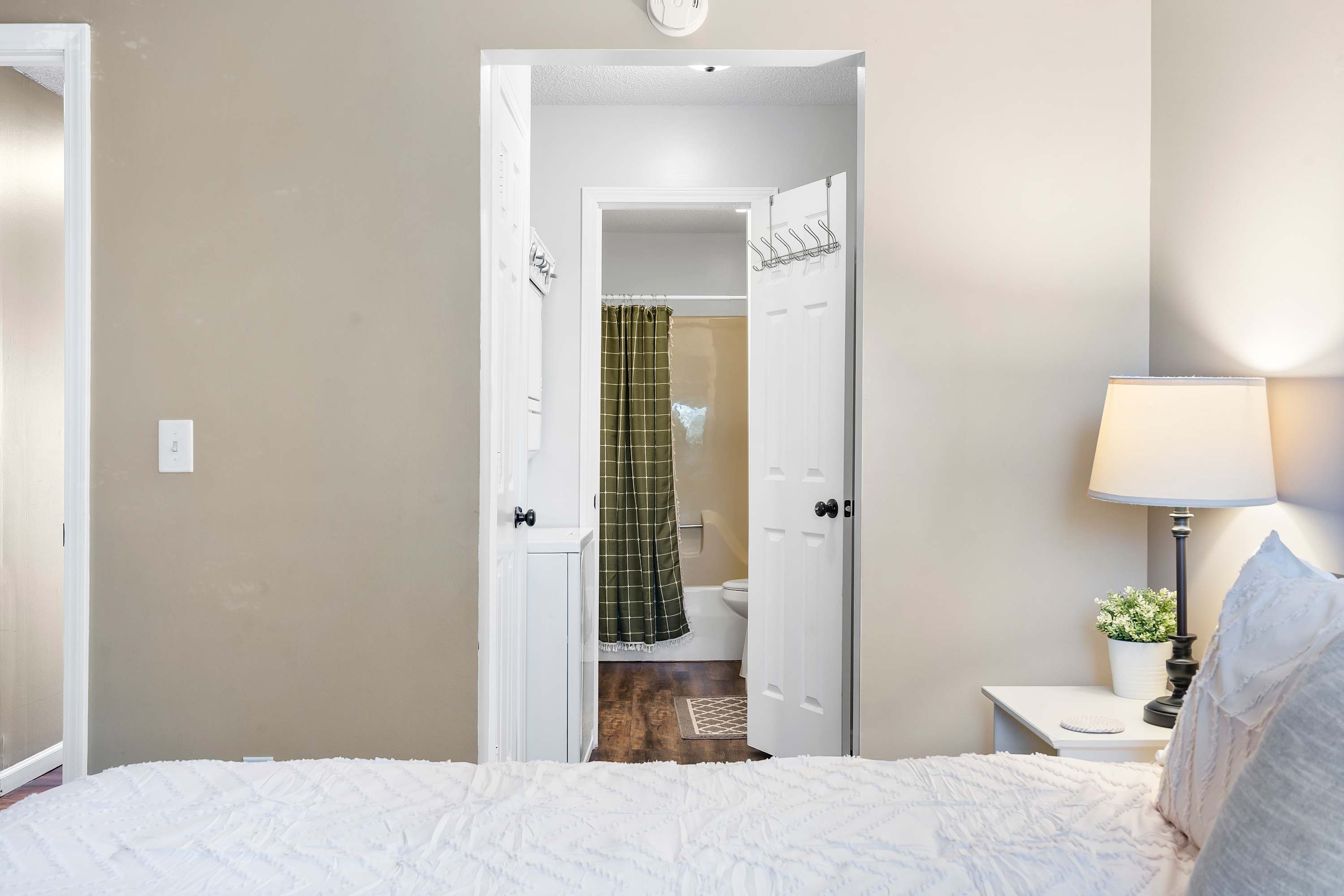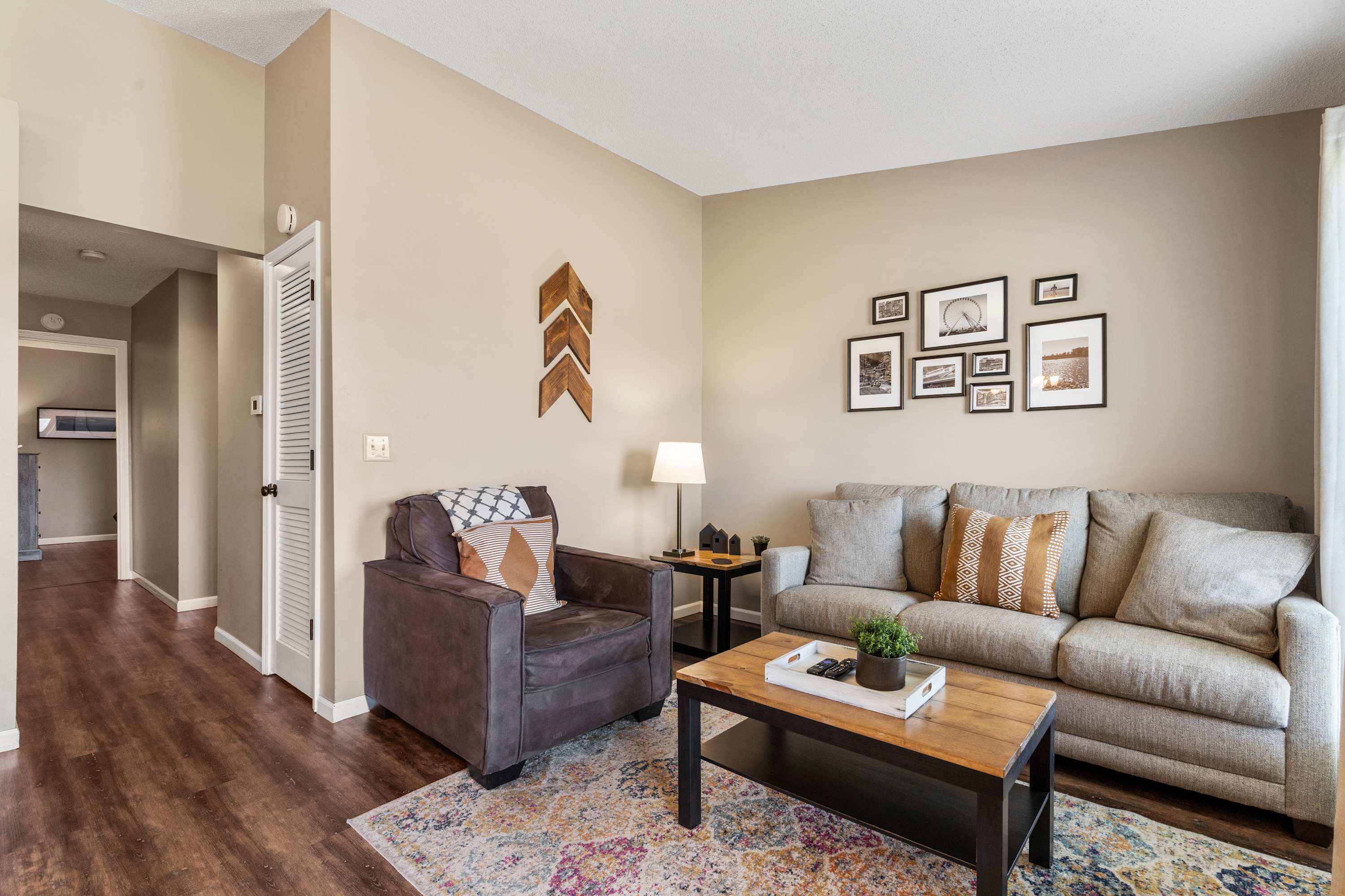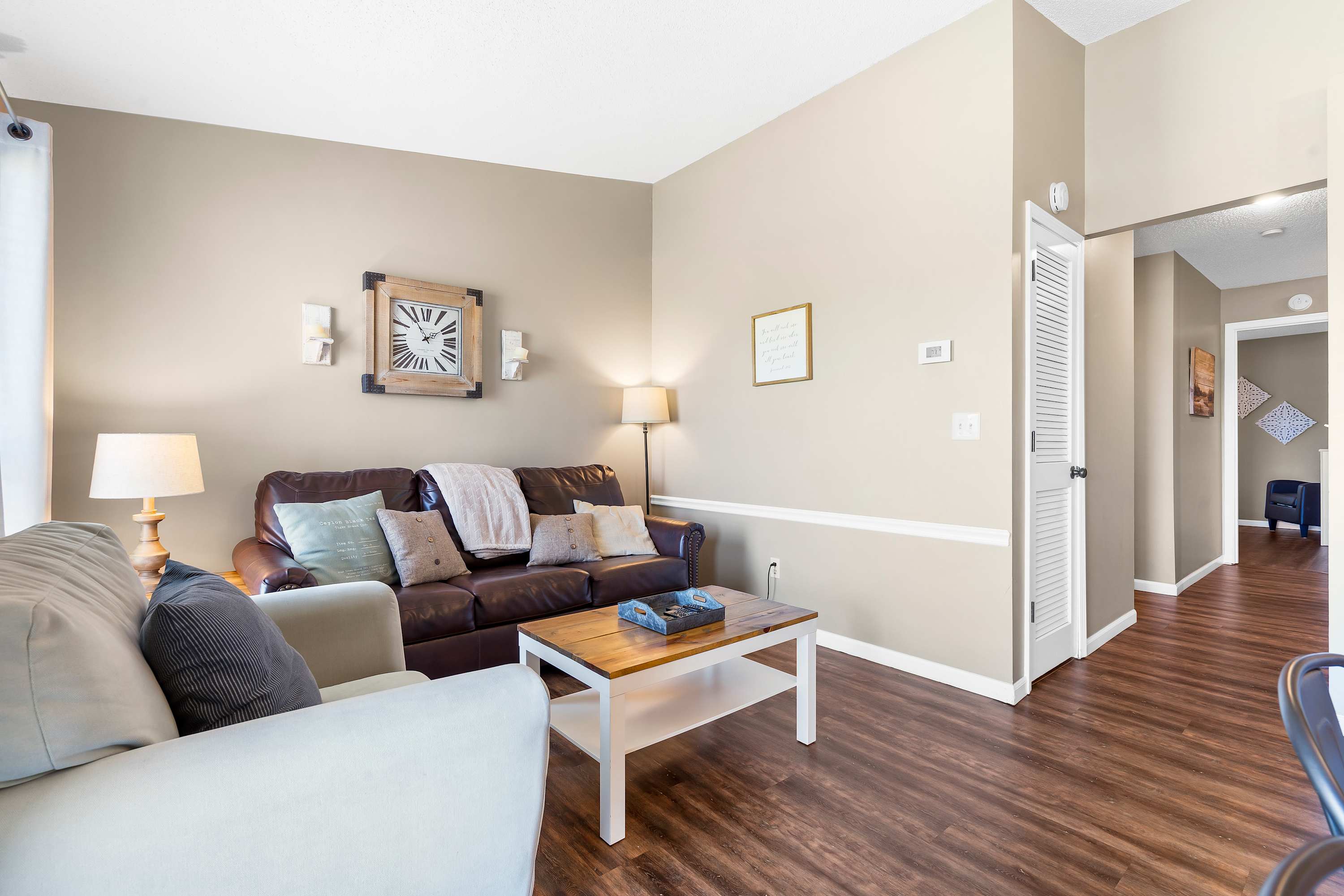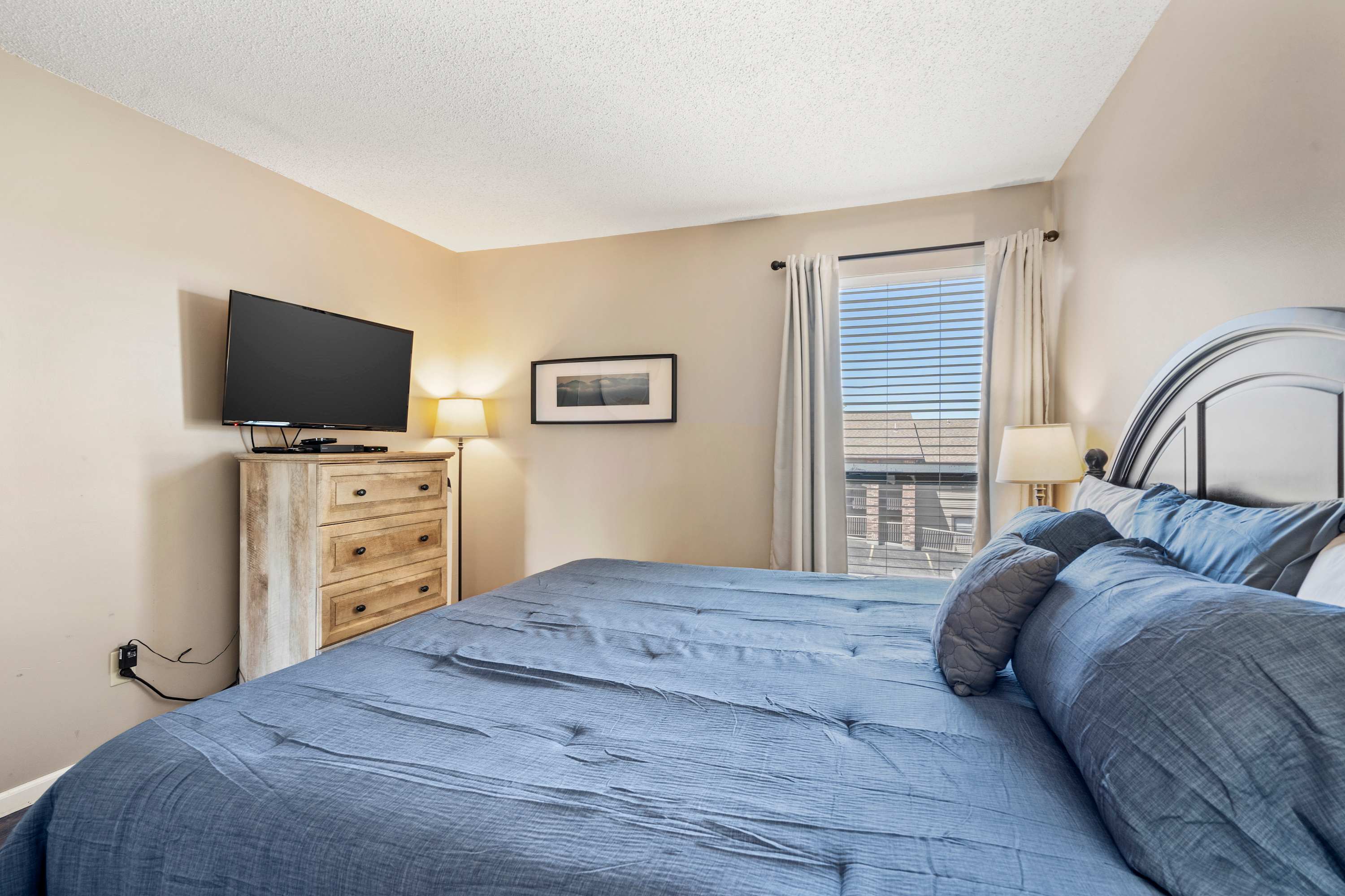 Each home sleeps 4 guests between a private bedroom and a queen-size sleeper sofa in the living room. The bedrooms include a luxurious king-size bed with crisp linens and soft blankets for a great night’s sleep, as well as a TV. The ensuite bathrooms both include a single vanity and shower/tub combo.