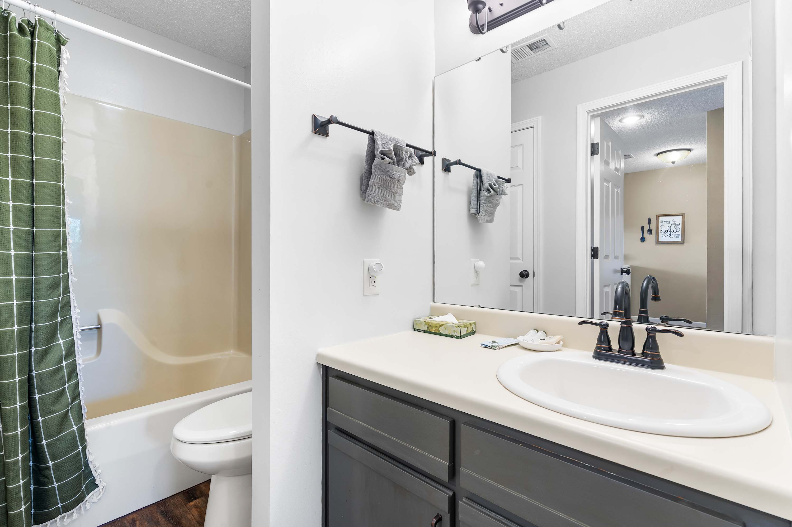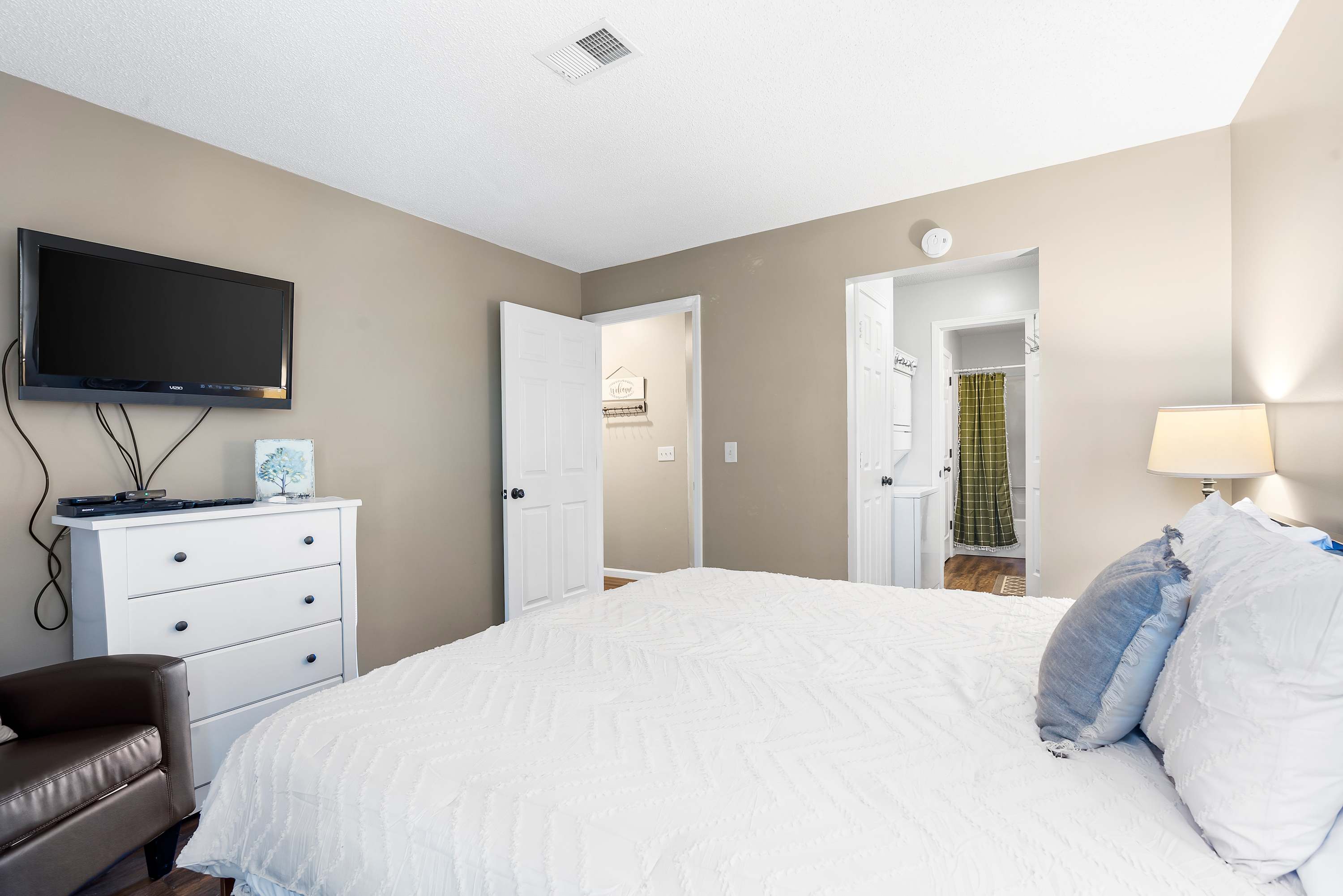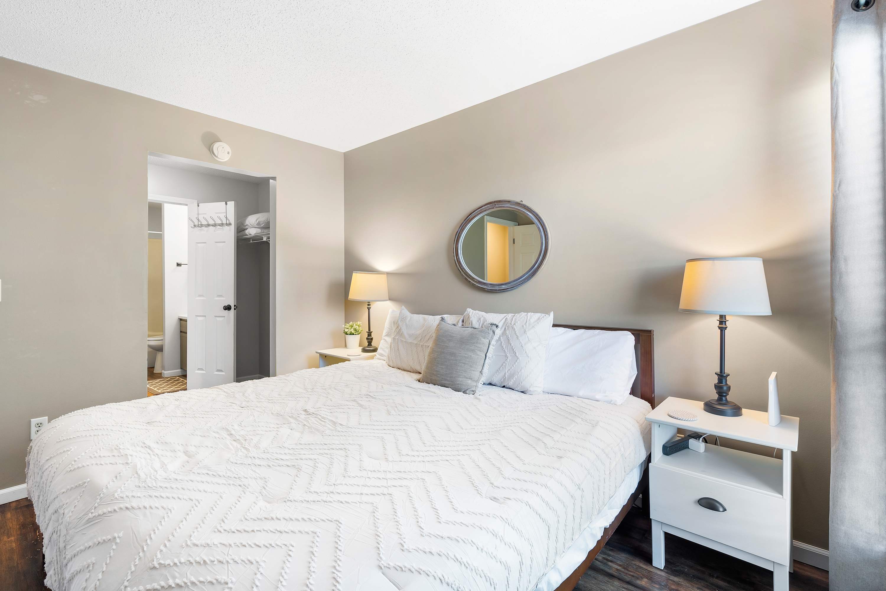 This home comfortably sleeps 4 guests between a private bedroom and queen-size sleeper sofa in the living room. The bedroom includes a luxurious king-size bed with crisp linens and soft blankets for a great night’s sleep, as well as a TV. The ensuite bathroom includes a single vanity and shower/tub combo.