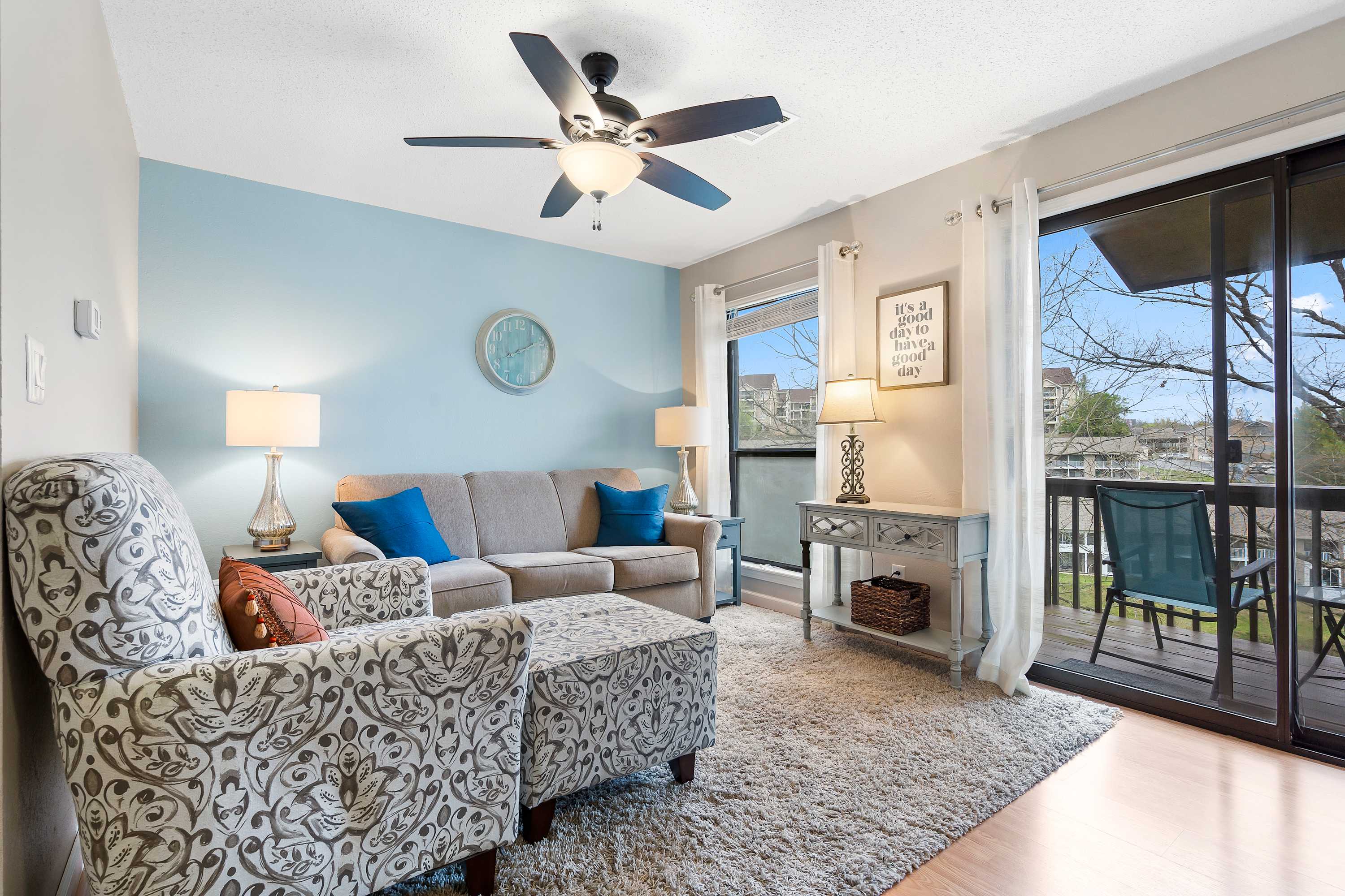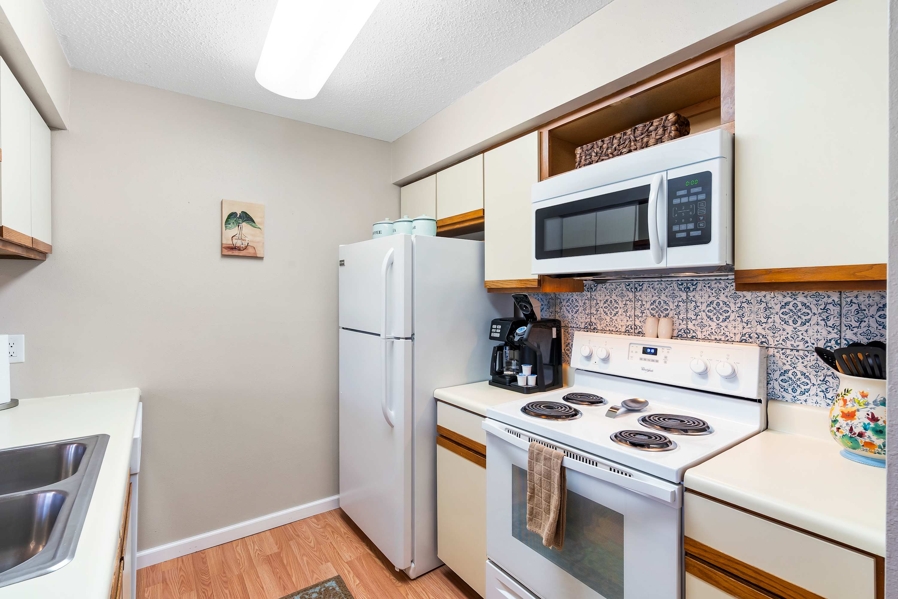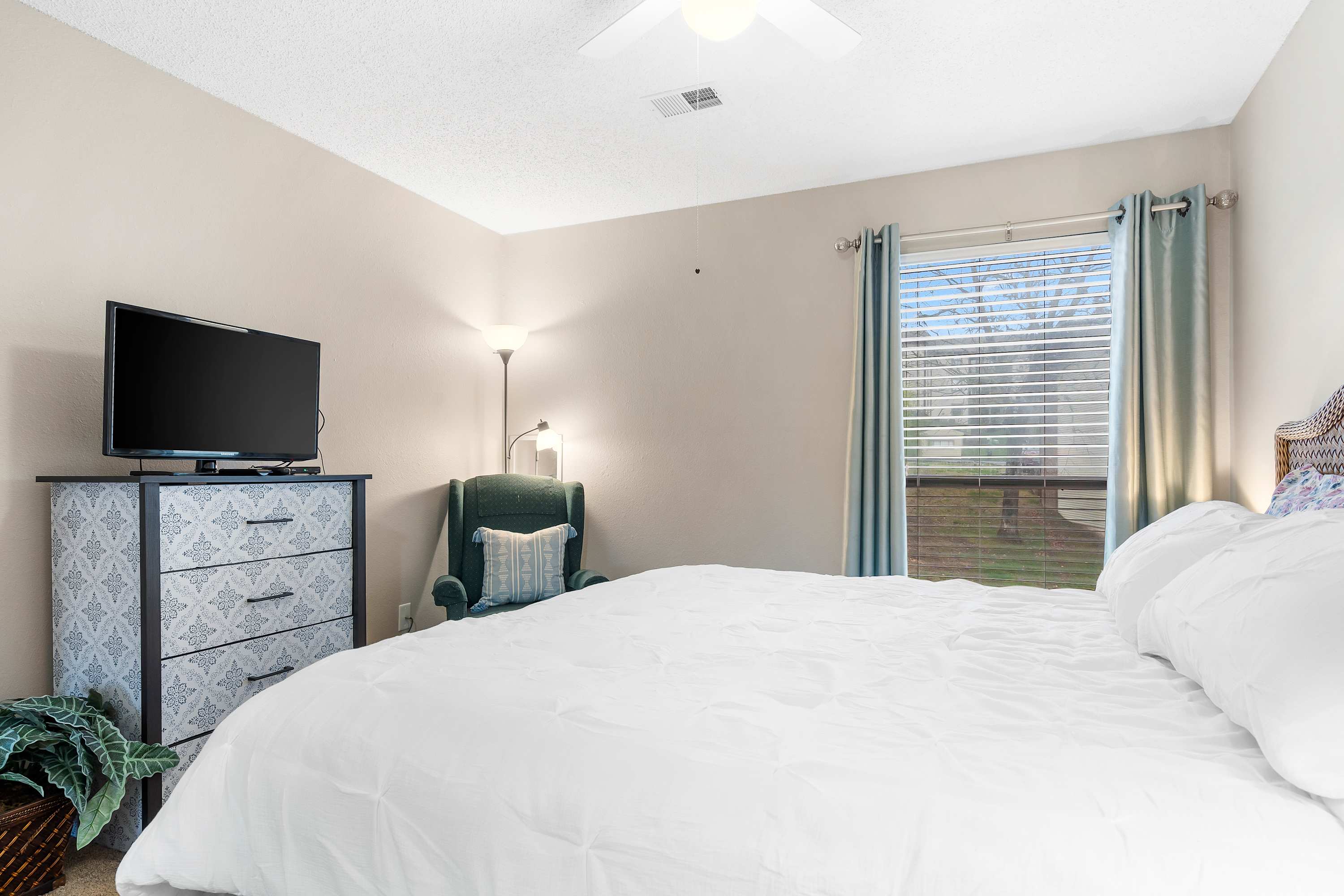The neutral-toned theme of the home’s interior invites you to relax and unwind at the end of long days exploring. Comfortable living room sofa and armchair seating offers the perfect place to kick up your feet while you surf the channels or queue up a movie on the TV. The fully equipped kitchen offers everything you need to whip up meals at home, with ample counterspace and cabinetry for preparation and storage. The chic dining room table can seat 4 for formal meals while high-top stools at the counter are great for casual bites. Brew up a fresh cup of coffee on the Keurig coffee maker to enjoy out on the patio overlooking the scenic views of the neighborhood while you plan out the day’s agenda.