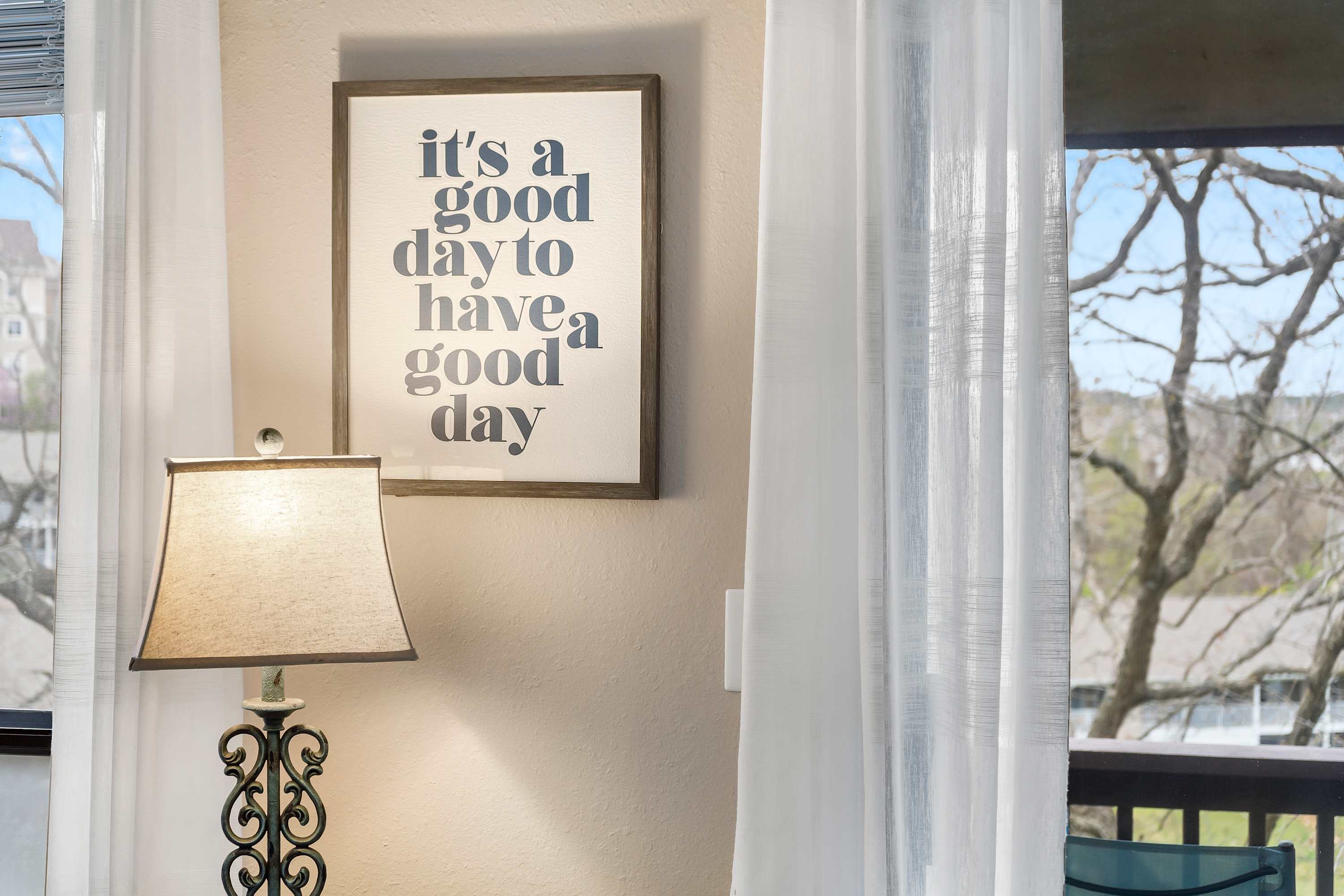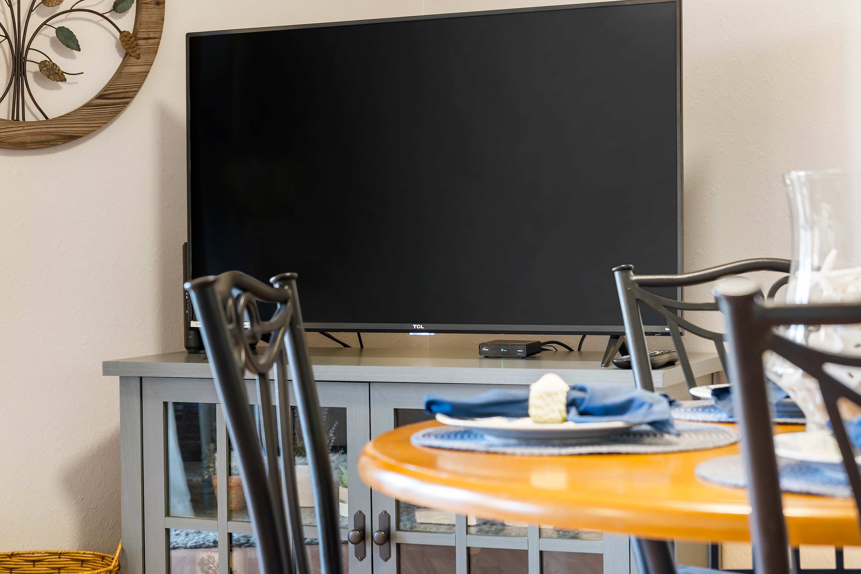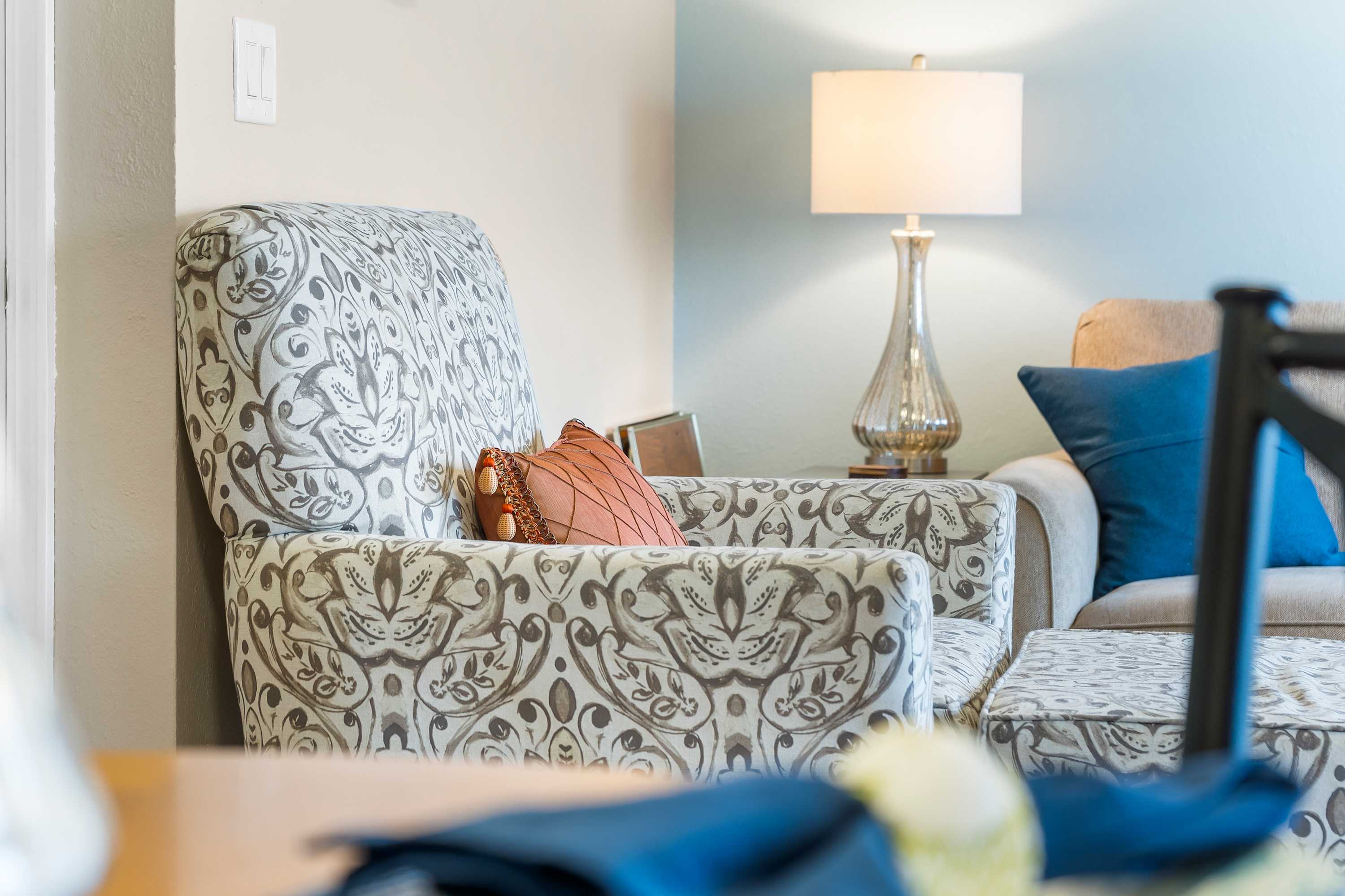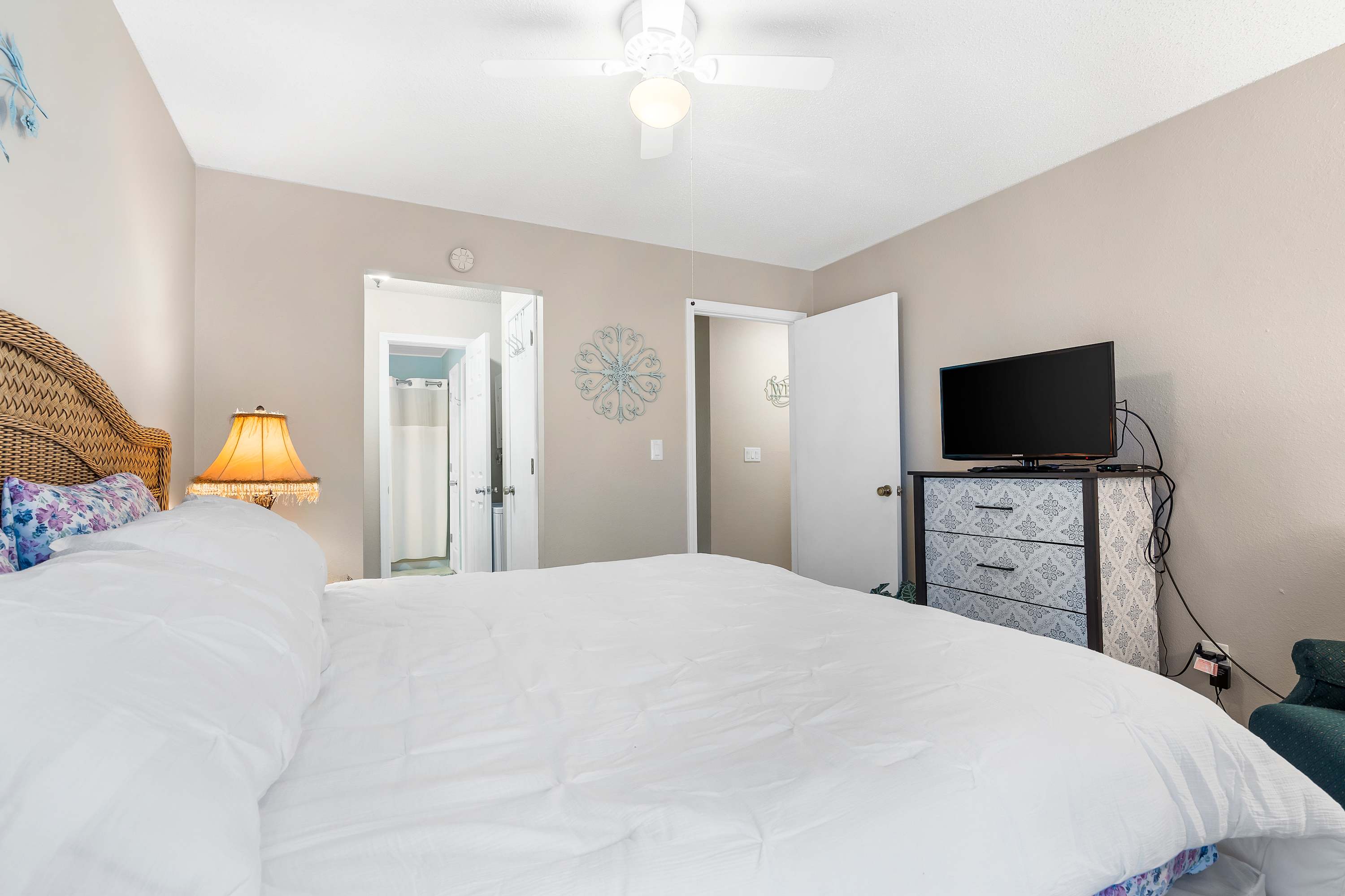 The neutral-toned theme of the home’s interior invites you to relax and unwind at the end of long days exploring. Comfortable living room sofa and armchair seating offers the perfect place to kick up your feet while you surf the channels or queue up a movie on the TV. The fully equipped kitchen offers everything you need to whip up meals at home, with ample counterspace and cabinetry for preparation and storage. The chic dining room table can seat 4 for formal meals while high-top stools at the counter are great for casual bites. Brew up a fresh cup of coffee on the Keurig coffee maker to enjoy out on the patio overlooking the scenic views of the neighborhood while you plan out the day’s agenda.