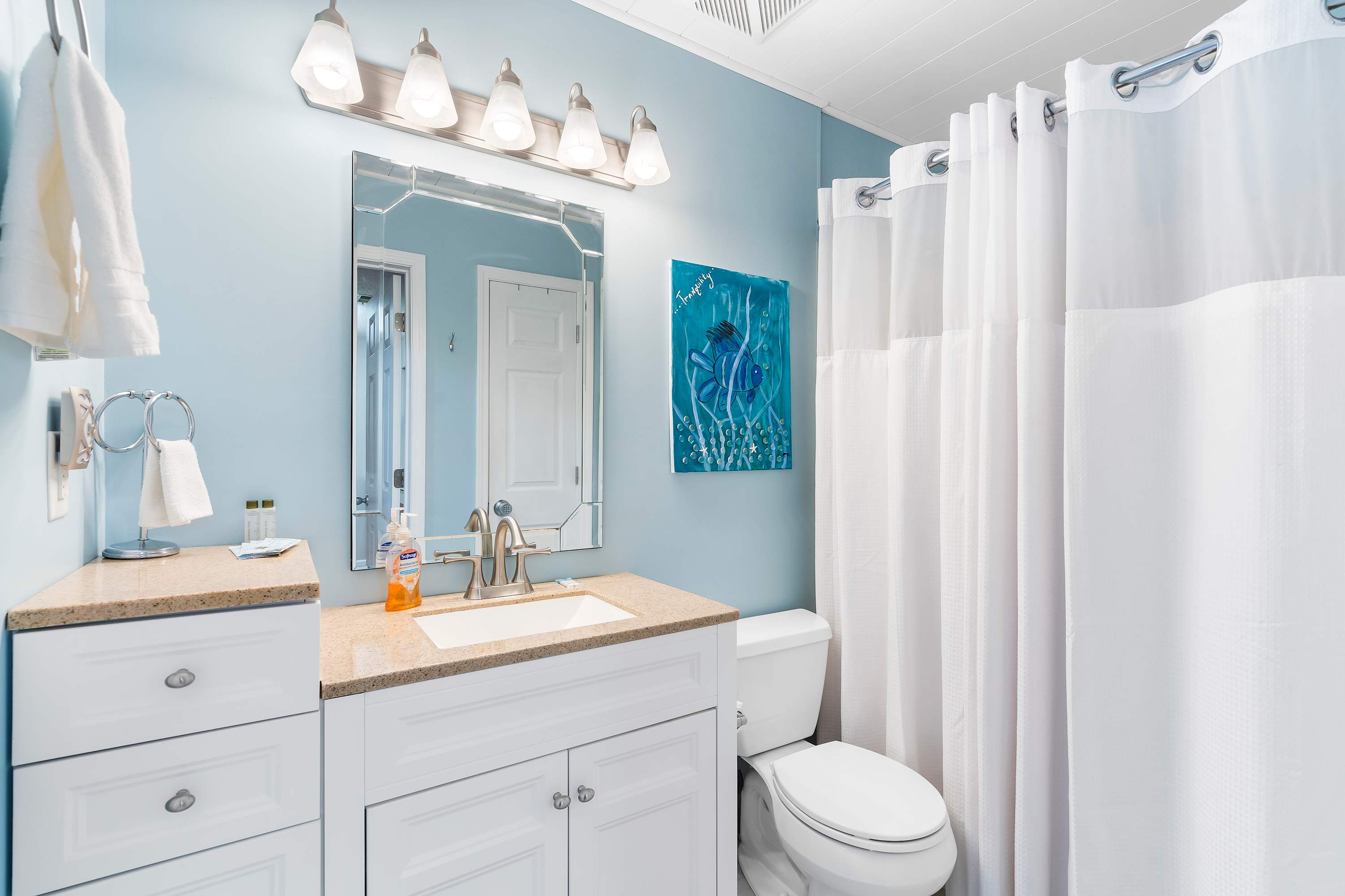This home comfortably sleeps 4 guests between a private bedroom and queen-size sleeper sofa in the living room. The bedroom includes a luxurious king-size bed with crisp linens and soft blankets for a great night’s sleep. The ensuite bathroom includes a single vanity and shower/tub combo.