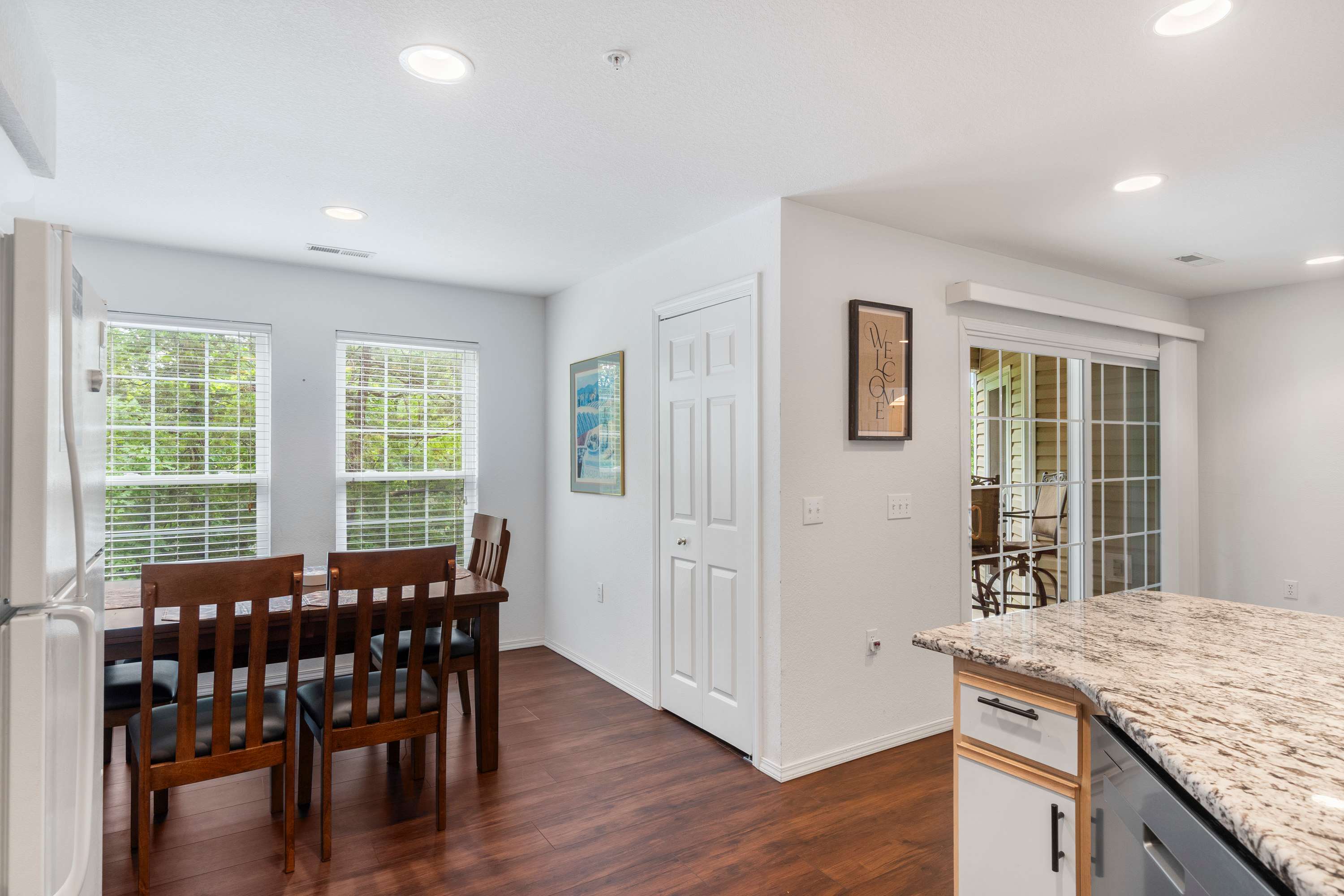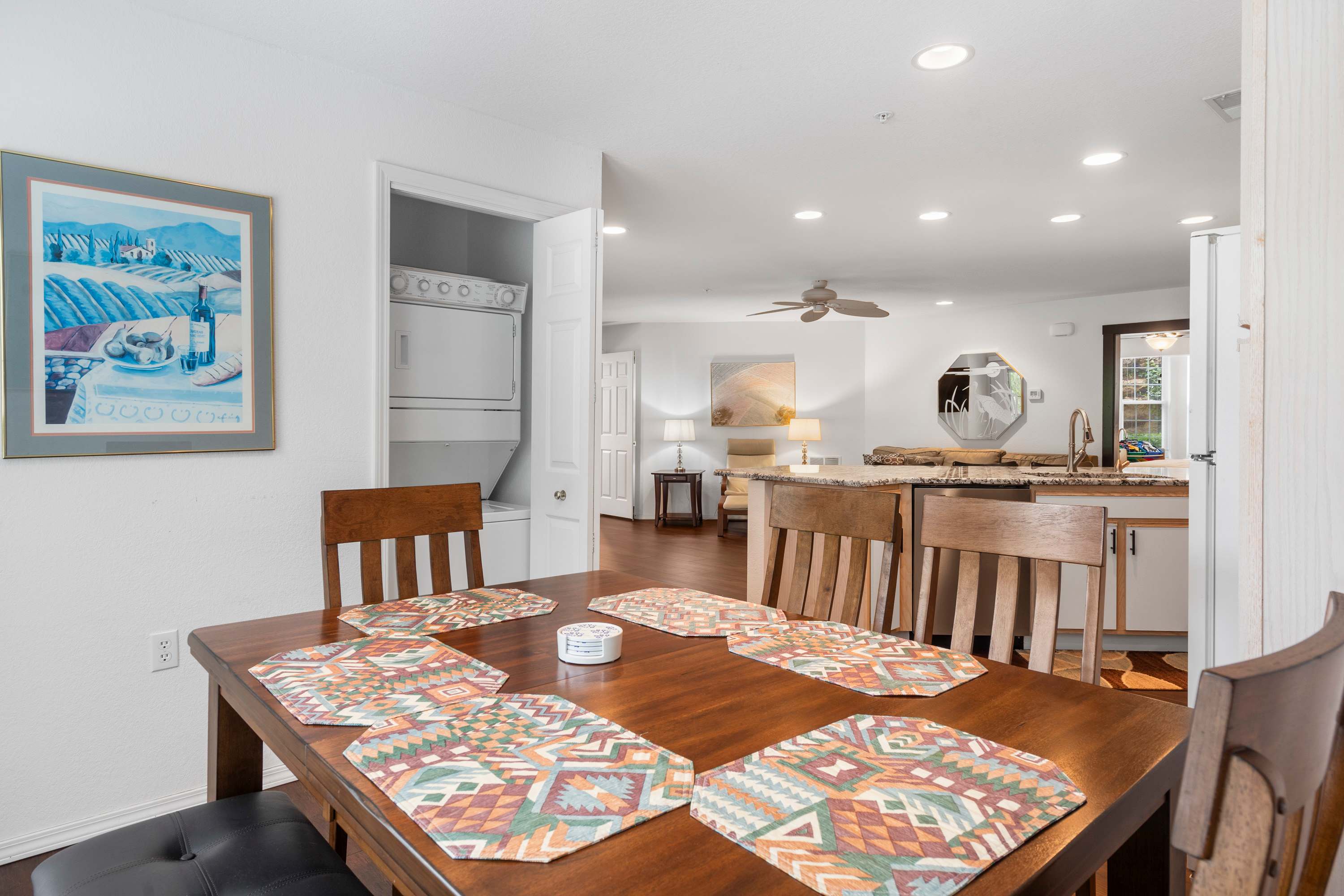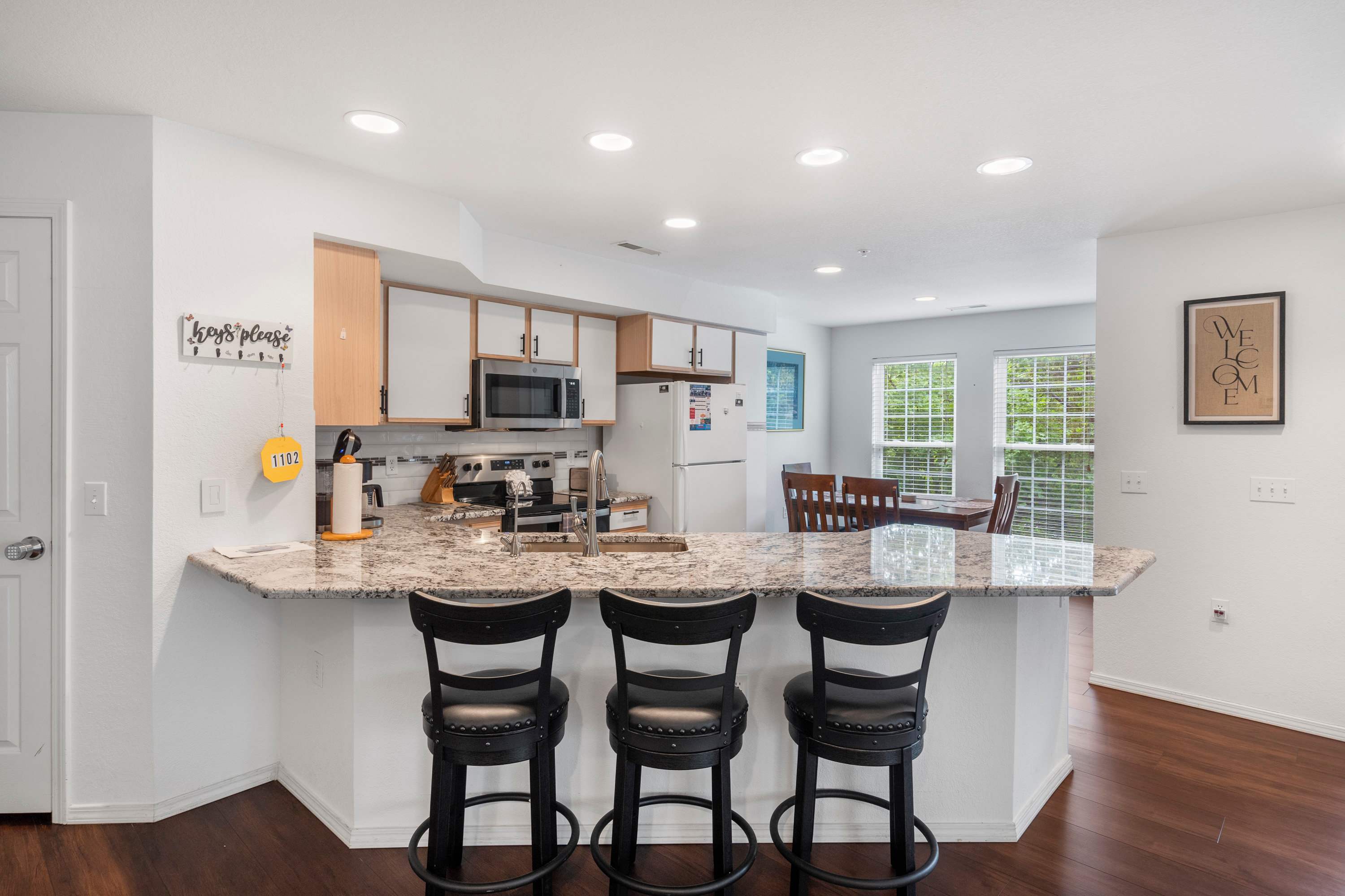 The home’s open and spacious interior has been designed with your comfort in mind, offering plenty of room for everyone to spread out while finding those moments to come back together and create lasting memories. The living room offers contemporary sofa and armchair furnishings for curling up with a good book or streaming a new movie on the mounted smart TV. The open floor plan keeps you right in the action where steps away, the fully equipped kitchen is ready to meet all your culinary needs head on with stainless steel appliances, glossy stone countertops, and ample cabinetry stocked with cookware and dining ware. Grab a stool at the island to nosh on a spread of afternoon hors d’oeuvres or gather the group at the dining table for a more formal meal with seating for 6. Begin each day with your fresh cup of coffee out on the shaded balcony, admiring the picturesque view of the lake while you soak in the fresh air and plan out the adventures of the hours ahead.
