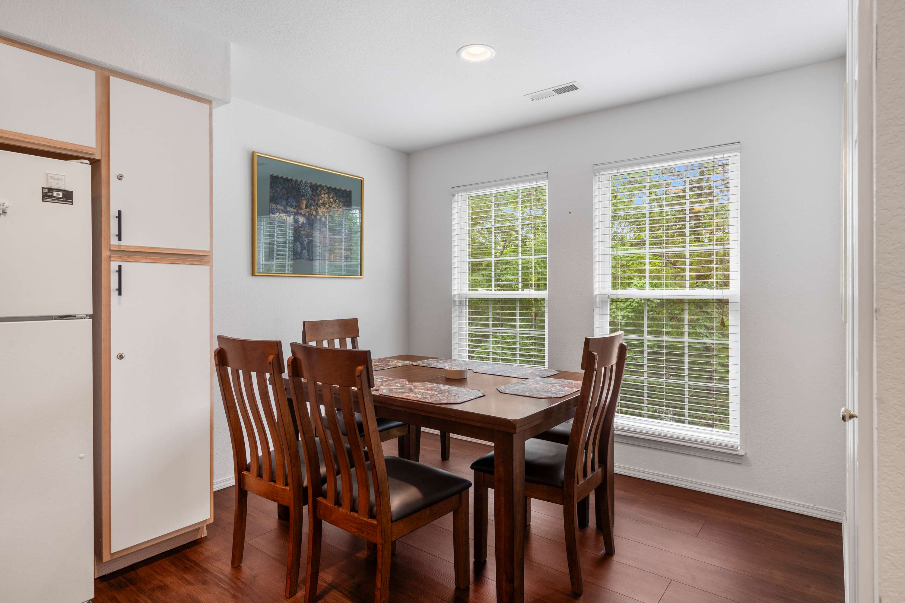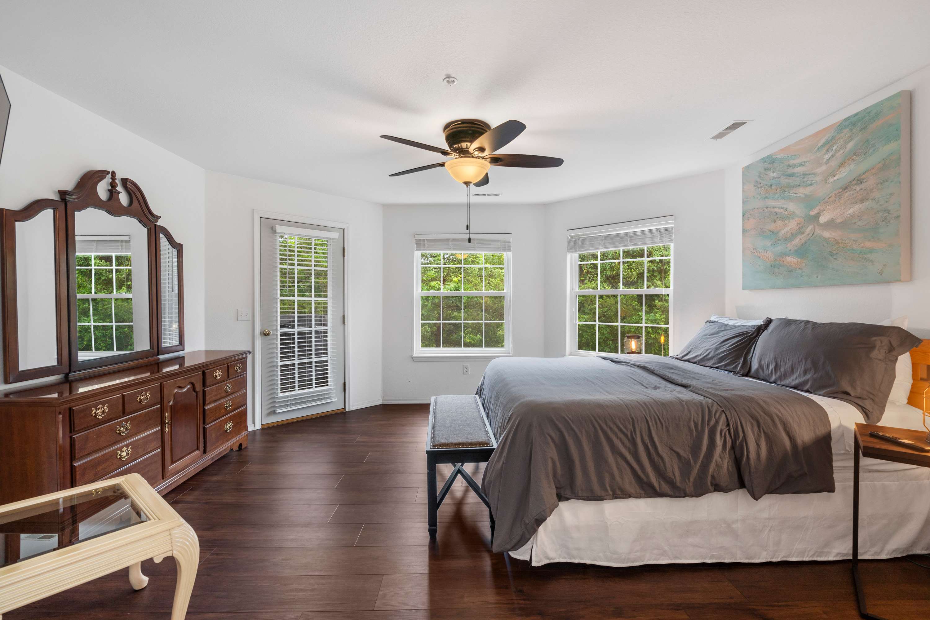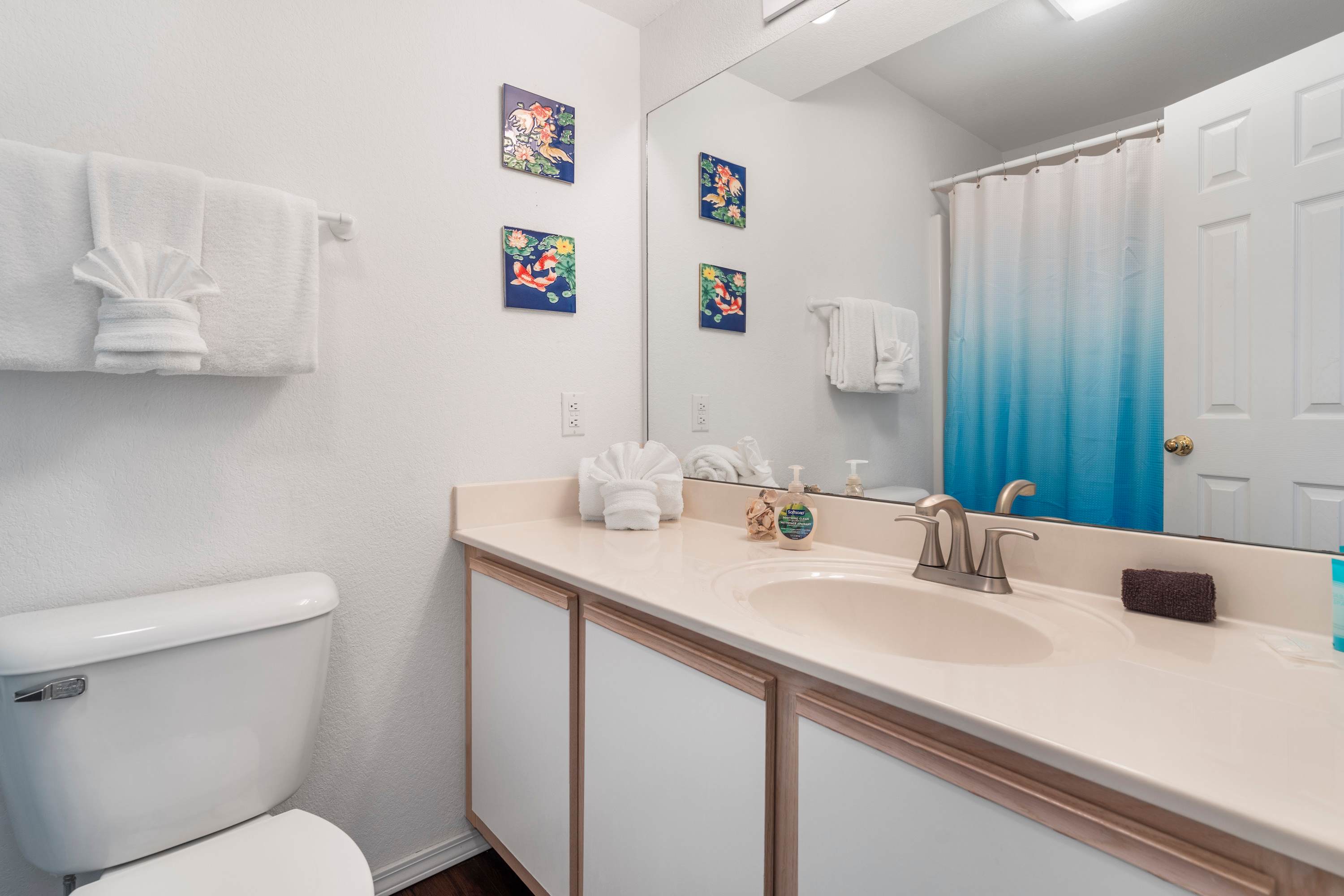 The home’s open and spacious interior has been designed with your comfort in mind, offering plenty of room for everyone to spread out while finding those moments to come back together and create lasting memories. The living room offers contemporary sofa and armchair furnishings for curling up with a good book or streaming a new movie on the mounted smart TV. The open floor plan keeps you right in the action where steps away, the fully equipped kitchen is ready to meet all your culinary needs head on with stainless steel appliances, glossy stone countertops, and ample cabinetry stocked with cookware and dining ware. Grab a stool at the island to nosh on a spread of afternoon hors d’oeuvres or gather the group at the dining table for a more formal meal with seating for 6. Begin each day with your fresh cup of coffee out on the shaded balcony, admiring the picturesque view of the lake while you soak in the fresh air and plan out the adventures of the hours ahead.