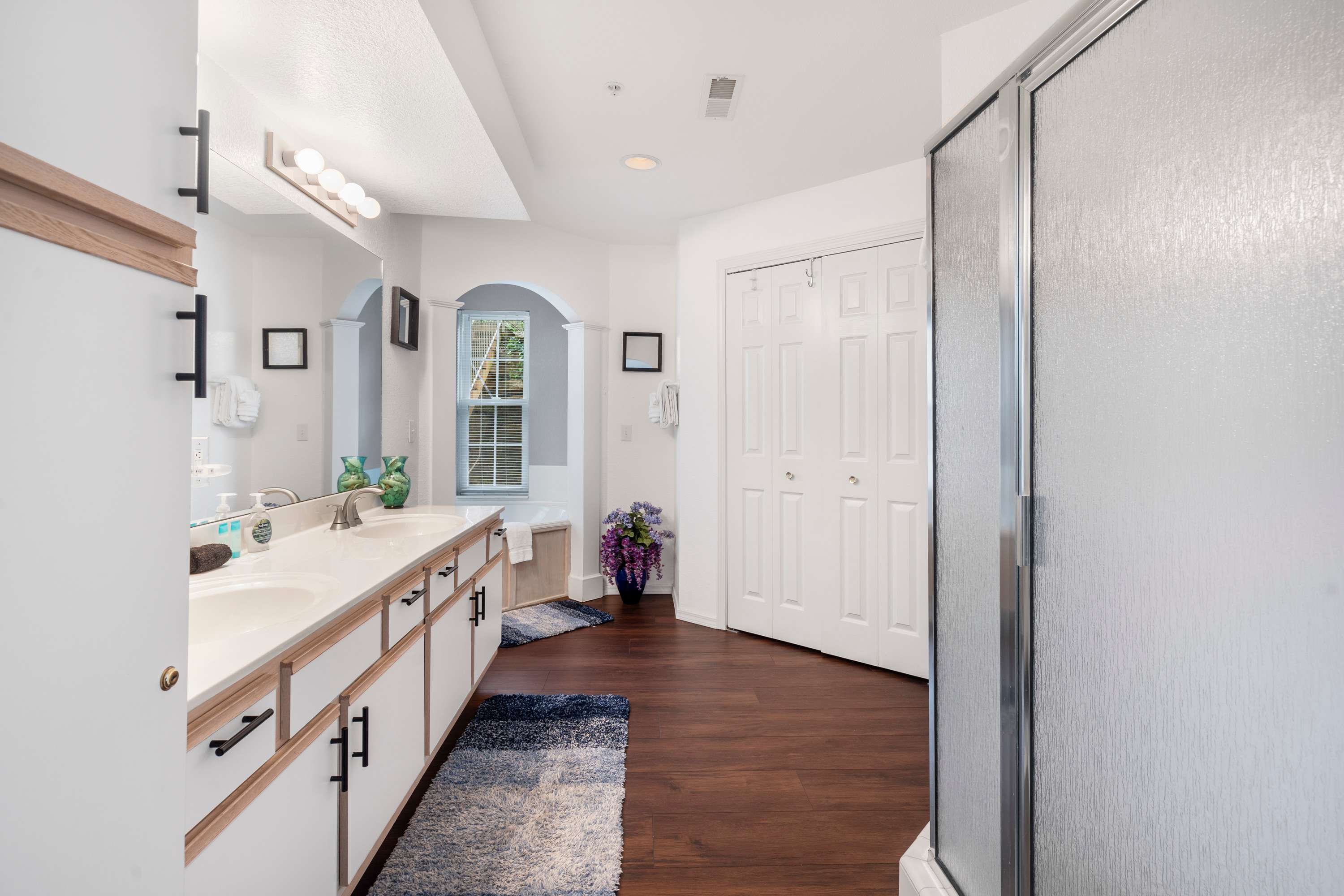 Bedroom #1 includes a king-size bed, smart TV, balcony, and ensuite bathroom with a dual vanity, soaking tub, and walk-in shower.