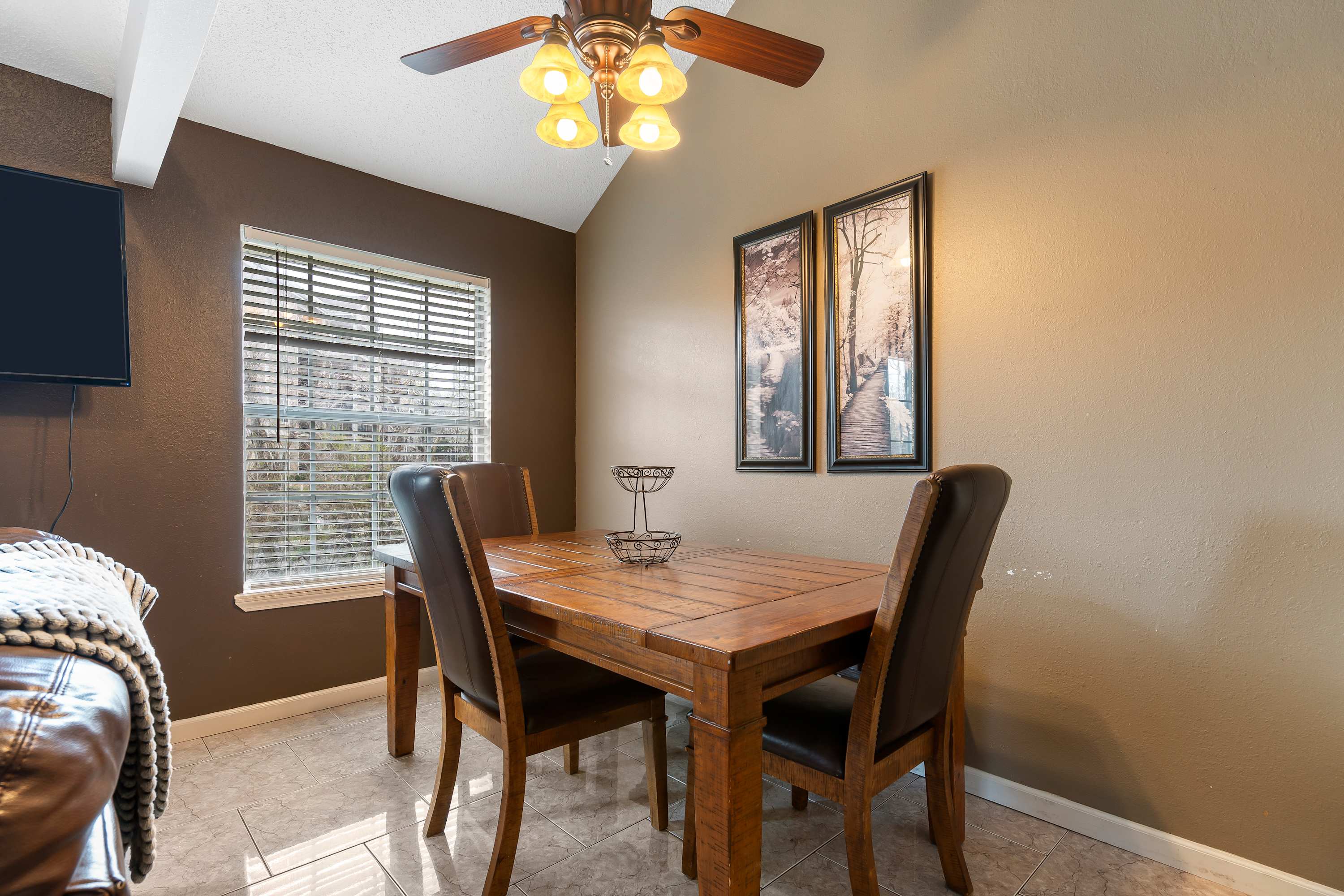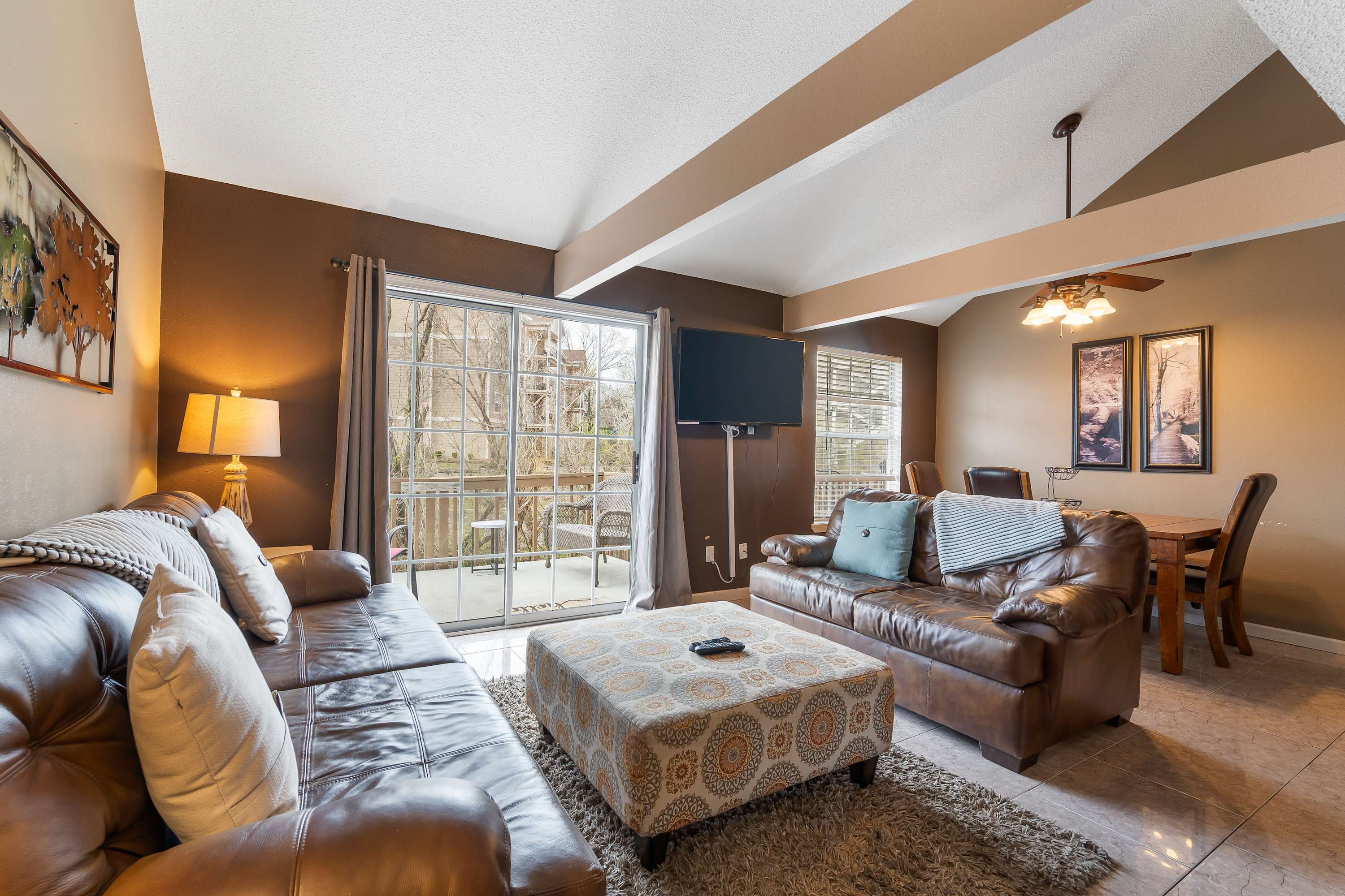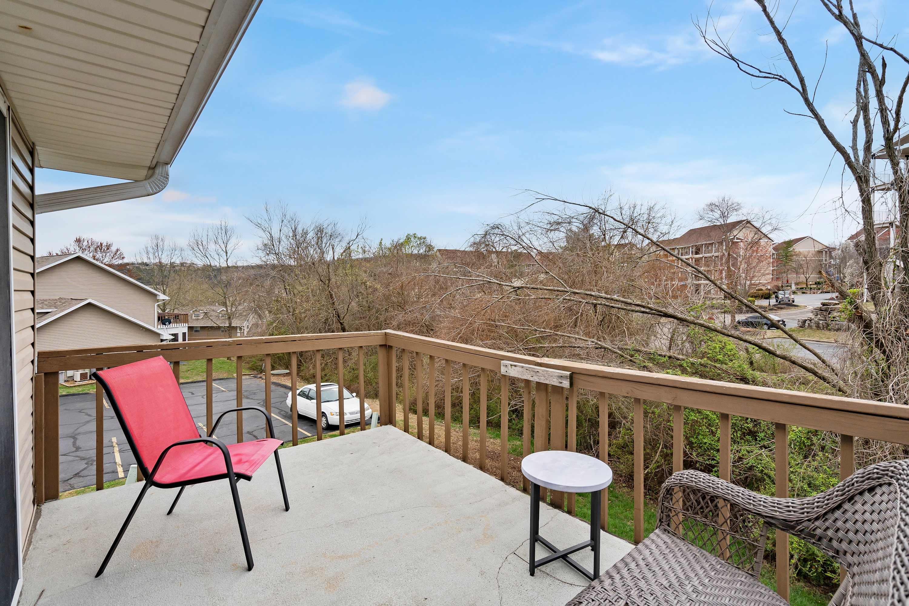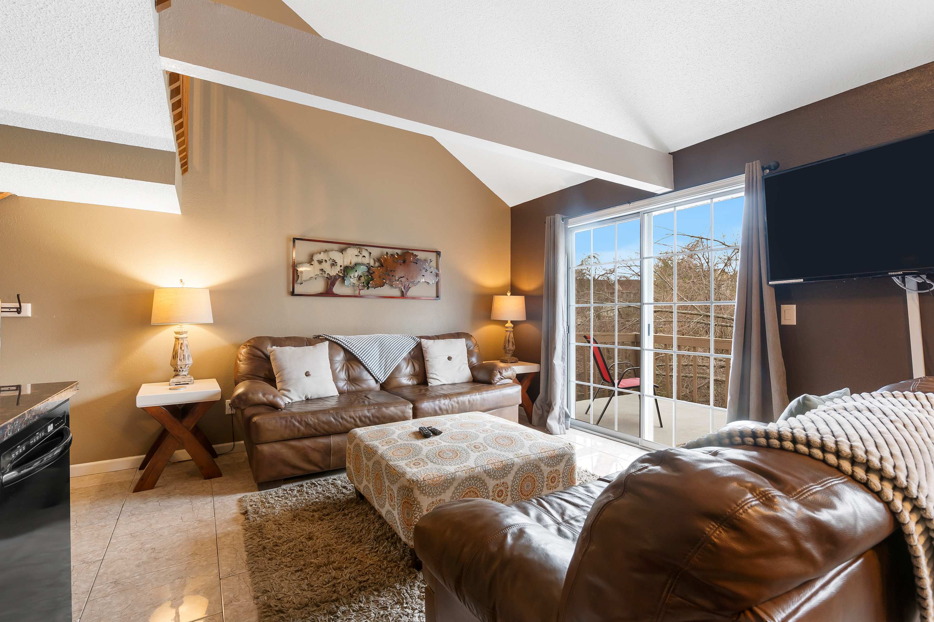 The home’s stately interior seamlessly blends country charm and contemporary styling together to create spaces designed for relaxation and connectivity. Sink into plush living room sofa seating while you queue up an evening movie on the large, mounted TV. Blend indoor and outdoor living together by opening the sliding doors to the balcony, allowing the breeze to flow freely throughout the home. The efficient kitchen is fully equipped for mealtimes with all-black appliances and sleek cabinetry stocked with cookware and dining ware. Enjoy dining together at the elegant table with seating for 3 or utilize this space to host a spontaneous game night. Fire up the Keurig first thing in the morning to brew up a fresh cup of coffee, enjoying it back out on the balcony while you take in the fresh Ozark air and picturesque surroundings.