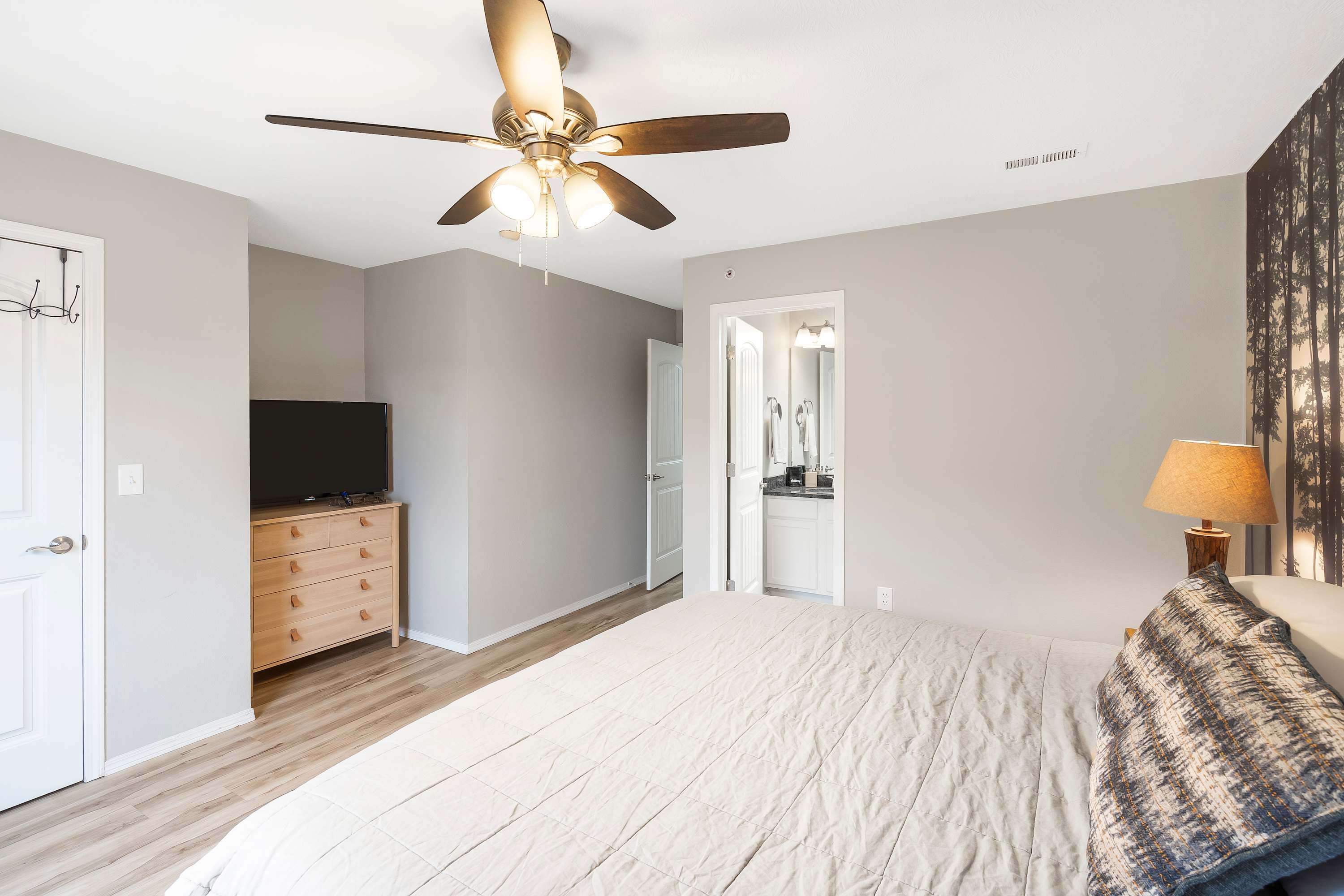 Bedroom #1 includes a king size bed, smart TV, and ensuite bathroom with a single vanity and shower/tub combo.