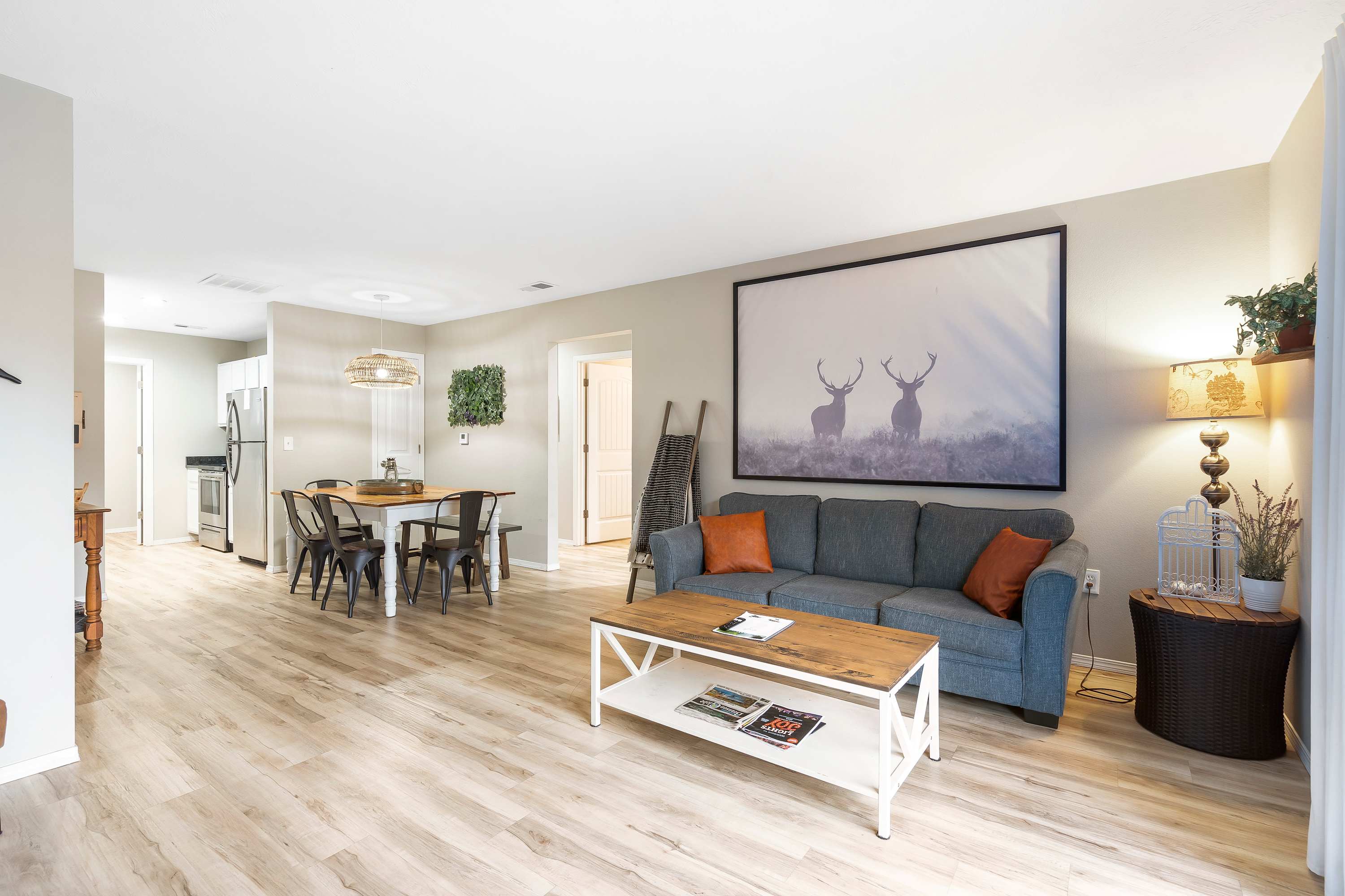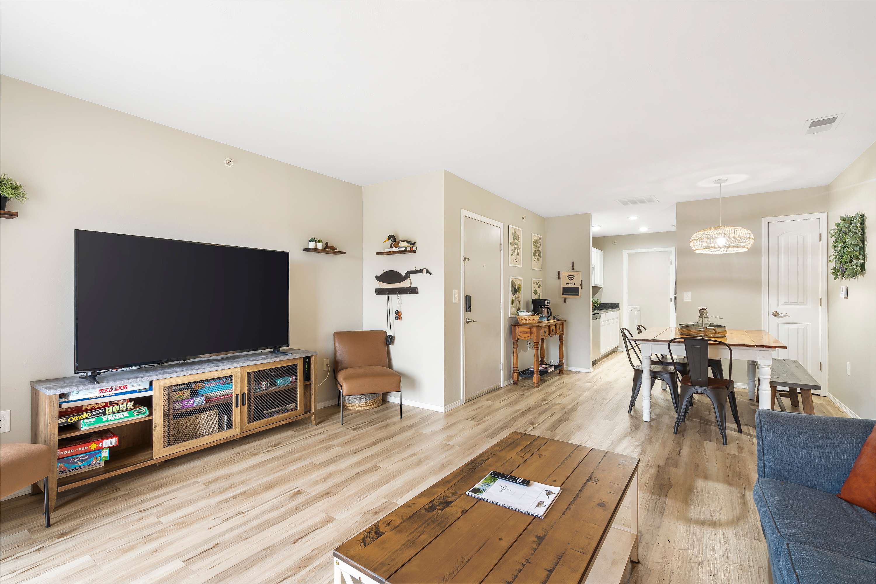 The home’s bright and fresh interior provides a welcome respite from all the sightseeing, with chic nature-inspired décor and contemporary furnishings beckoning you to unwind. Curl up on the cozy living room sofa as you catch up on episodes of your favorite stream-ready show on the smart TV. Make it a night of entertainment to remember as you gather together at the dining room table for meals followed by a competitive round of board games. The kitchen is fully equipped and ready to accommodate all of your culinary endeavors, showcasing stainless steel appliances, glossy countertops, and sleek cabinetry stocked with all the comforts of home.