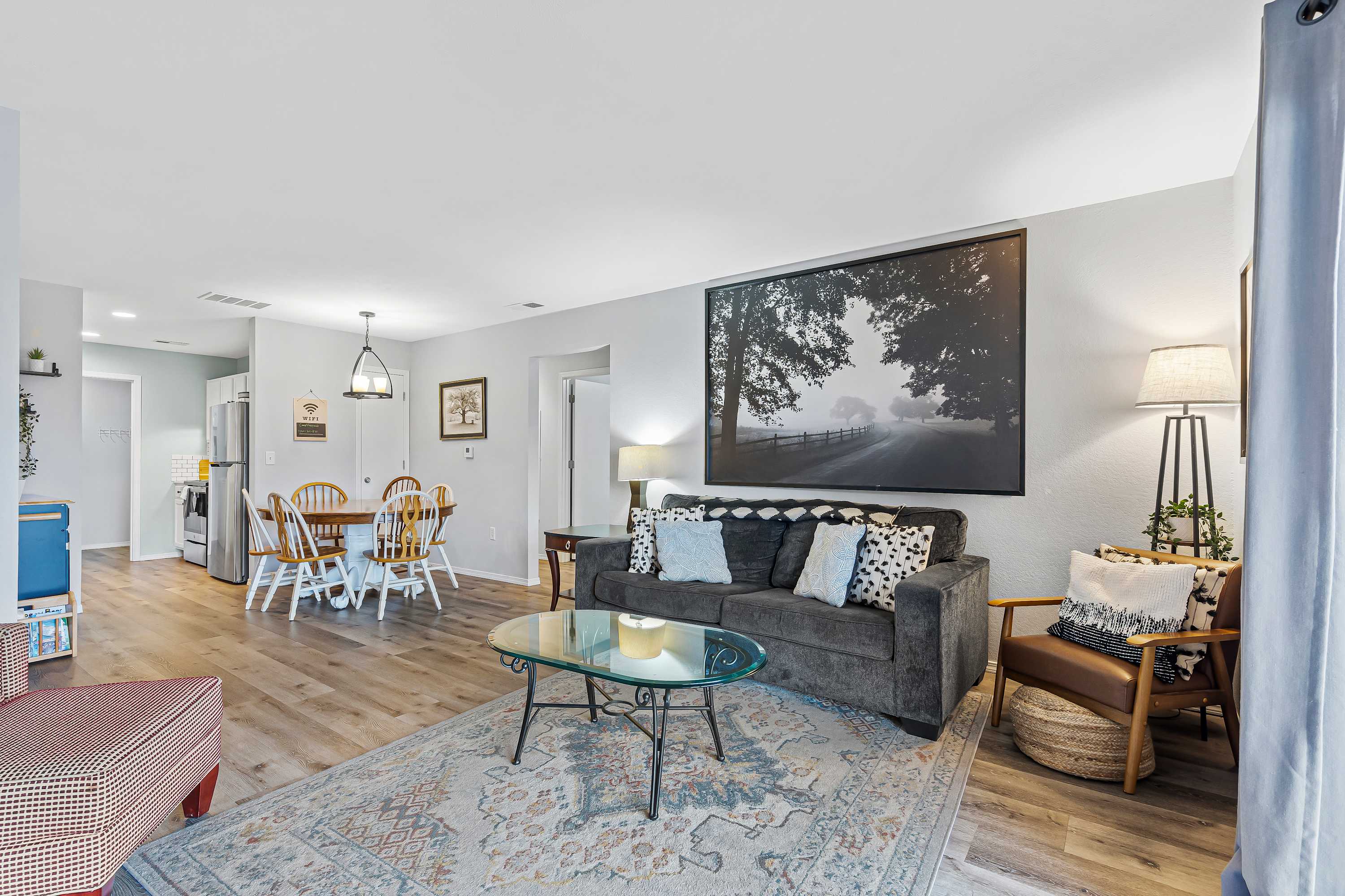 The home’s modern interior is its own sight to behold, where contemporary furnishings meet sophisticated décor, promoting an environment of peace and tranquility. Relax on plush sofa and armchair seating in the living room as you catch up on episodes of your favorite show on the smart TV. Sliding doors help bridge the gap between indoor and outdoor living, allowing the fresh country breeze to flow freely through the home. The chic galley kitchen is fully equipped for all of your mealtime endeavors, showcasing stainless steel appliances, stone countertops, subway tile backsplash, and ample cabinetry stocked with cookware and dining ware. Gather the crew together to enjoy your fare at the dining room table with seating for 6 or take your plate to the patio where you an dine al fresco among the sights and sounds of nature.