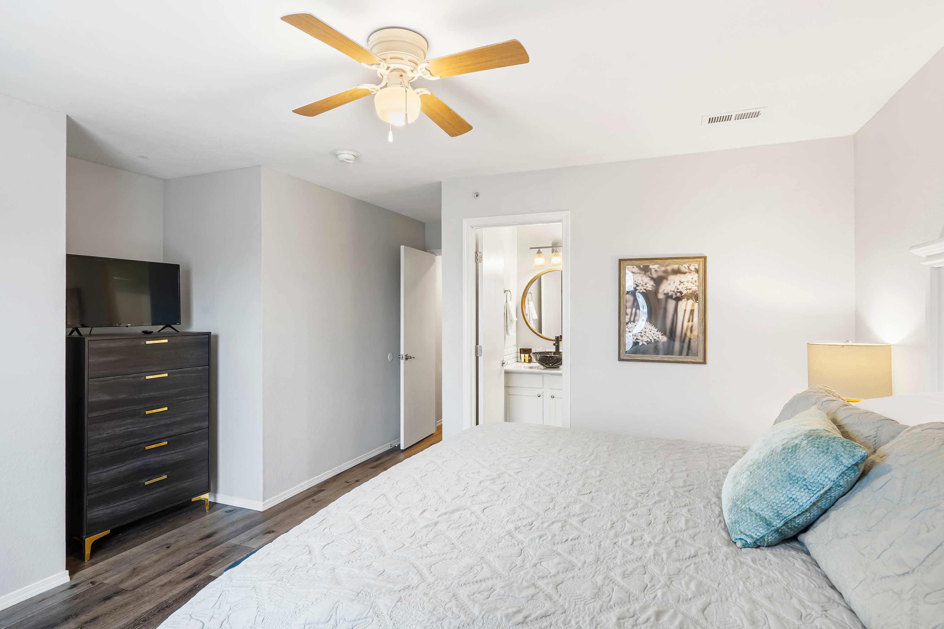 Bedroom #1 includes a king size bed, smart TV, and ensuite bathroom with a single vanity and shower/tub combo.