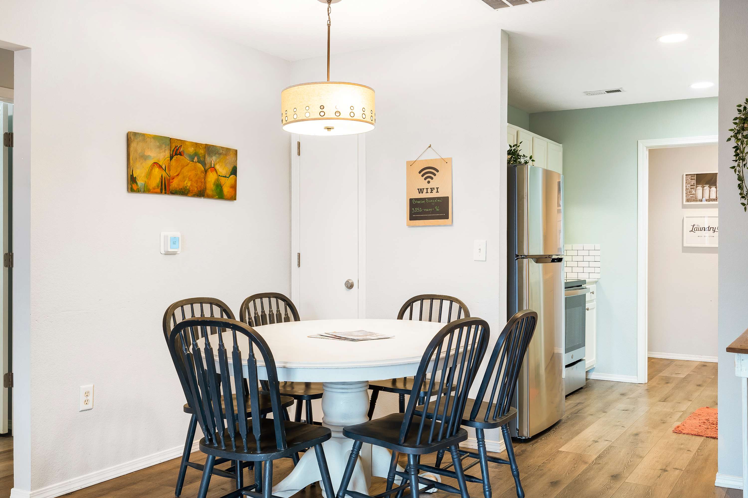 The home’s interior is a perfect marriage of comfort and style, where your downtime will be well spent connecting and creating lasting memories. Kick back on the plush sofa and armchair seating in the living room as you stream your favorite shows on the smart TV. Steps away, the dining room table with seating for 6 can host an evening of games as well as all your meals. Should you choose to do a little home cooking, the modern kitchen is ready to accommodate all your culinary whims, showcasing stainless steel appliances, stone countertops, and ample cabinetry stocked with cookware and dining ware.
