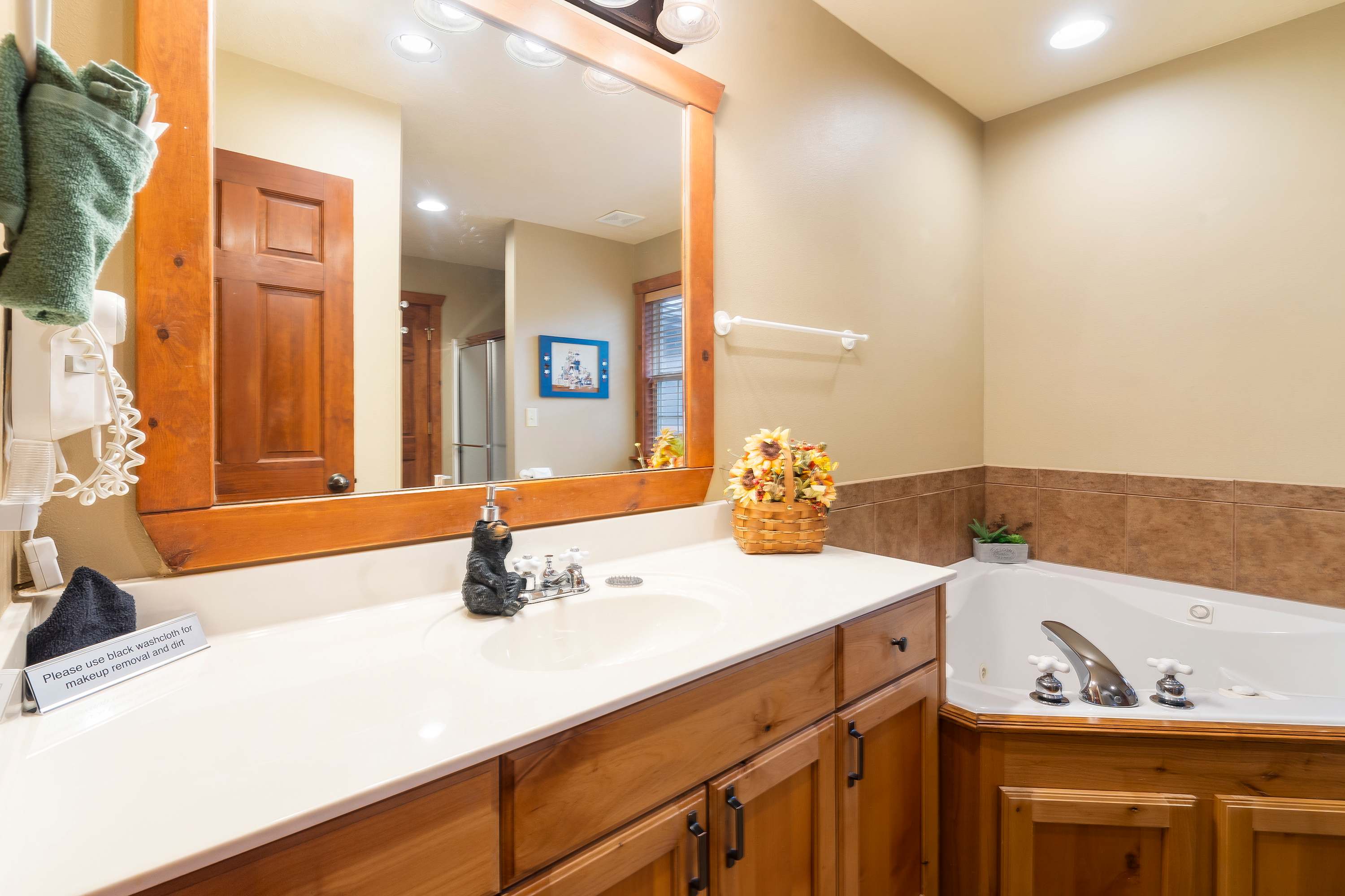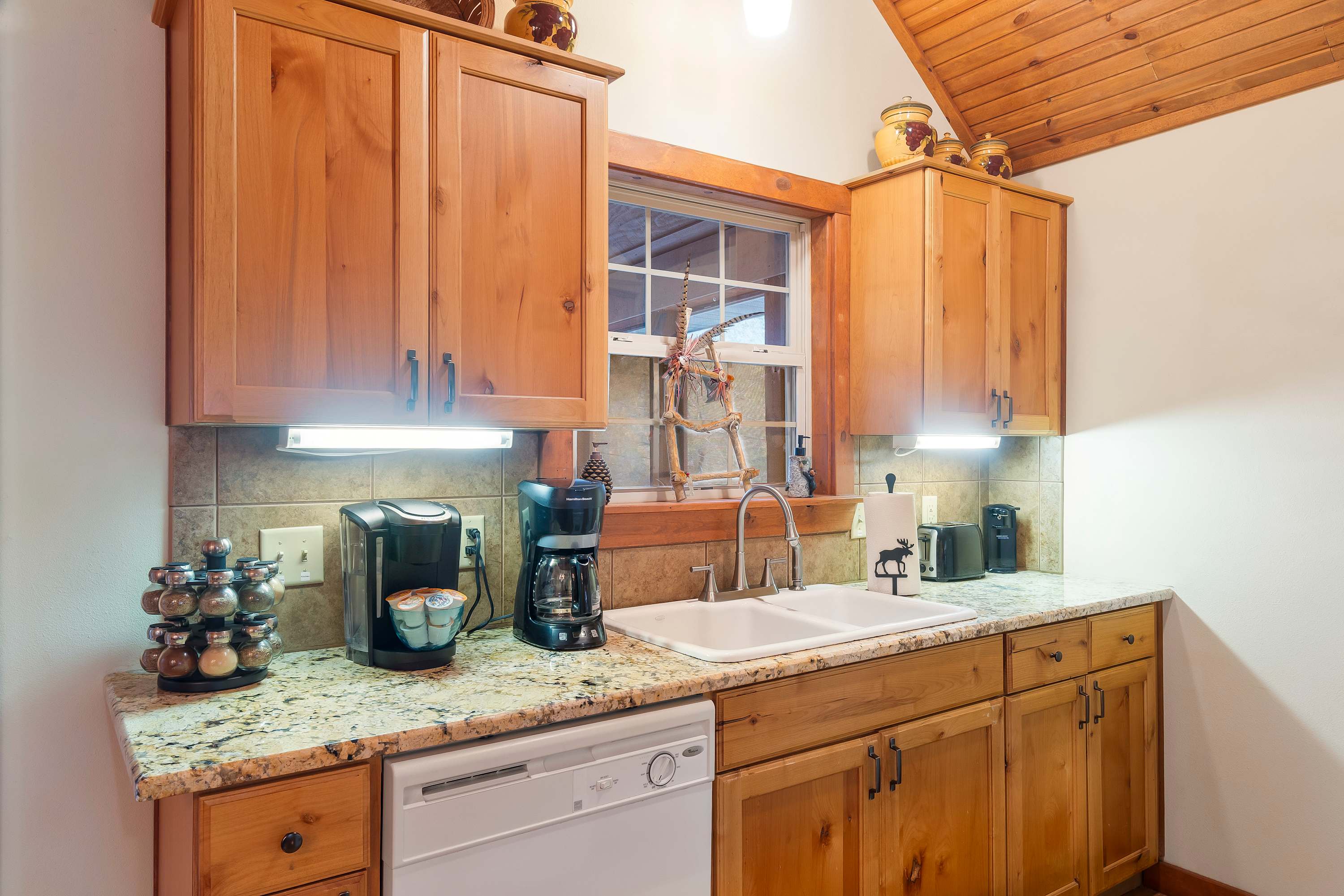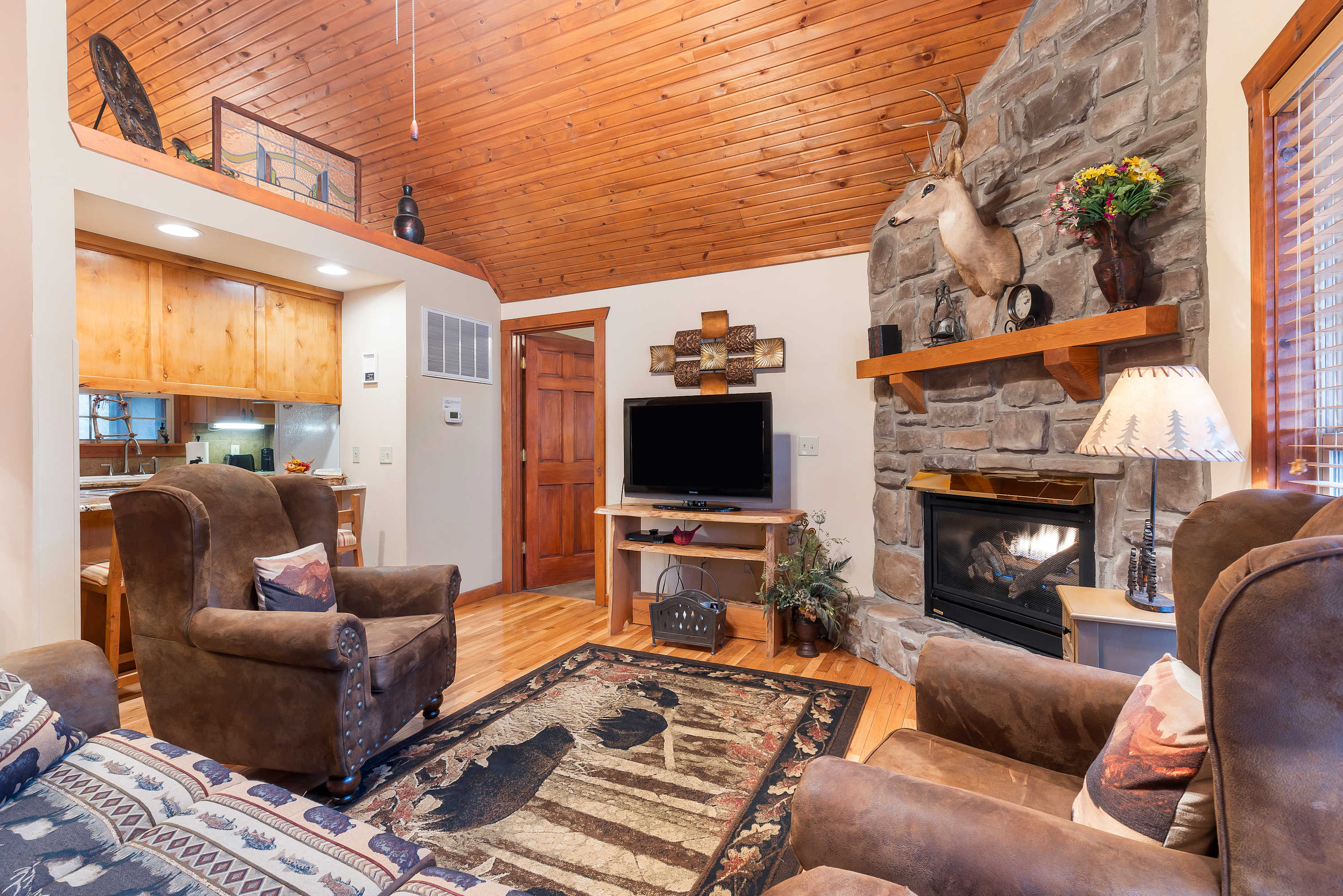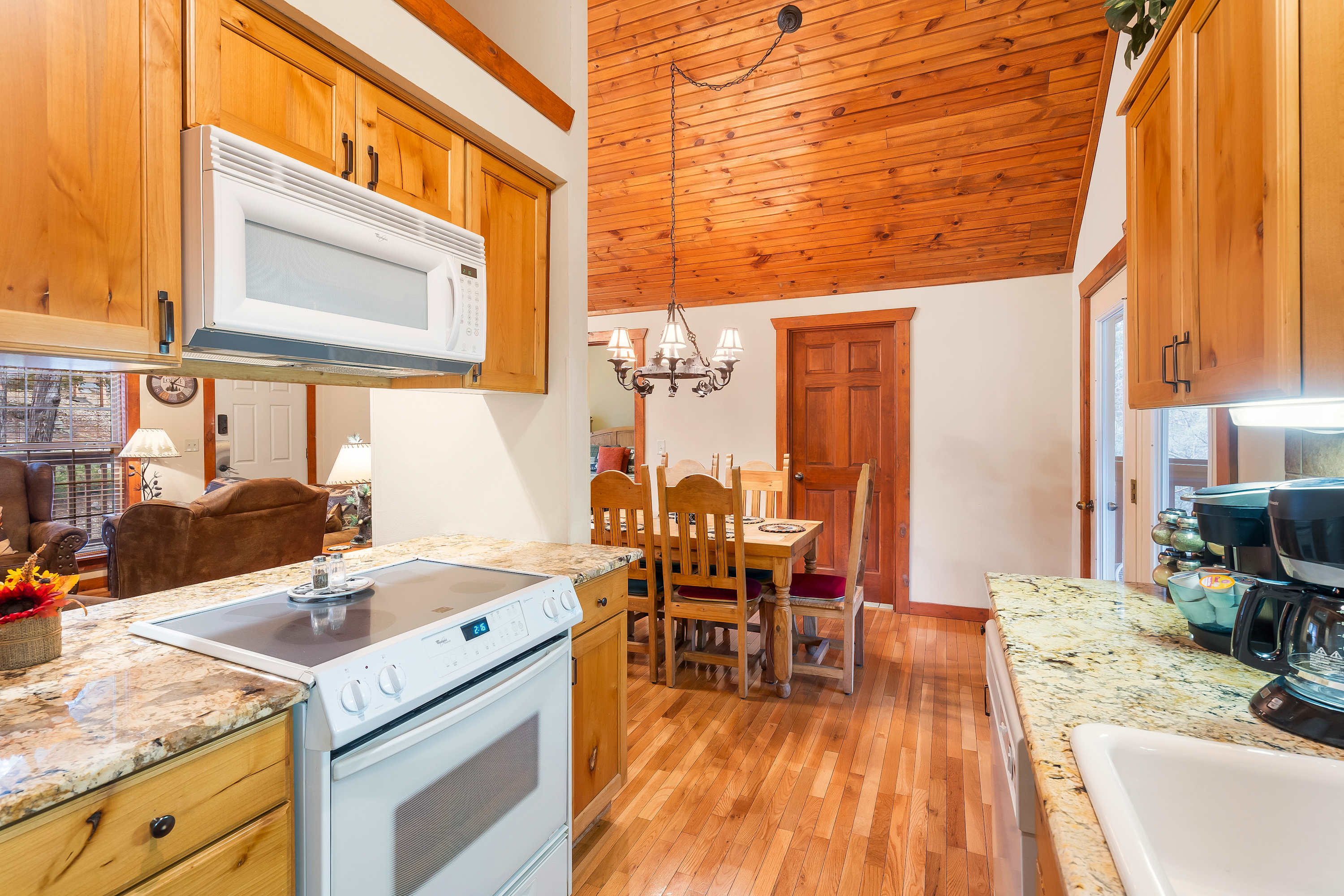 Your immersive experience into this natural wonderland continues even indoors, where warm wood trim and accents combine with rustic-chic décor to create a desirable cozy cabin atmosphere. Host a family movie night in the living room while relaxing on comfortable sofa and armchair seating. The seasonal fireplace will keep you warm and toasty in the cooler months, fostering an ambiance that inspires togetherness. The country-style kitchen is well-equipped for all your mealtime needs, offering ample counterspace and cabinetry stocked with cookware and dining ware. Gather the crew for formal meals at the dining room table with seating for 6, or head out onto the spacious screened-in deck to take your meals al fresco amongst the sights and sounds of the surrounding landscape.