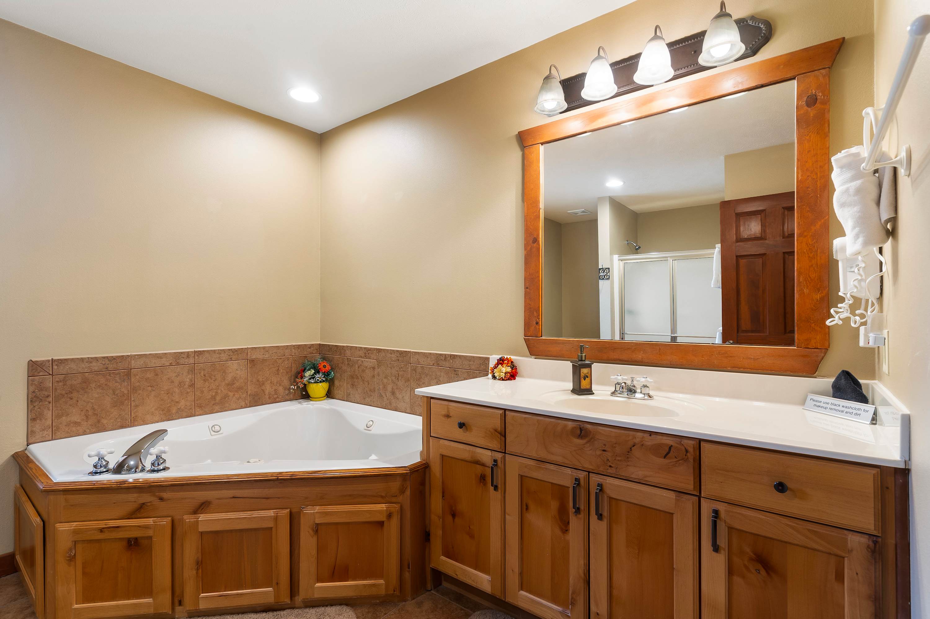 Bedroom #1 includes a king size bed, TV, and ensuite bathroom with a single vanity, soaking tub, and walk-in shower.