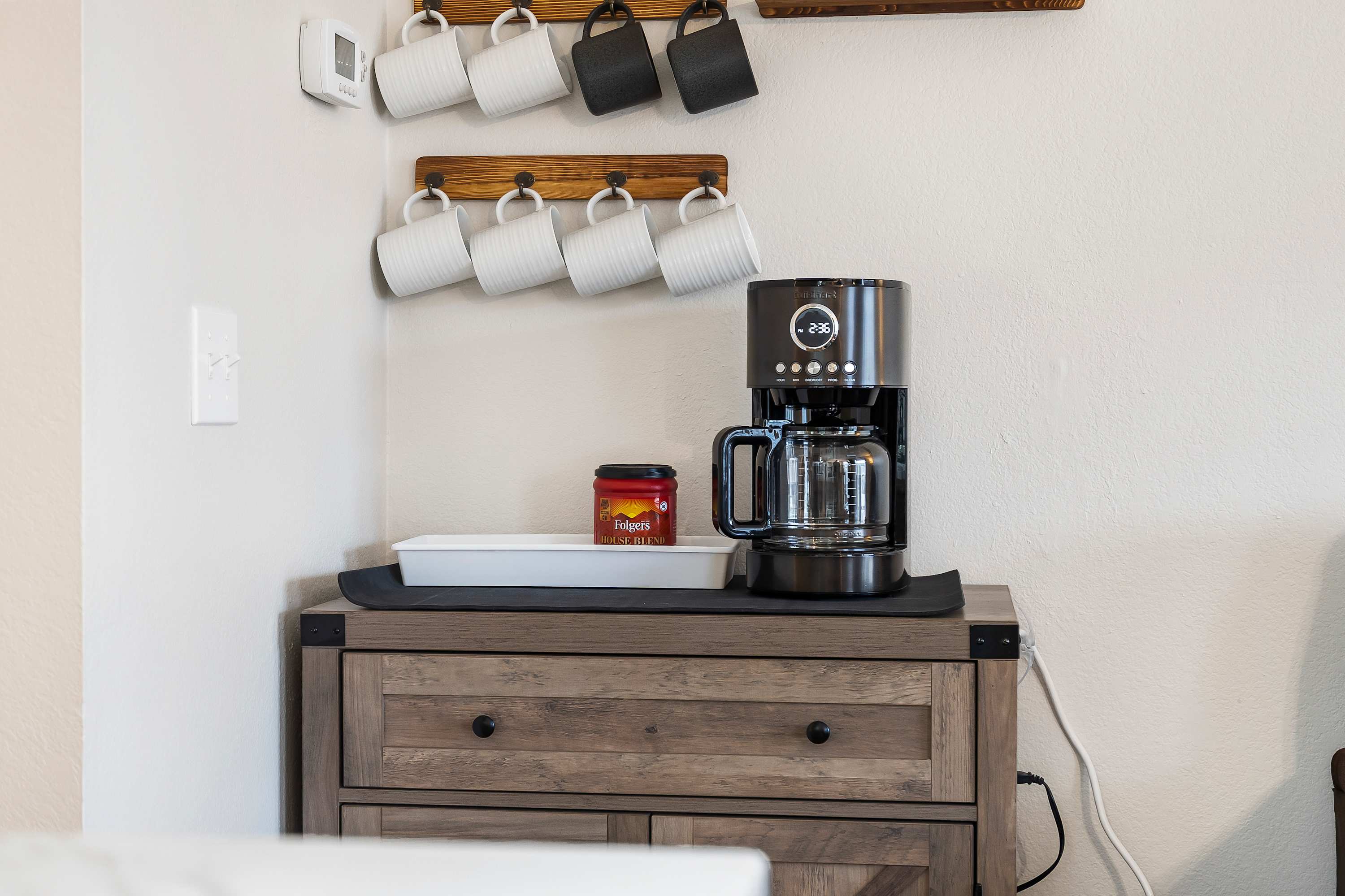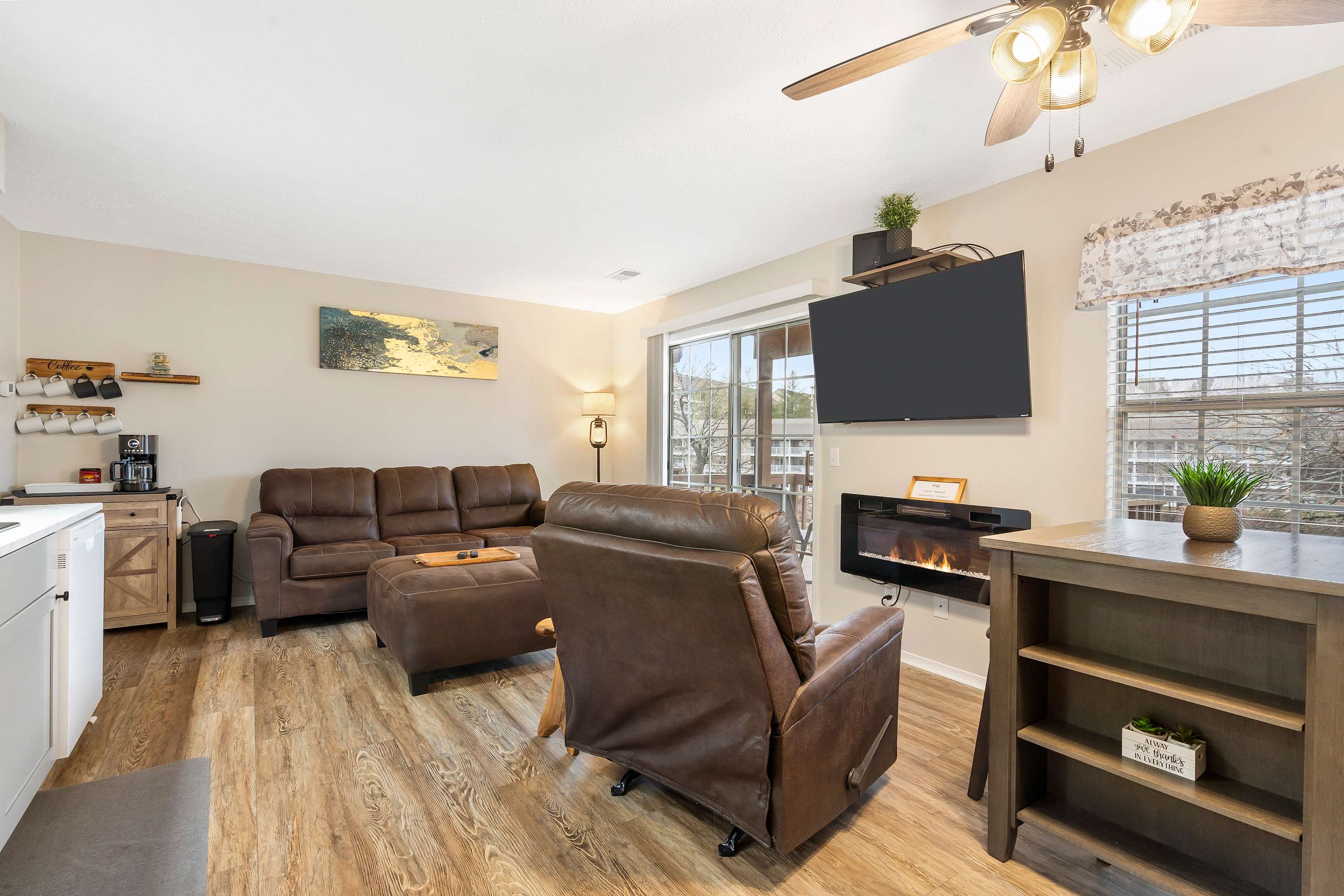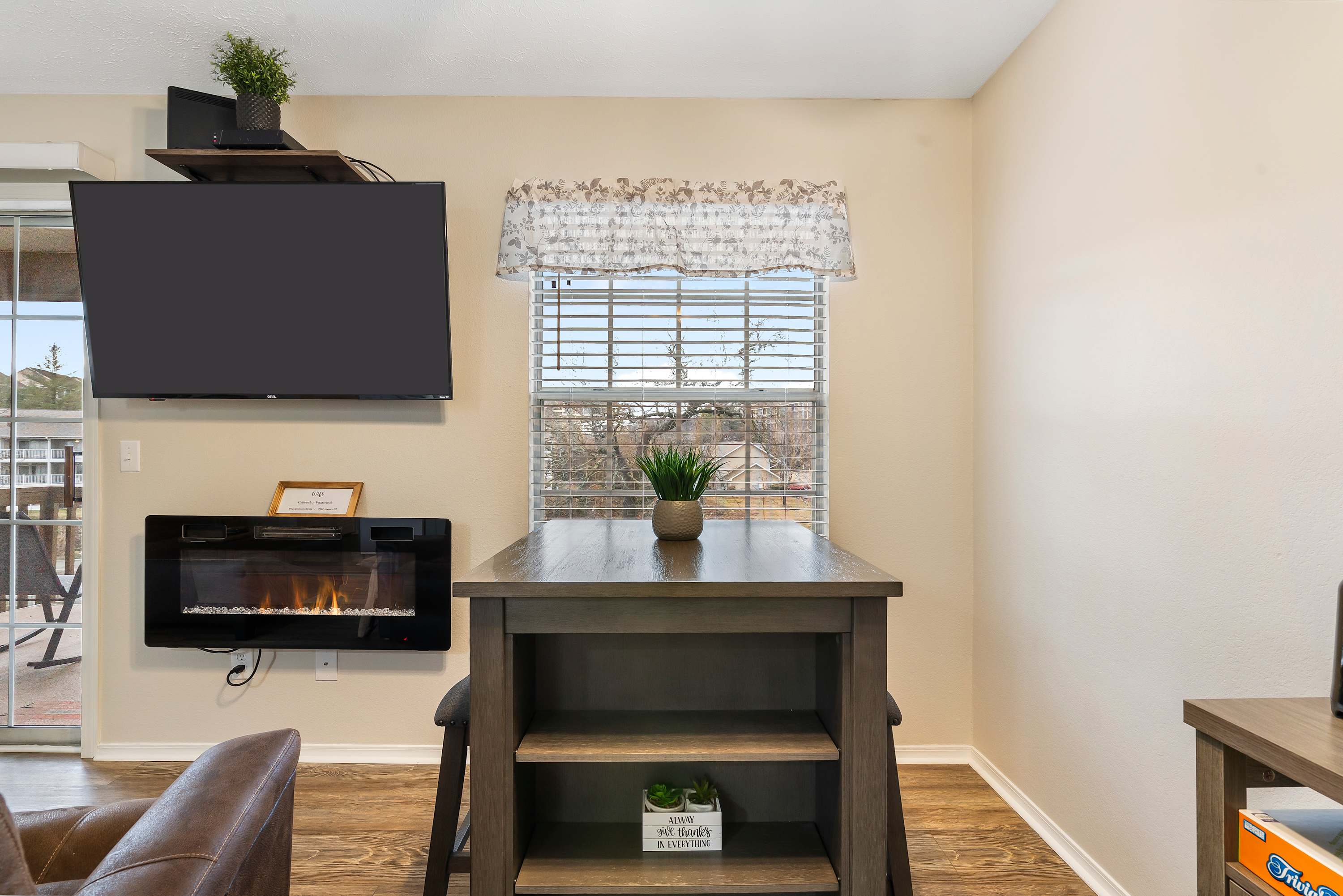 The cozy and updated interior showcases contemporary furnishings surrounded by chic décor, with modern amenities providing you with all the comforts of home. Kick up your feet in the living room on plush sofa and recliner seating while you stream episodes of your favorite shows on the smart TV. The electric fireplace is as much form as it is function, illuminating the space in warmth and ambiance. The well-equipped kitchen can assist in all your culinary aspirations whether planning a spread of afternoon appetizers or whipping up full breakfast. The café table offers seating for 2, suitable for both dining and breaking out the board games. Hit up the coffee bar first thing in the morning and brew up a fresh cup to enjoy out on the breezy balcony as you take in the serenity of the surrounding landscape.