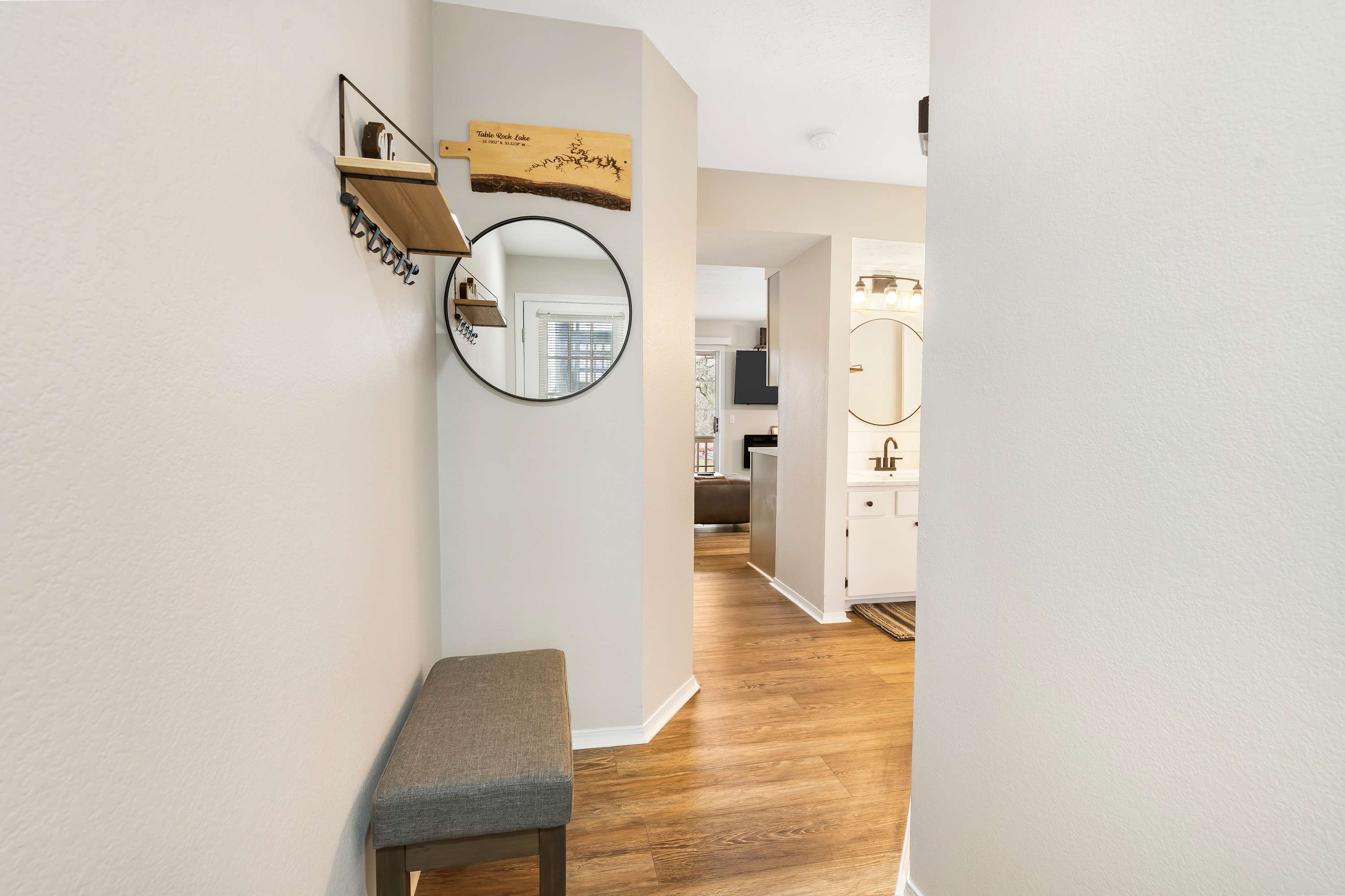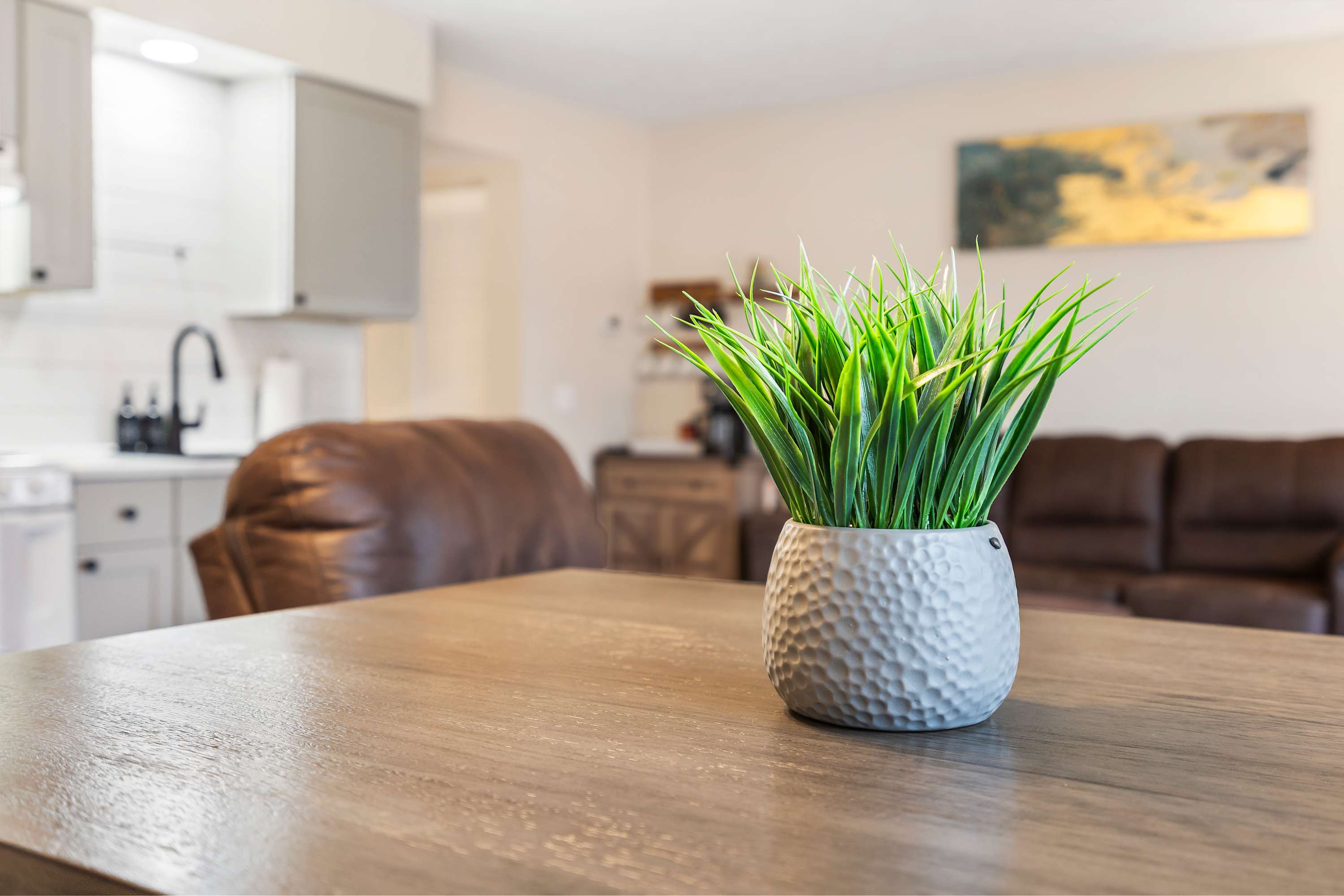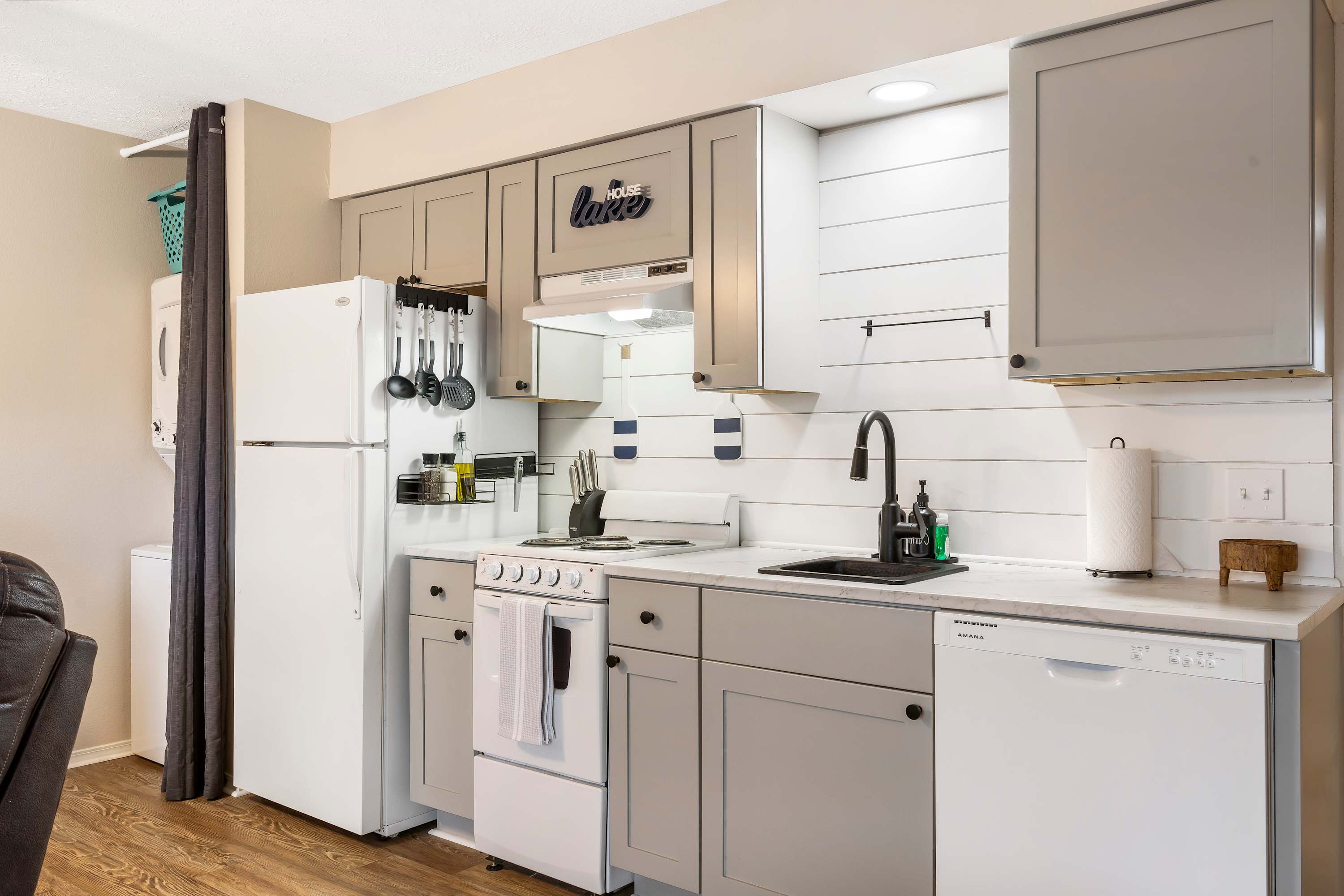 The cozy and updated interior showcases contemporary furnishings surrounded by chic décor, with modern amenities providing you with all the comforts of home. Kick up your feet in the living room on plush sofa and recliner seating while you stream episodes of your favorite shows on the smart TV. The electric fireplace is as much form as it is function, illuminating the space in warmth and ambiance. The well-equipped kitchen can assist in all your culinary aspirations whether planning a spread of afternoon appetizers or whipping up full breakfast. The café table offers seating for 2, suitable for both dining and breaking out the board games. Hit up the coffee bar first thing in the morning and brew up a fresh cup to enjoy out on the breezy balcony as you take in the serenity of the surrounding landscape.
