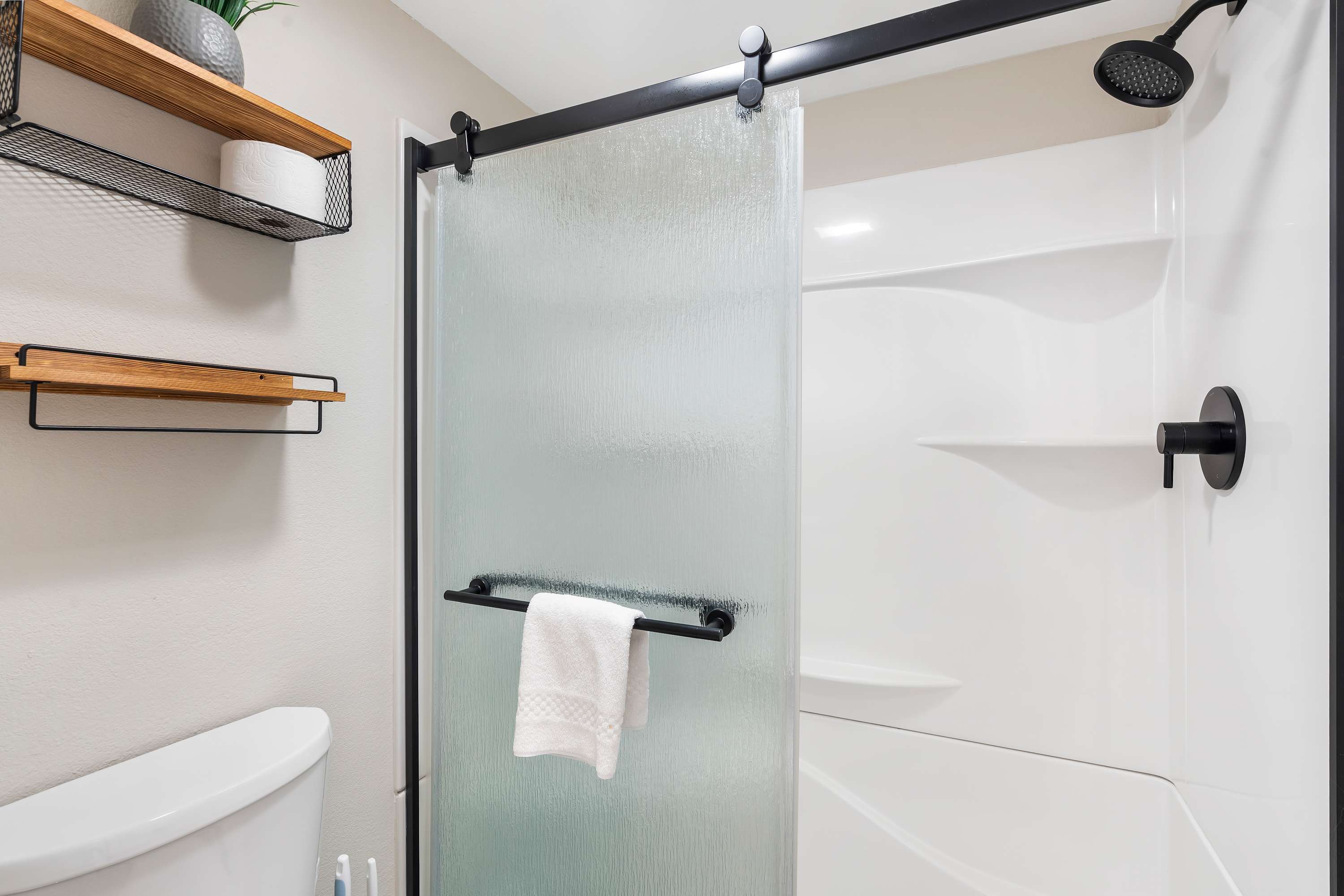 This home comfortably sleeps 4 guests between 1 private bedroom and a queen size sleeper sofa in the living room. The bedroom includes a luxurious king size bed fitted with crisp linens and soft blankets for a great night’s sleep. The modern ensuite bathroom includes a spacious dual vanity and glass walk-in shower.