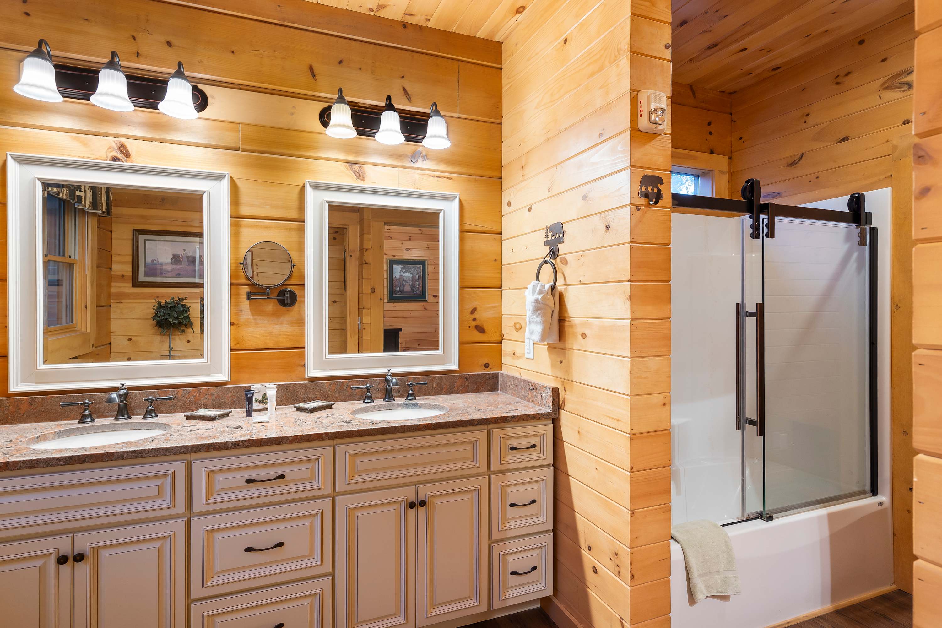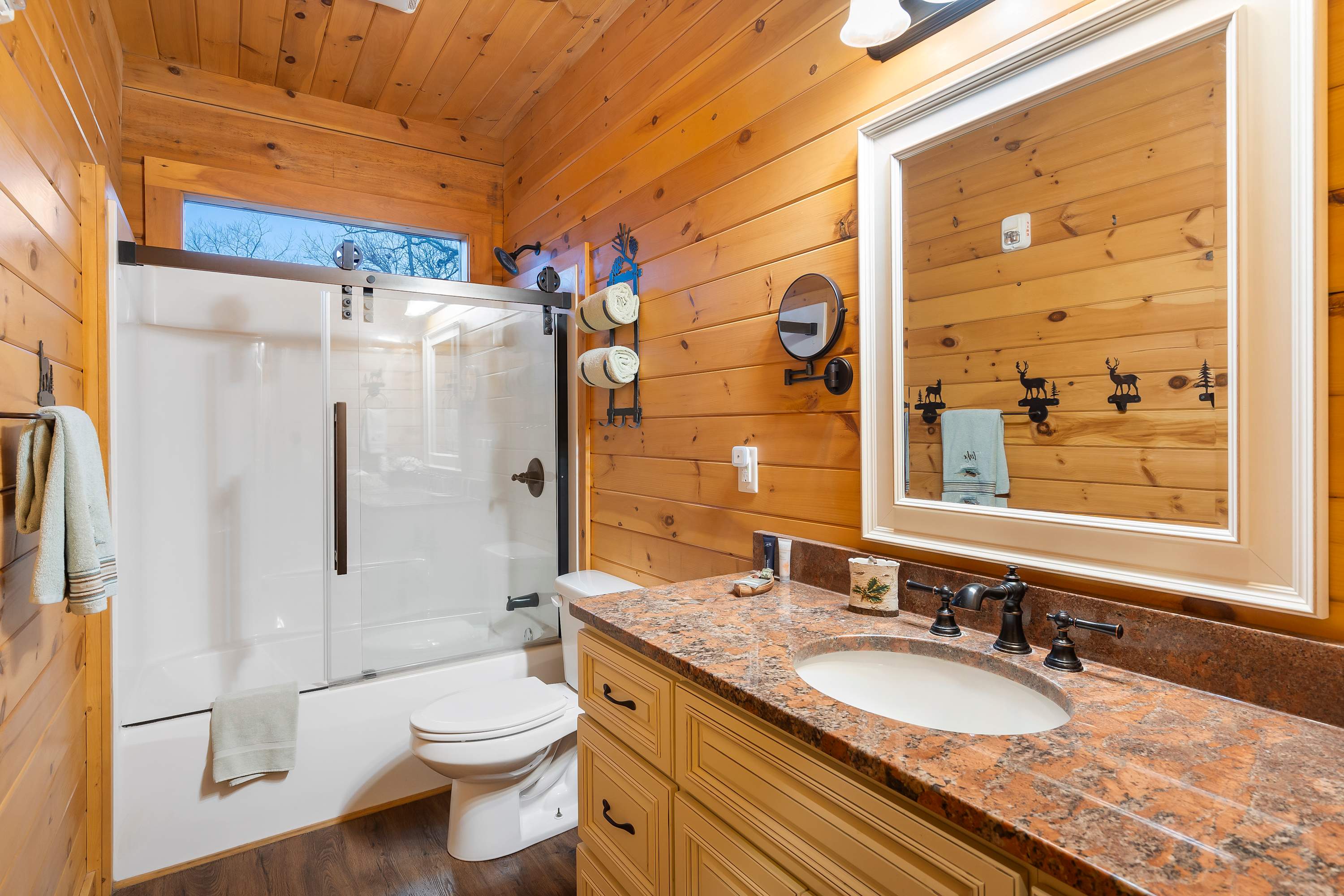 The home also includes an additional full guest bathroom with a single vanity and shower/tub combo.