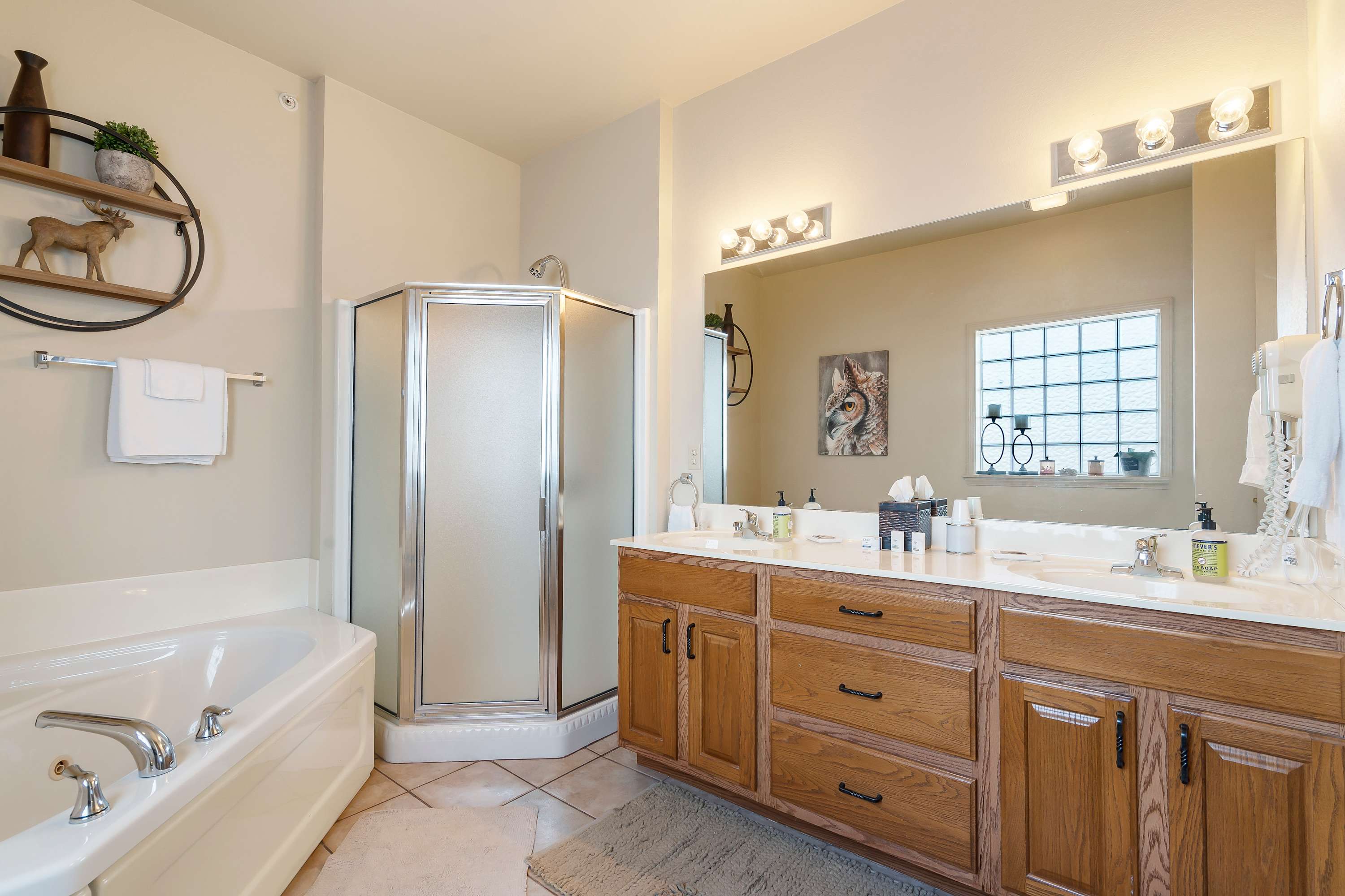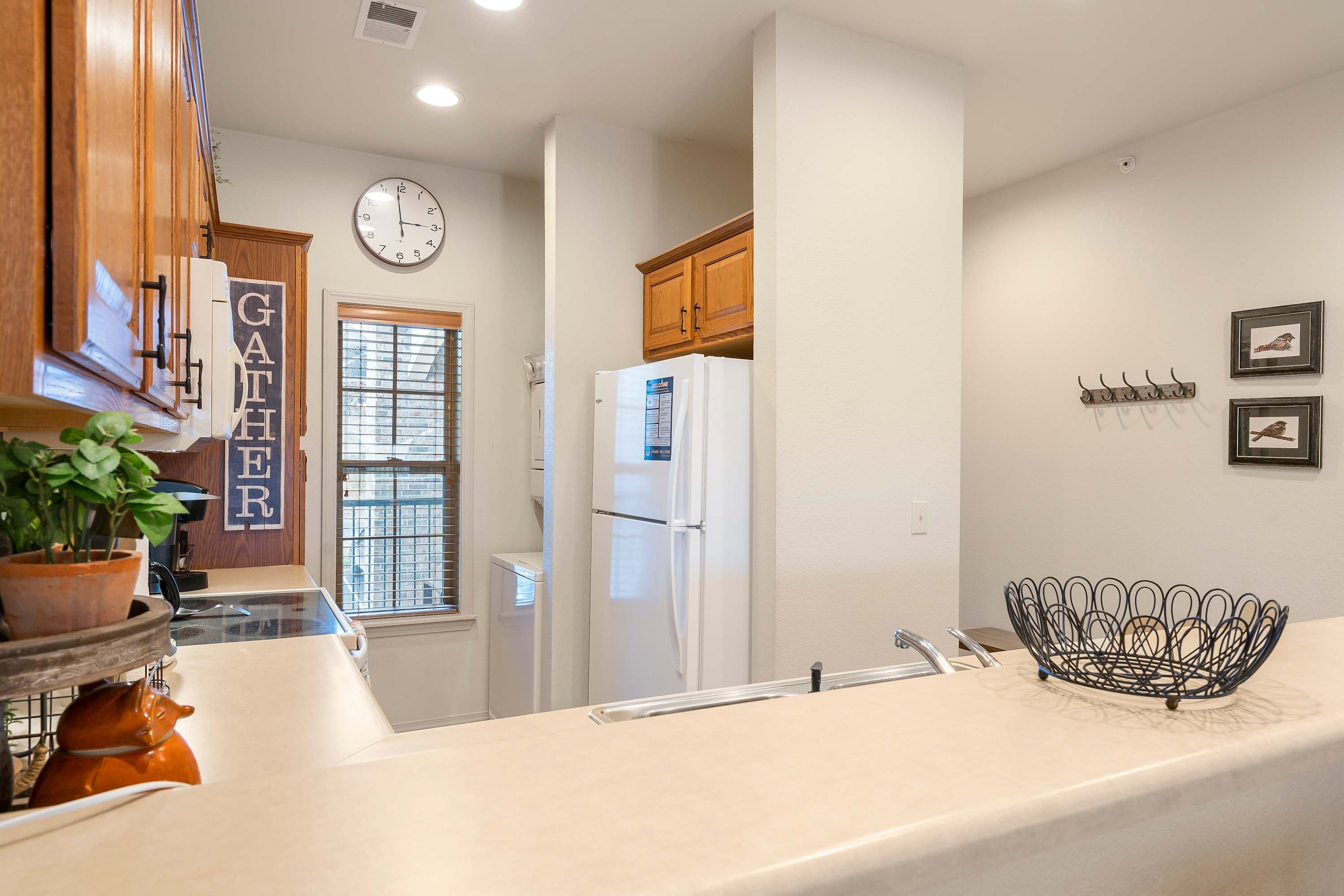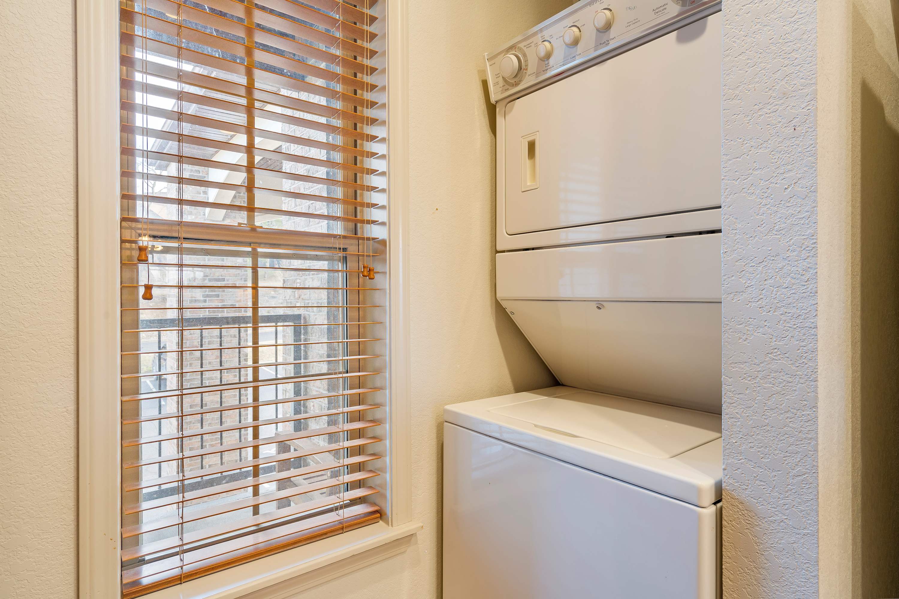 The home’s spacious interior offers comfortable spaces that welcome both relaxation and entertainment, complemented by contemporary furnishings and sophisticated décor. Sink into plush living room sofa seating while you catch up on episodes of your favorite show on the smart TV with cable. Seamlessly blend indoor and outdoor living spaces together by opening the sliding door to the shaded balcony, offering even more options for casual seating while catching up on the day’s adventures. Make your way back inside to the fully equipped kitchen, well stocked with cookware and dining ware for the convenience of whipping up delicious meals right at home. Grab a seat at the counter for a quick breakfast before heading out the door or gather the crew for formal meals at the dining room table, seating 6.