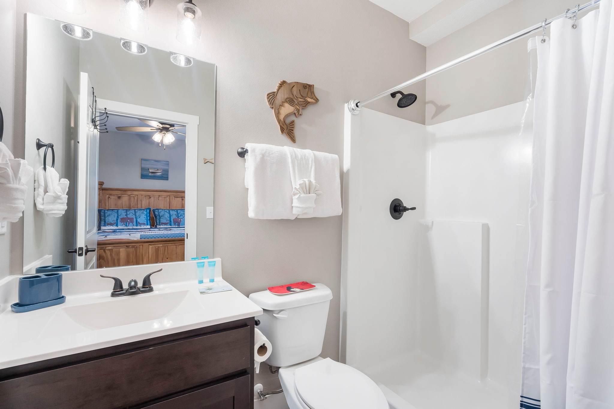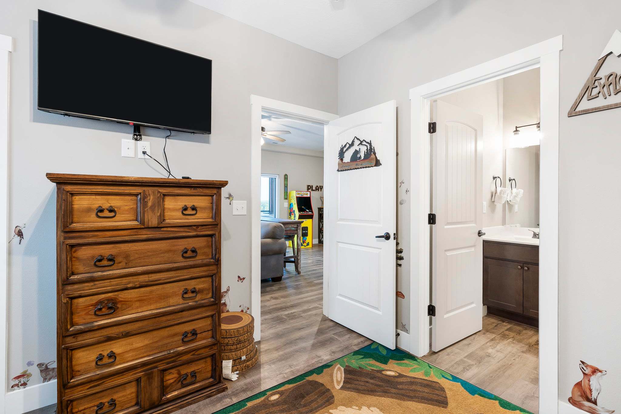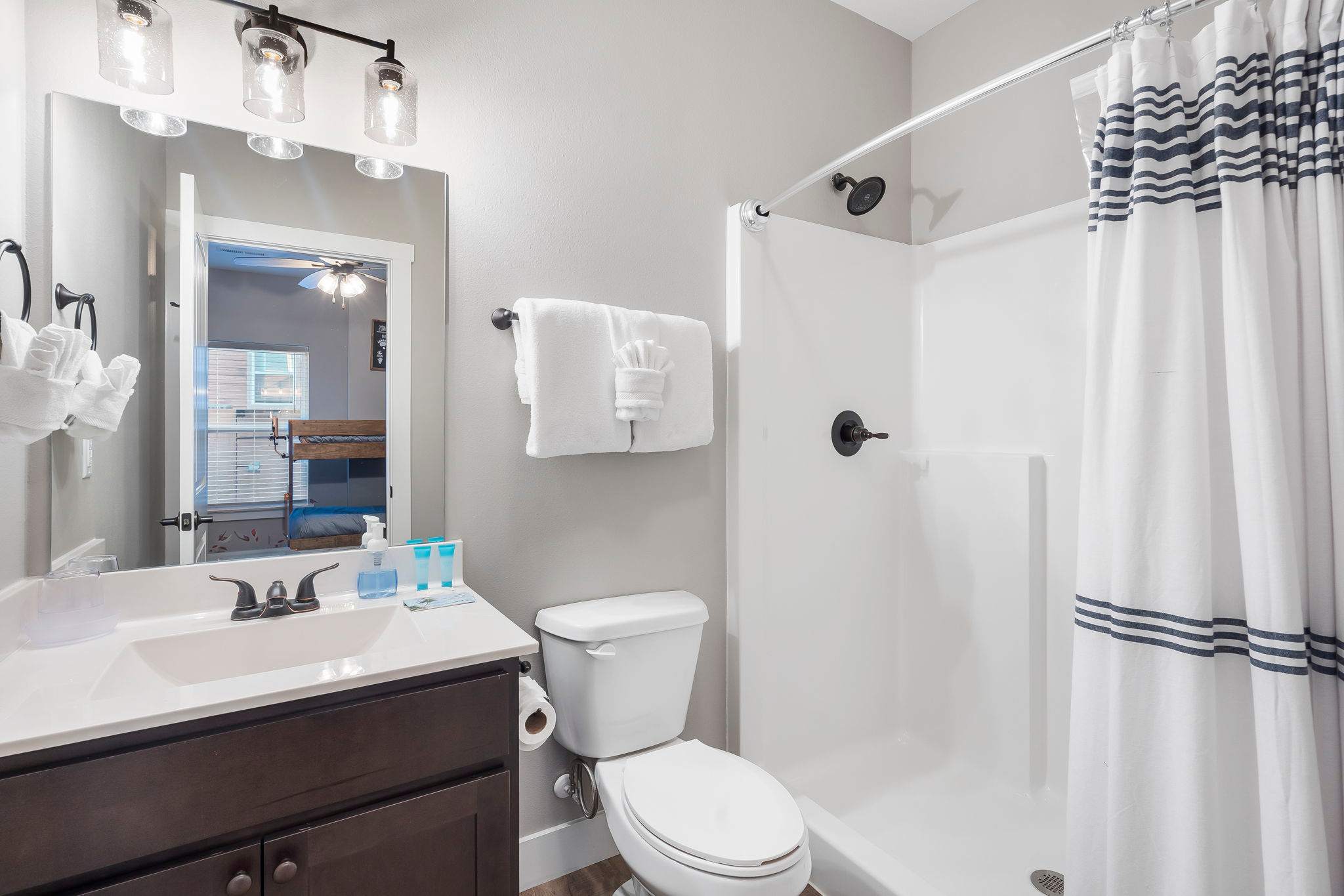 Bedroom #3, on the lower level, includes 2 twin-over-twin bunk beds, a smart TV, and ensuite bathroom with a single vanity and walk-in shower.