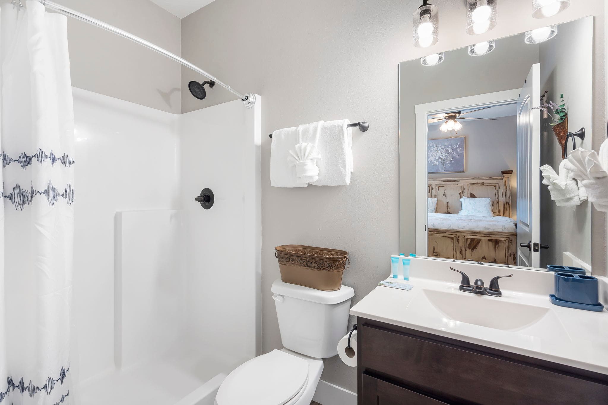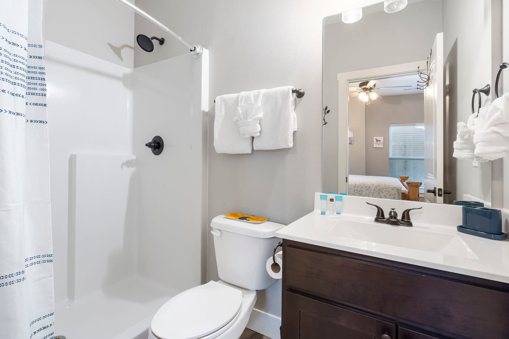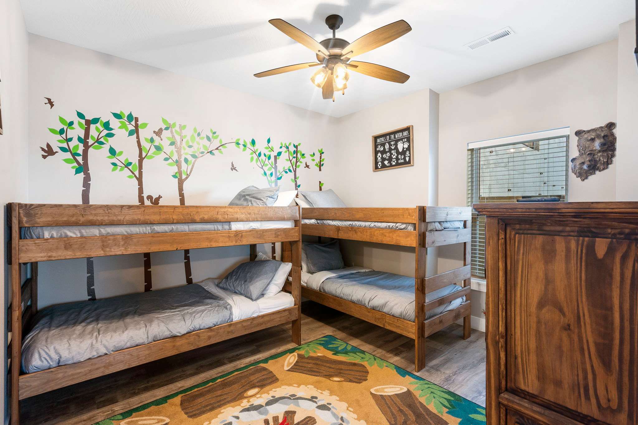 Bedroom #3, on the lower level, includes 2 twin-over-twin bunk beds, a smart TV, and ensuite bathroom with a single vanity and walk-in shower.
