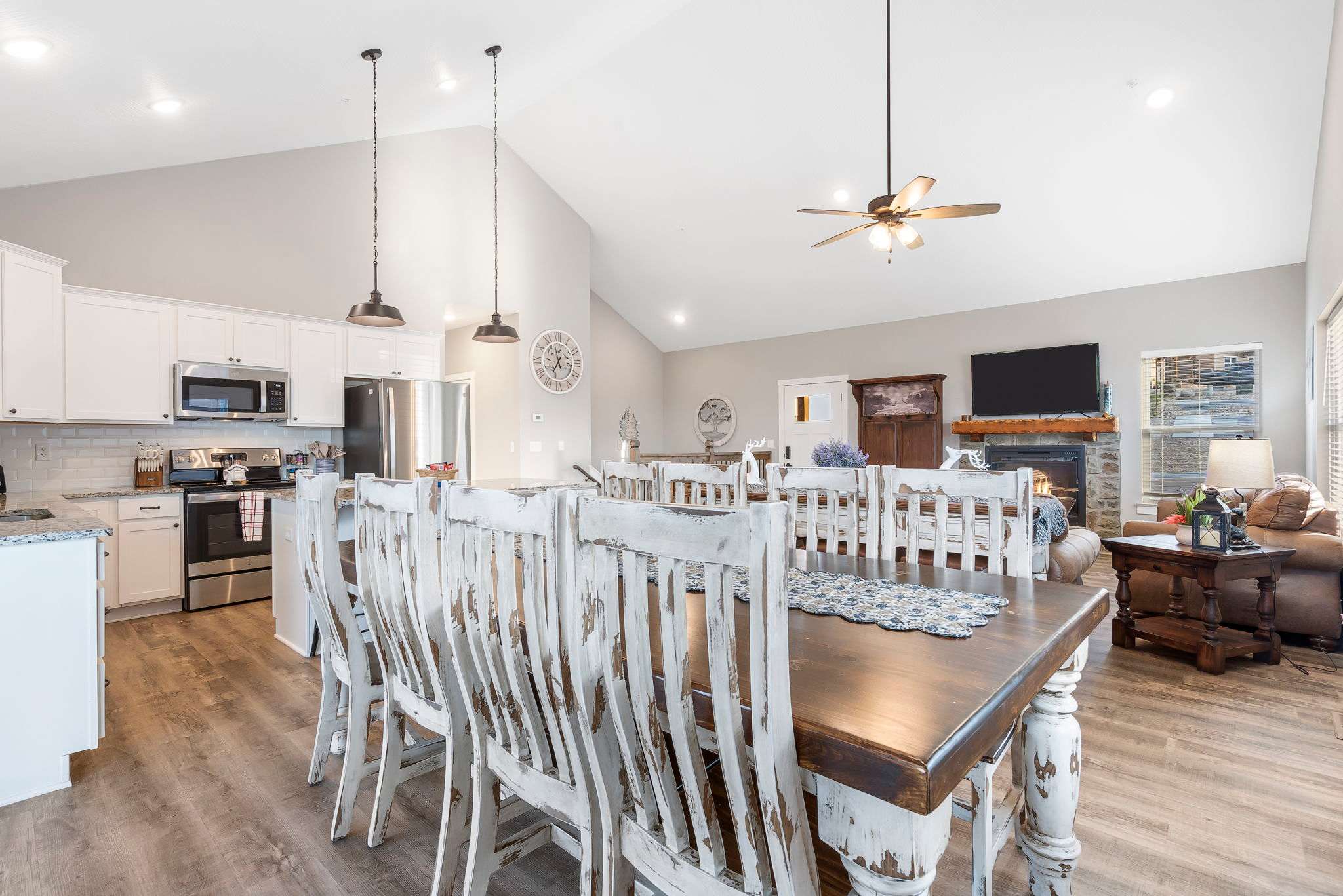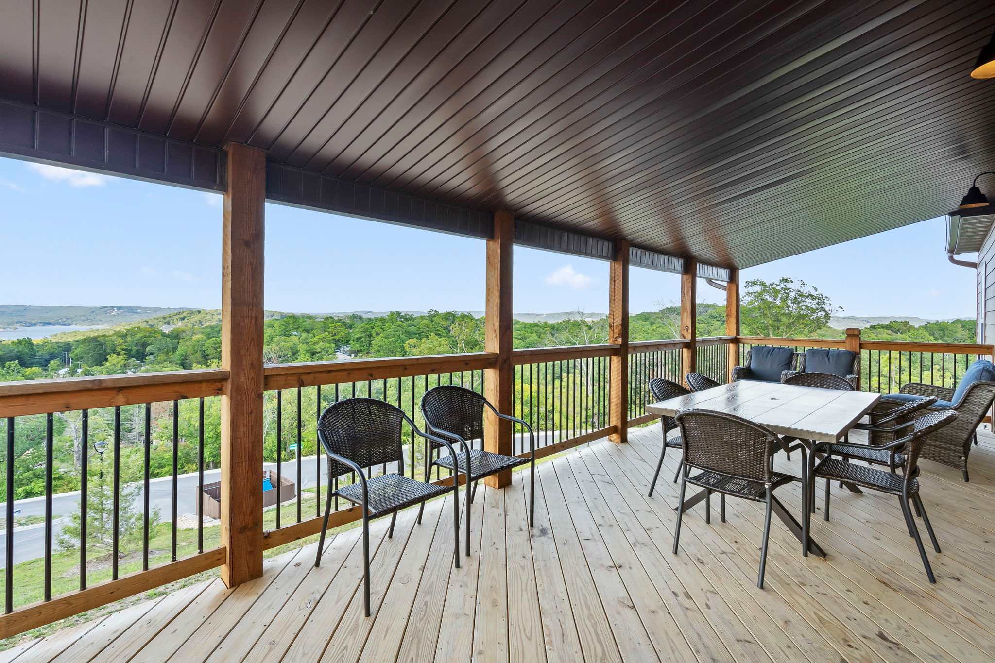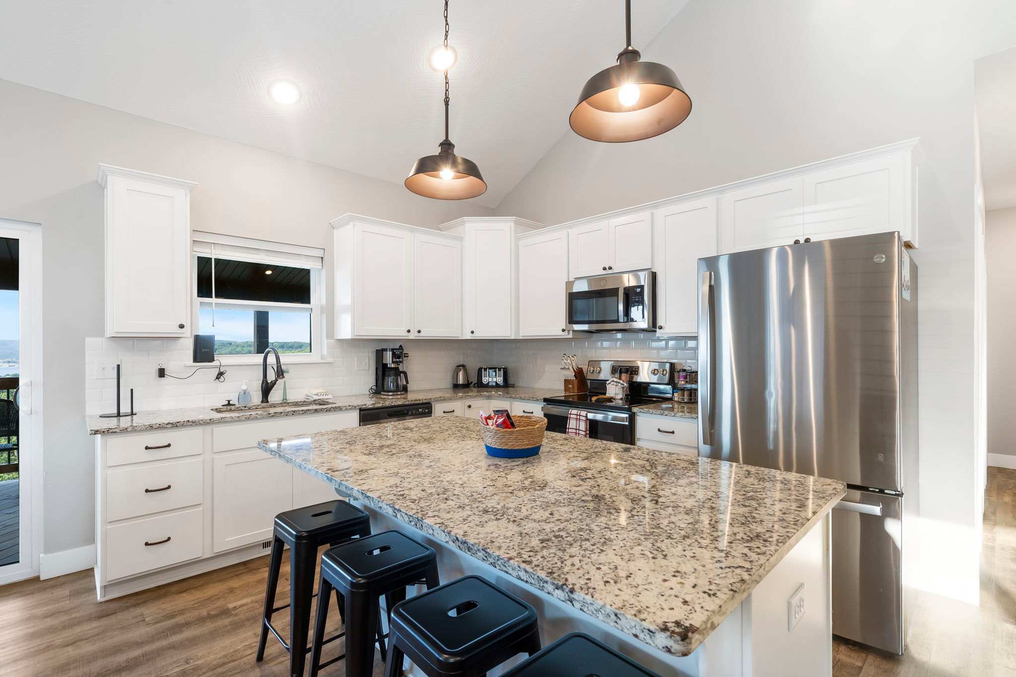 Enjoy dramatic sunsets over the expansive views of Table Rock Lake and the Kimberling City Bridge from the home’s upper deck or lower-level screened-in patio as you relax on the outdoor seating with a refreshing drink in hand. The bubbling hot tub will help you soak all your cares away at the end of long days exploring the area. Heading inside, the main level’s bright and fresh interior showcases a soaring vaulted ceiling and open spaces conducive to both comfort and entertainment, with plenty of room for gathering family and friends. Each space has been thoughtfully curated with furnishings and décor intent on providing a comfortable, rustic cabin vibe. Sink in to plush leather sofas while you stream your favorite shows on the large mounted smart TV. The electric fireplace is as much form as it is function, providing warmth throughout the room during colder nights and months. Steps away, the modern kitchen showcases stainless steel appliances, granite countertops, and cabinetry stocked with cookware and dining ware. Dine together at the stylish table with seating for 8 or take more casual bites at the island on high-top stool seating for 4. Heading downstairs, you’ll find a second living space complete with its own spacious sofa, board games, and smart TV along with a Pac-Man arcade game when you want to tap into your competitive side.