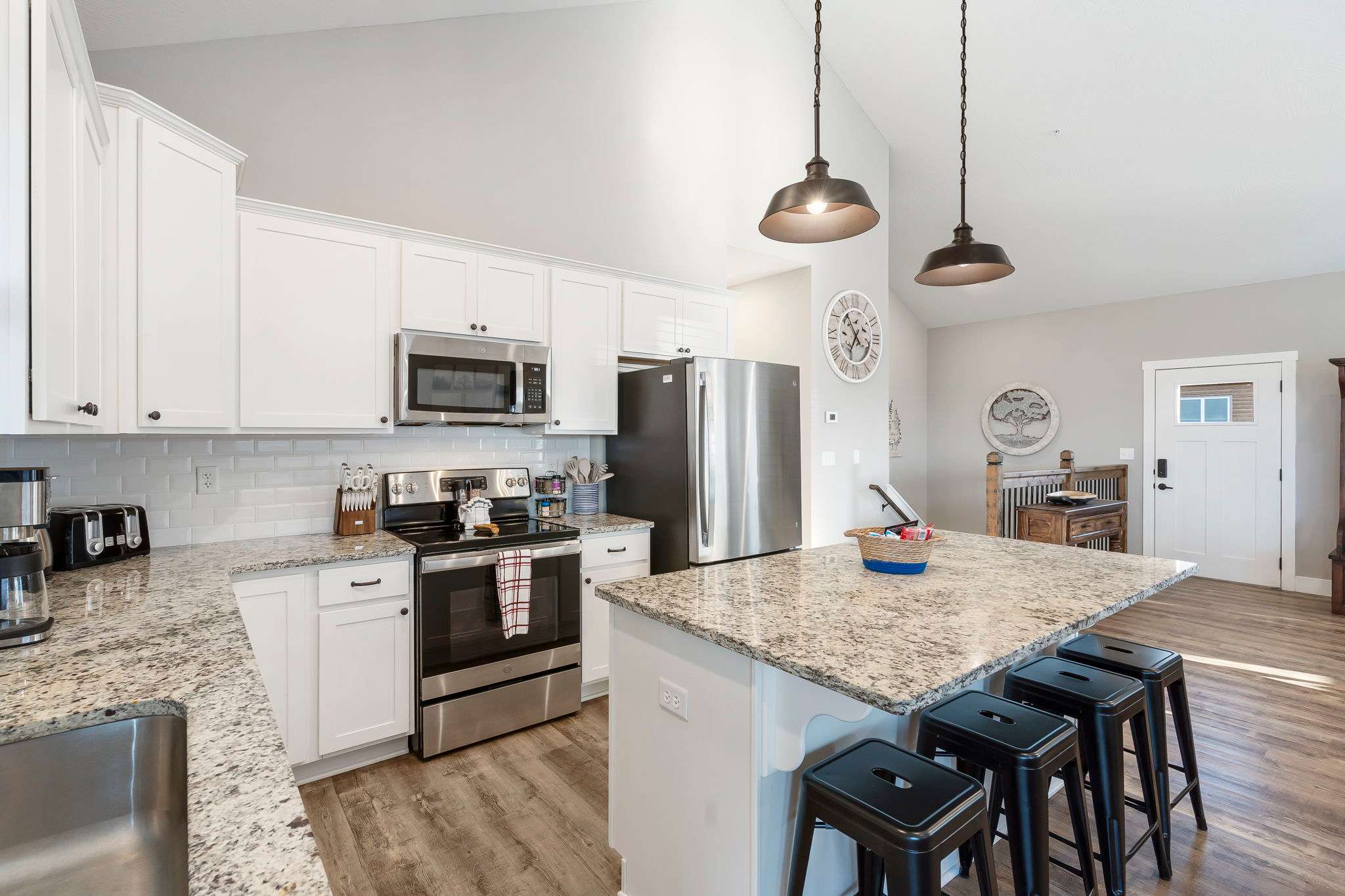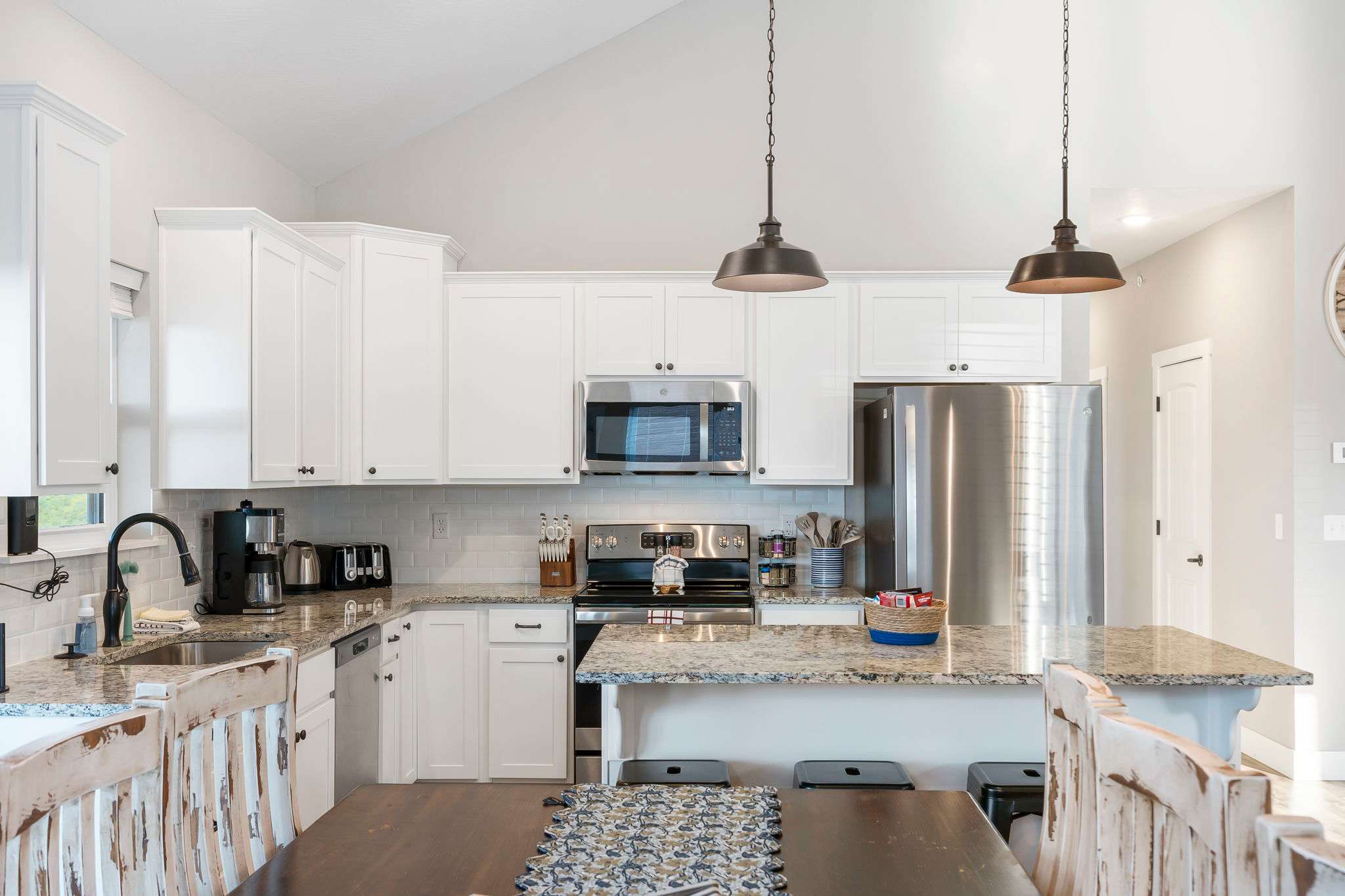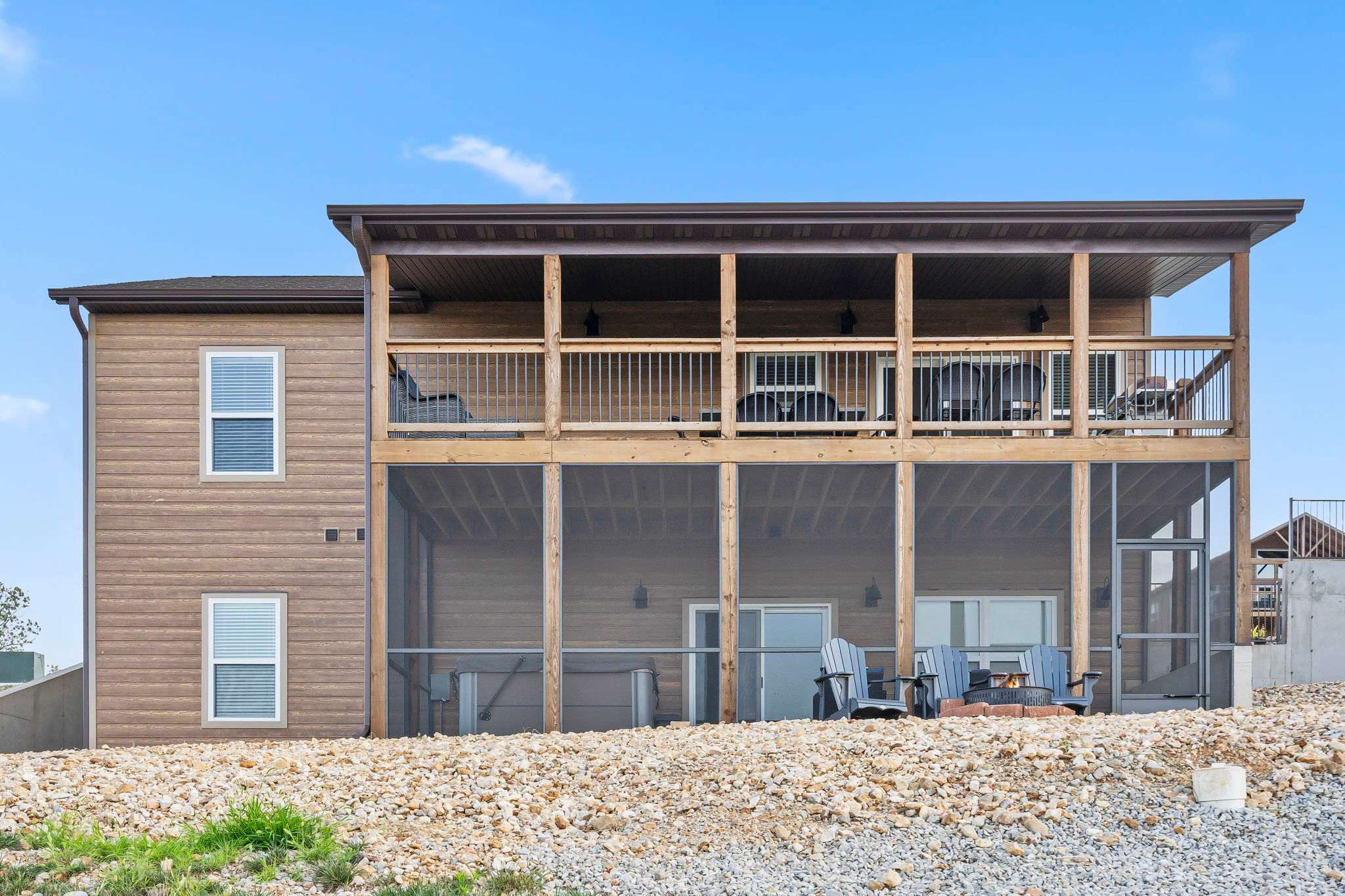 Enjoy dramatic sunsets over the expansive views of Table Rock Lake and the Kimberling City Bridge from the home’s upper deck or lower-level screened-in patio as you relax on the outdoor seating with a refreshing drink in hand. The bubbling hot tub will help you soak all your cares away at the end of long days exploring the area. Heading inside, the main level’s bright and fresh interior showcases a soaring vaulted ceiling and open spaces conducive to both comfort and entertainment, with plenty of room for gathering family and friends. Each space has been thoughtfully curated with furnishings and décor intent on providing a comfortable, rustic cabin vibe. Sink in to plush leather sofas while you stream your favorite shows on the large mounted smart TV. The electric fireplace is as much form as it is function, providing warmth throughout the room during colder nights and months. Steps away, the modern kitchen showcases stainless steel appliances, granite countertops, and cabinetry stocked with cookware and dining ware. Dine together at the stylish table with seating for 8 or take more casual bites at the island on high-top stool seating for 4. Heading downstairs, you’ll find a second living space complete with its own spacious sofa, board games, and smart TV along with a Pac-Man arcade game when you want to tap into your competitive side.