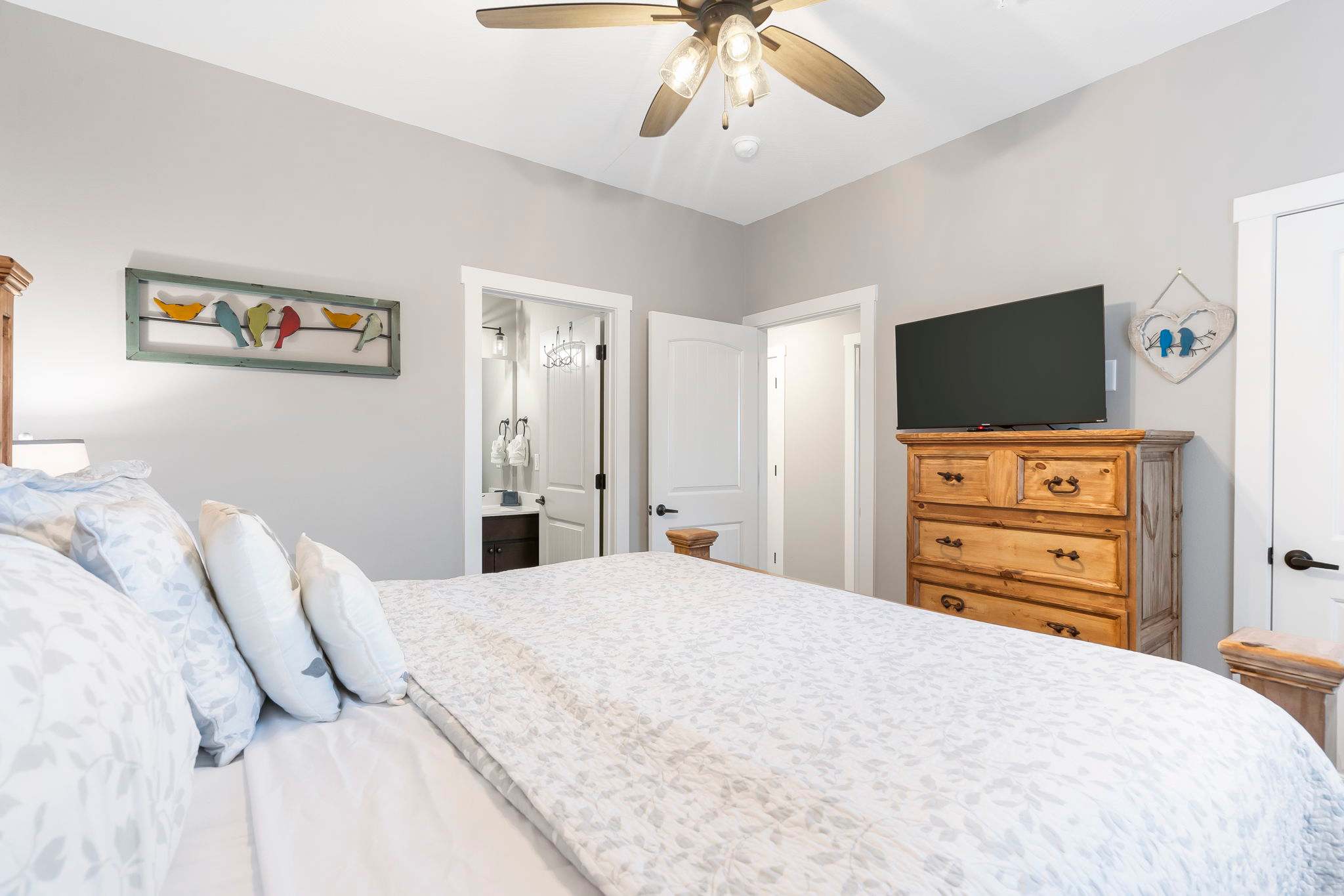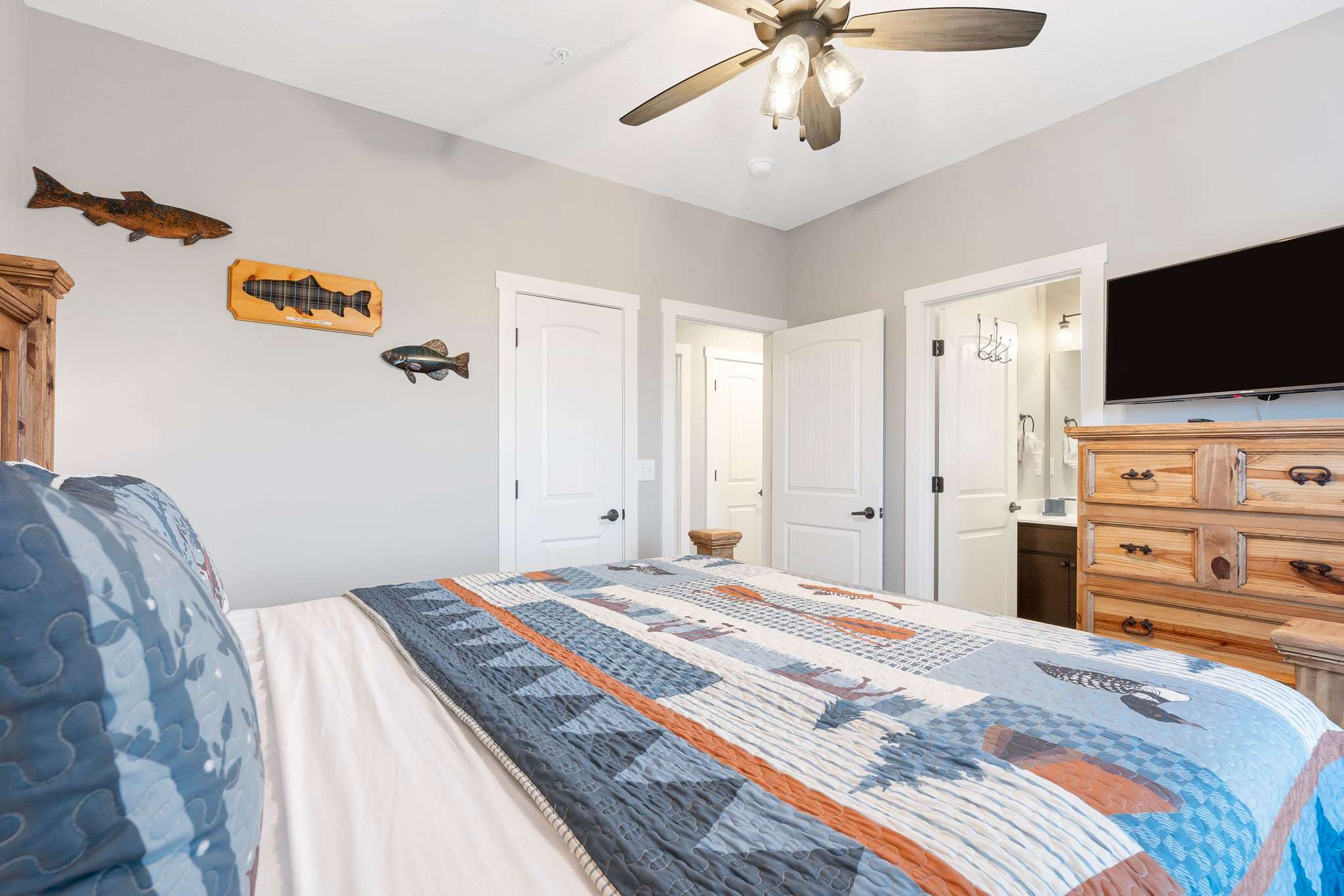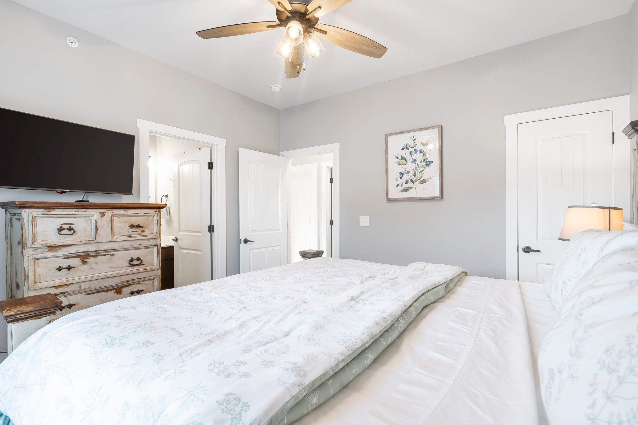Bedroom #2, on the entry level, includes a king-size bed, smart TV, and ensuite bathroom with a single vanity and walk-in shower.