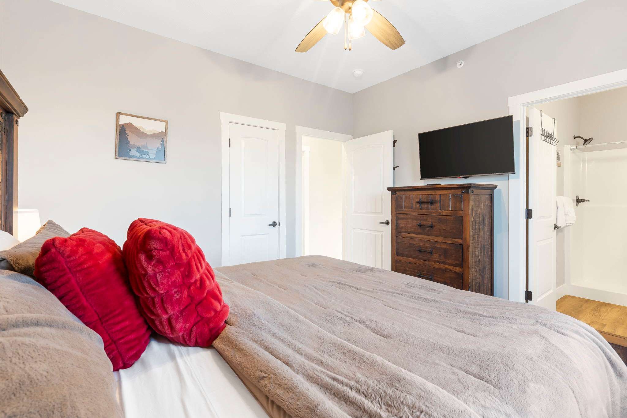 Bedroom #1, on the entry level, includes a king-size bed, smart TV, and ensuite bathroom with a single vanity and walk-in shower.