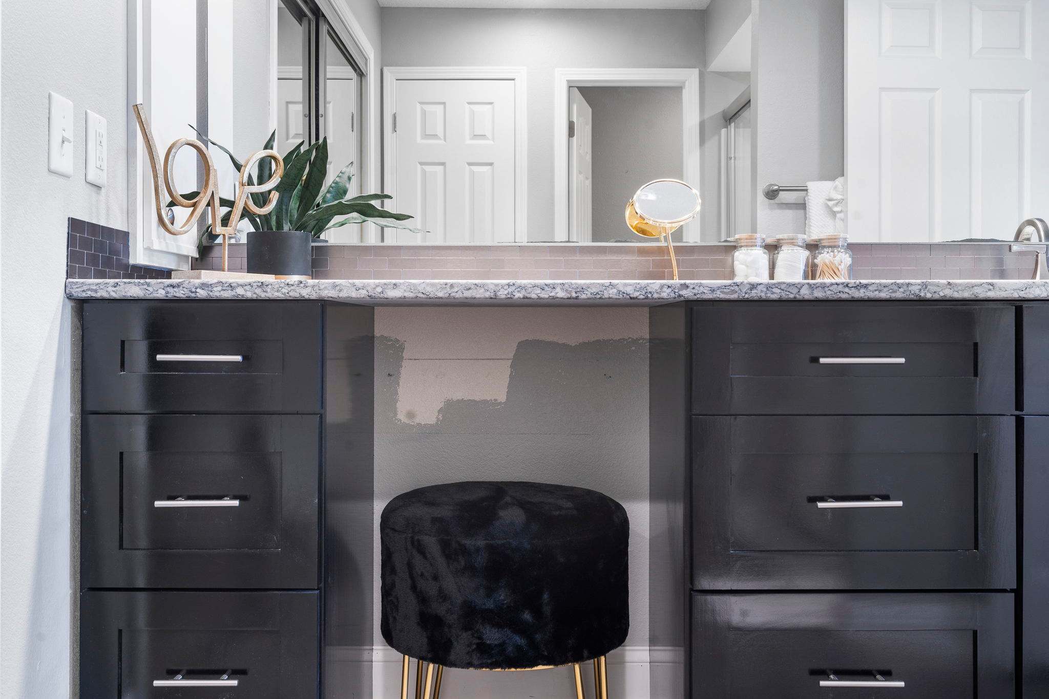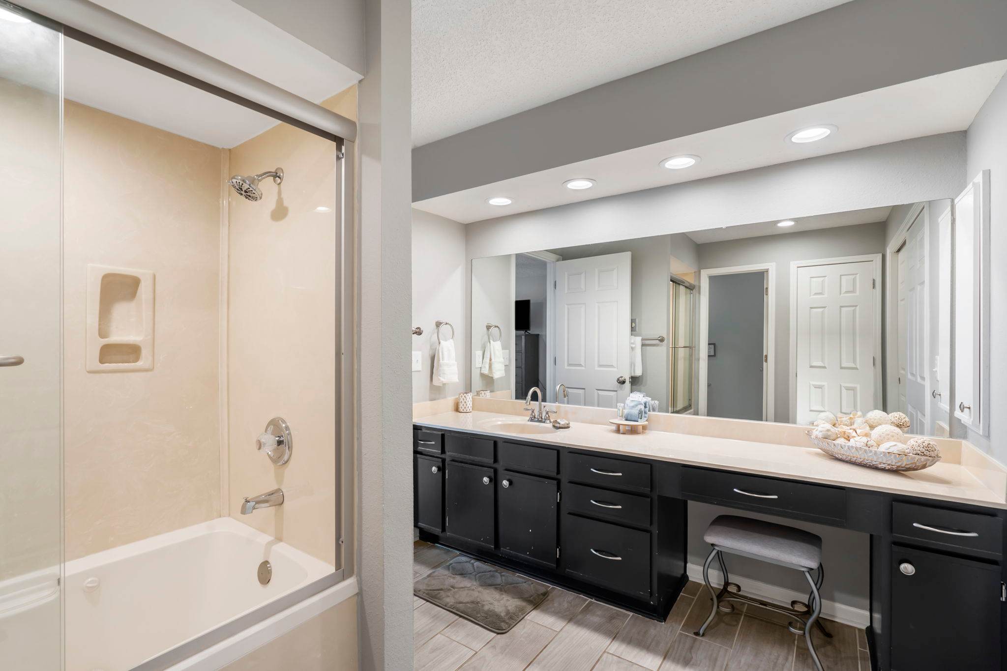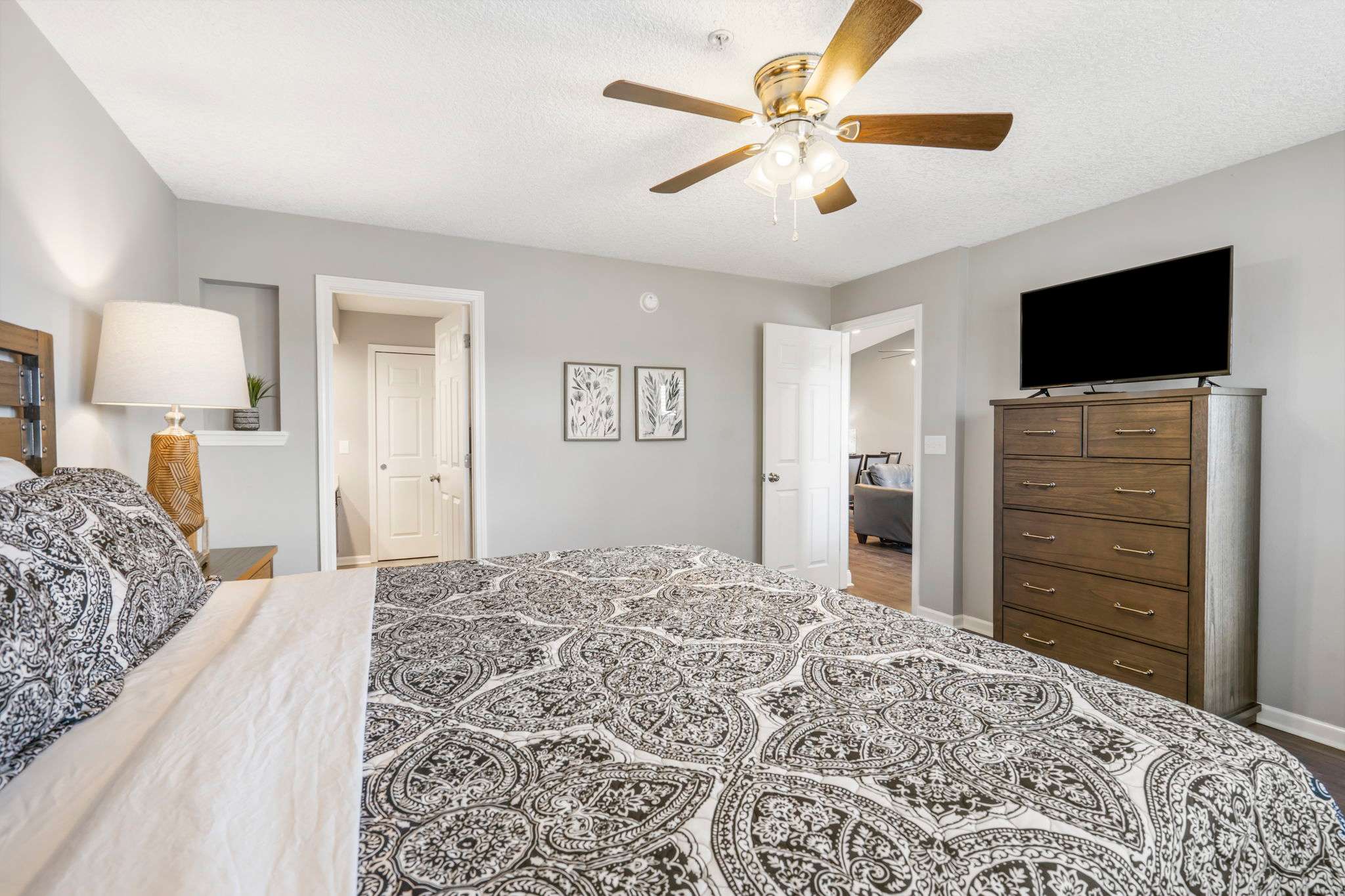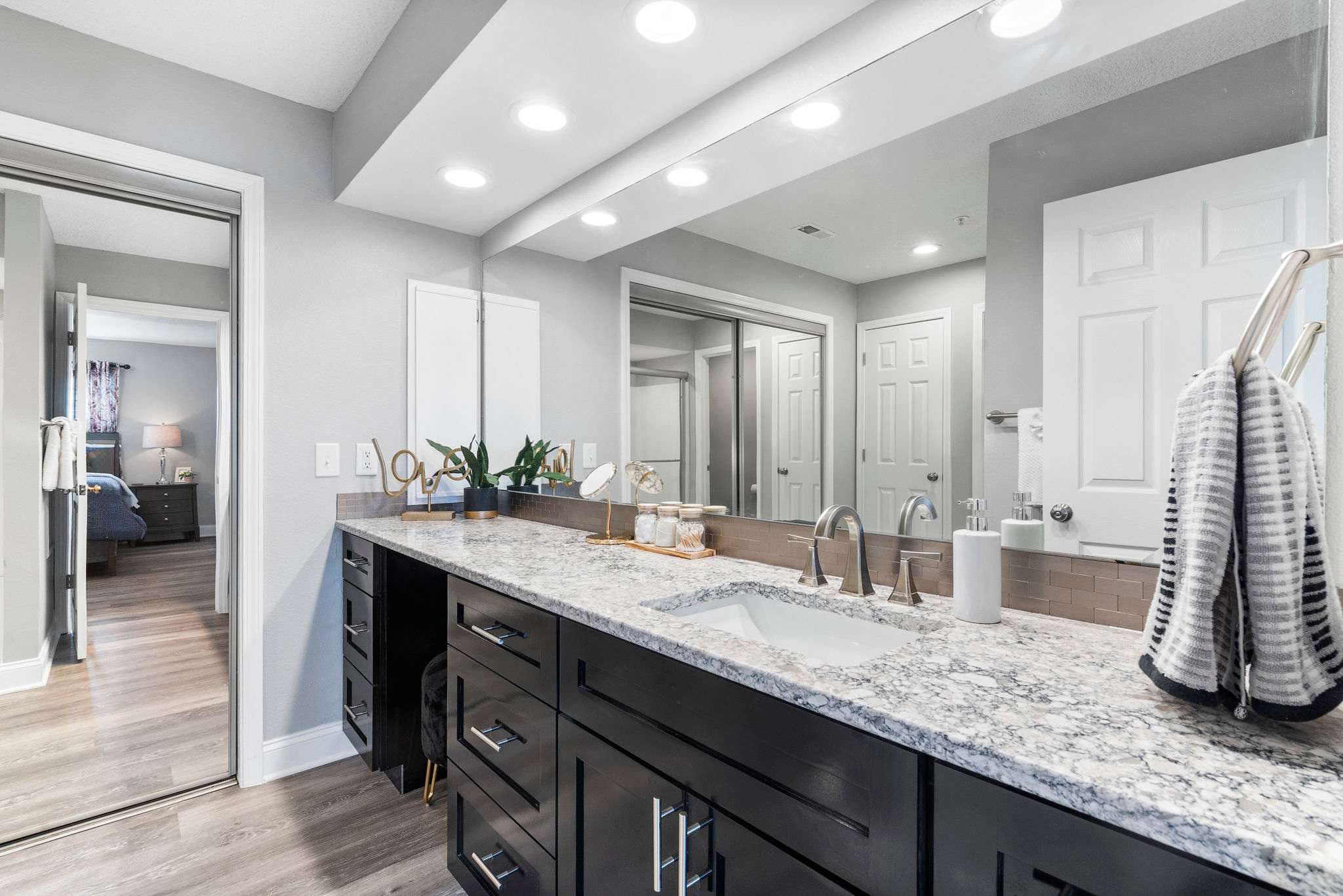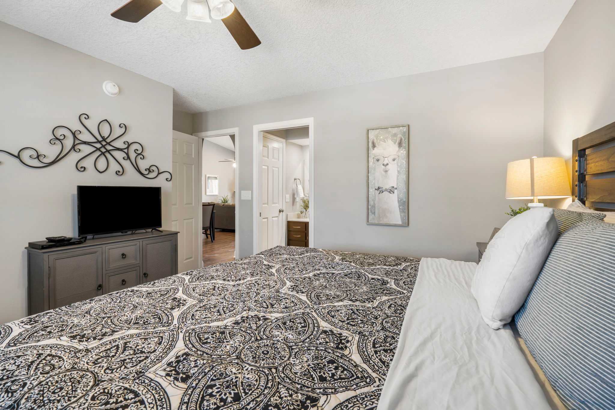 Bedroom #1 includes a king size bed, TV, and ensuite bathroom with an oversized single vanity and shower/tub combo.