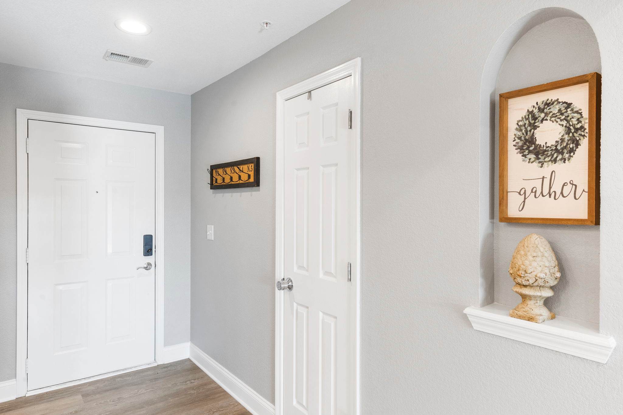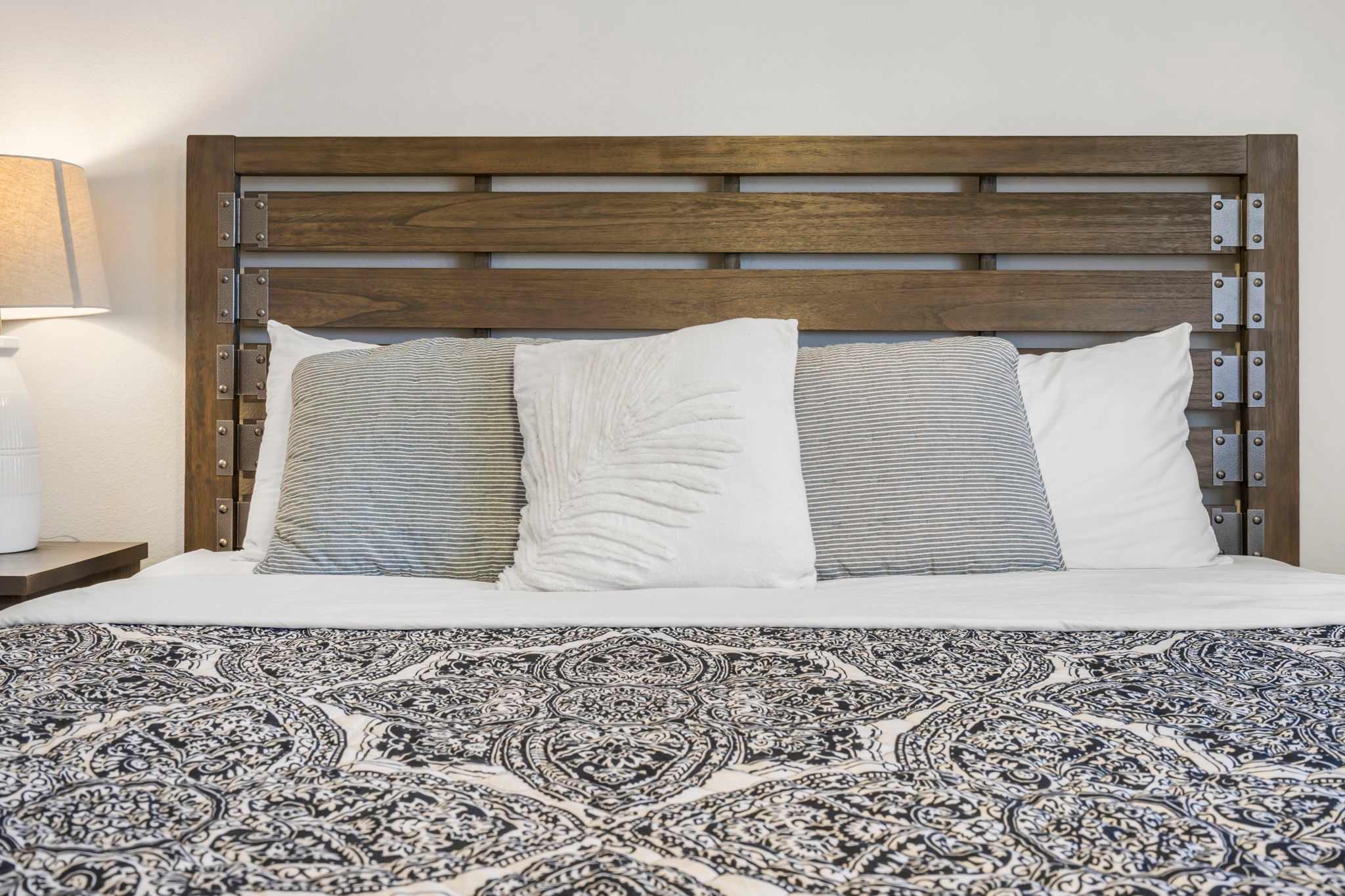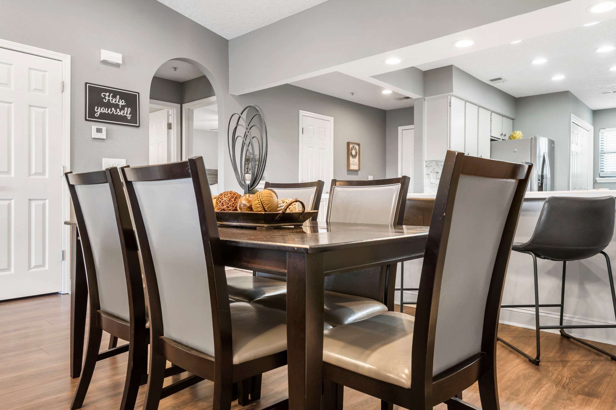 These lovely upper-level condos feature bright and fresh interiors, immaculately furnished and decorated to blend both comfort and design. Spacious kitchens can accommodate a crowd, showcasing updated appliances and cabinets stocked with all the cookware and dining ware you’d need should you decide to prepare delicious homecooked meals. Ample counter space can host meal prep and staging or serve as informal dining on the high-top barstool seating. More formal meals can be taken together at the elegant dining room tables, both offering seating for 6. At the end of long days spent exploring, the living rooms are inviting spaces for an immersive movie night while seated around the electric fireplaces on plush sofas or armchairs. Each home has its own private, shaded balcony for enjoying a night cap or your fresh cup of morning coffee in the fresh air overlooking scenic views of the golf course and the mountainous landscape.