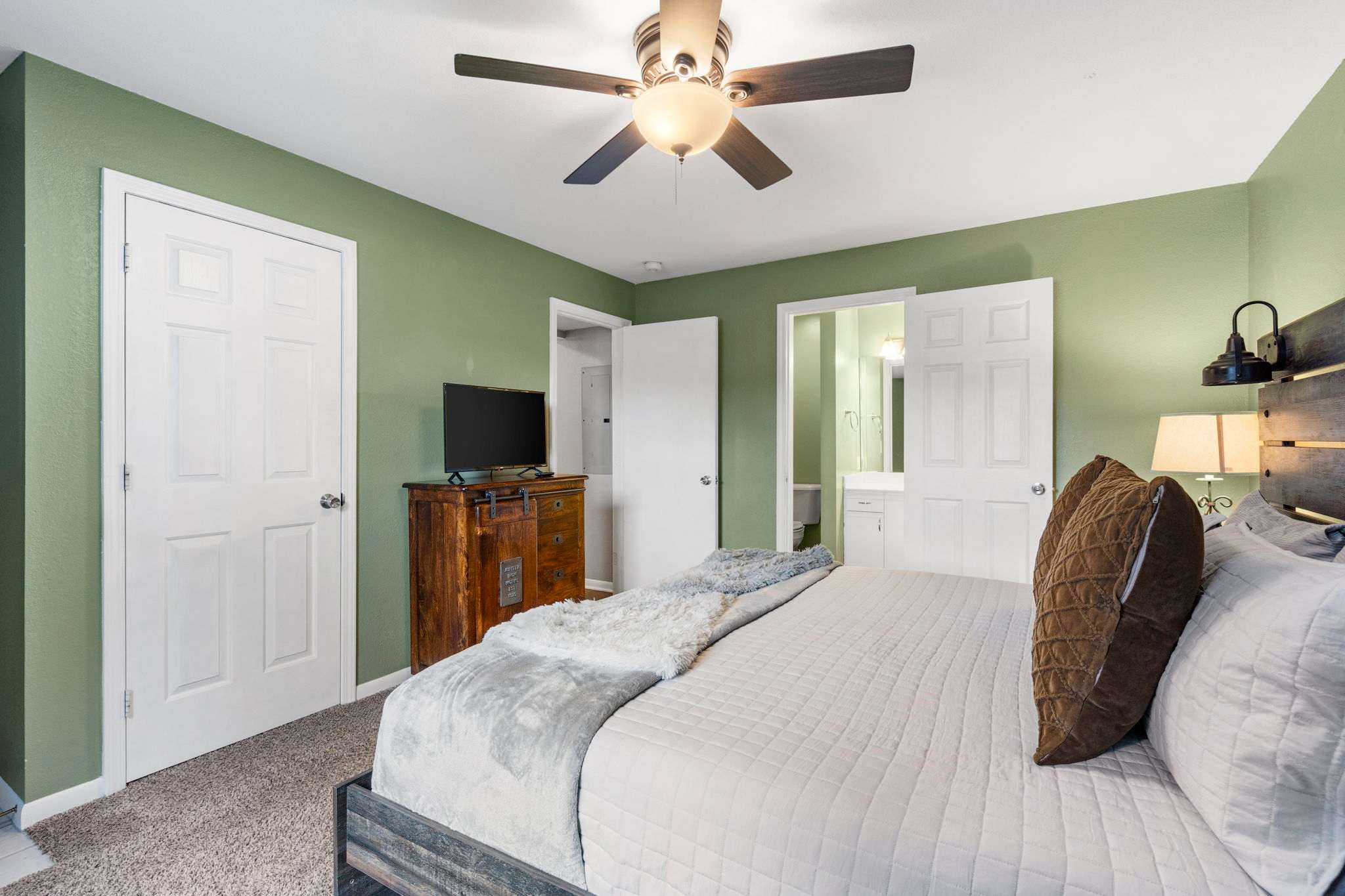 Bedroom #1 includes a king size bed, smart TV, and ensuite bathroom with a single vanity and shower/tub combo.
