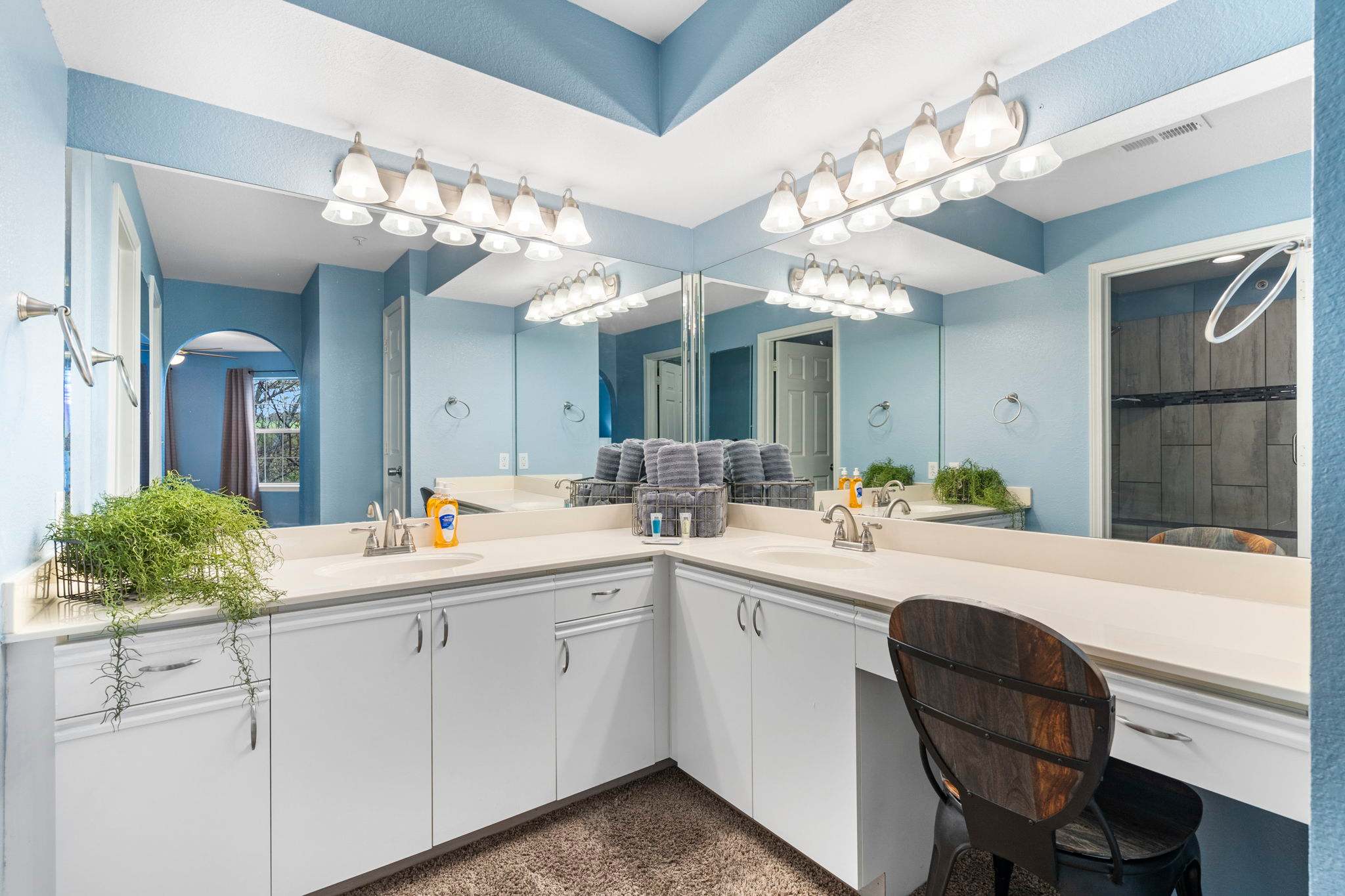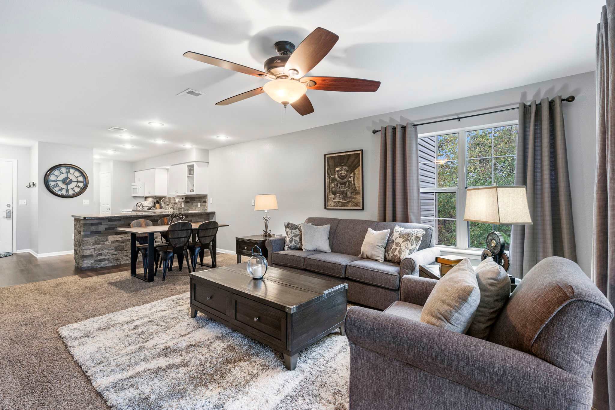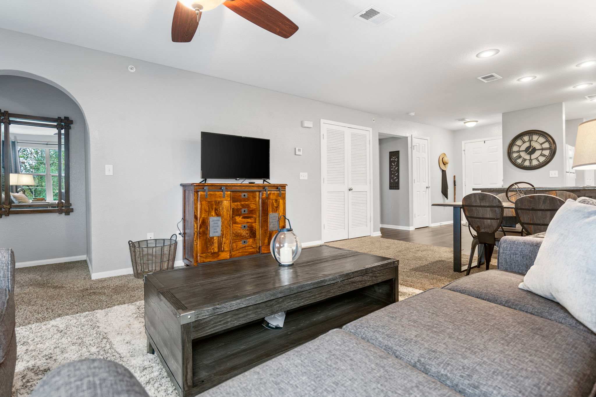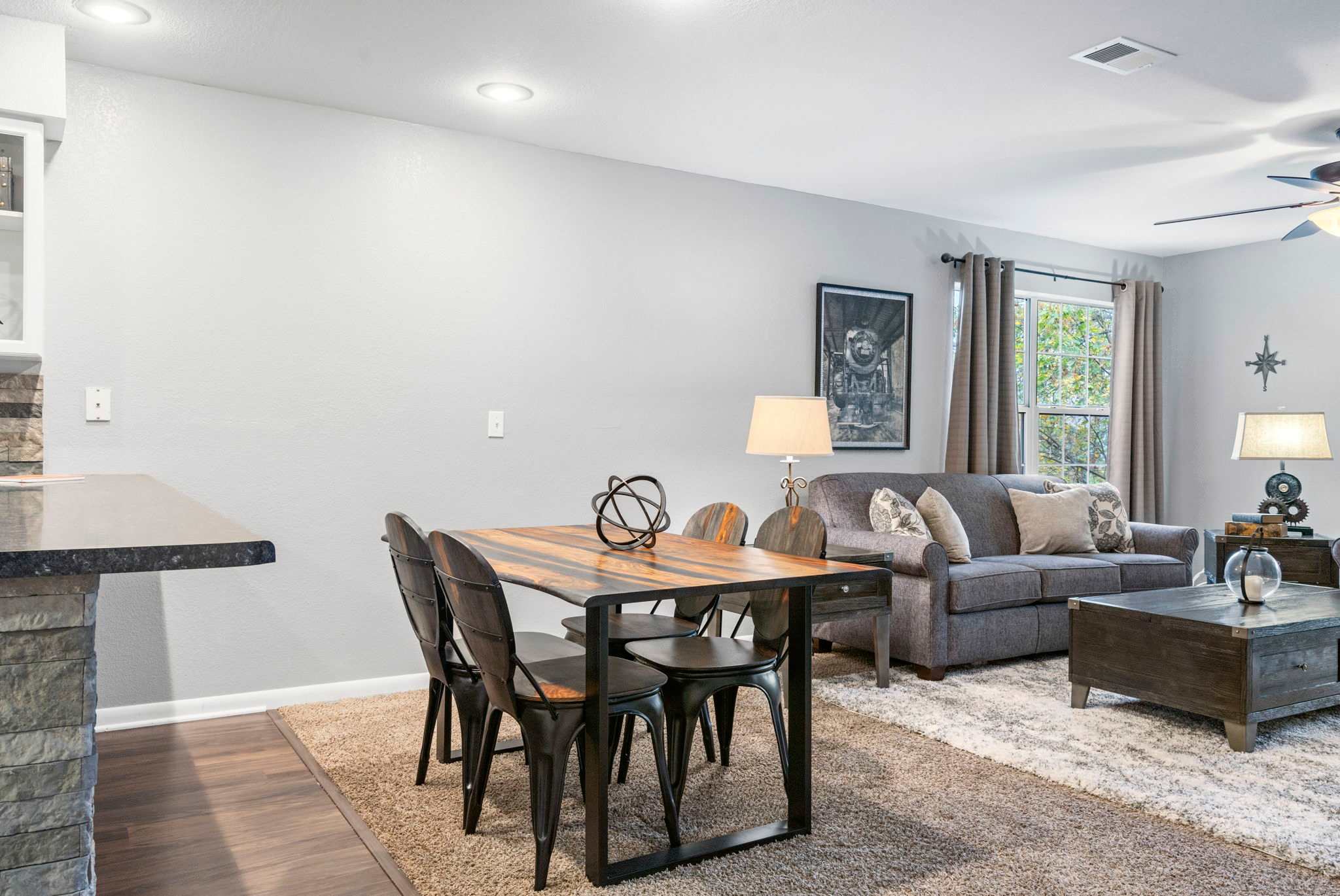 The home’s interior is just as delightful, with an open floor plan that’s elegantly decorated and well-furnished to maximize your comfort and enjoyment. The stylish and cozy living room offers a plush sofa and love seat to curl up on while streaming a movie or your favorite show on the smart TV. The modern and spacious kitchen is fully equipped for all your mealtime needs and offering ample cabinet space for food storage. The chic kitchen table can seat 6 for family-style meals or an evening of card games and casual conversation. Fire up the drip coffee maker in the morning and brew up a fresh cup, best enjoyed out on the private, shaded deck with views overlooking the lush greenery and community grounds.