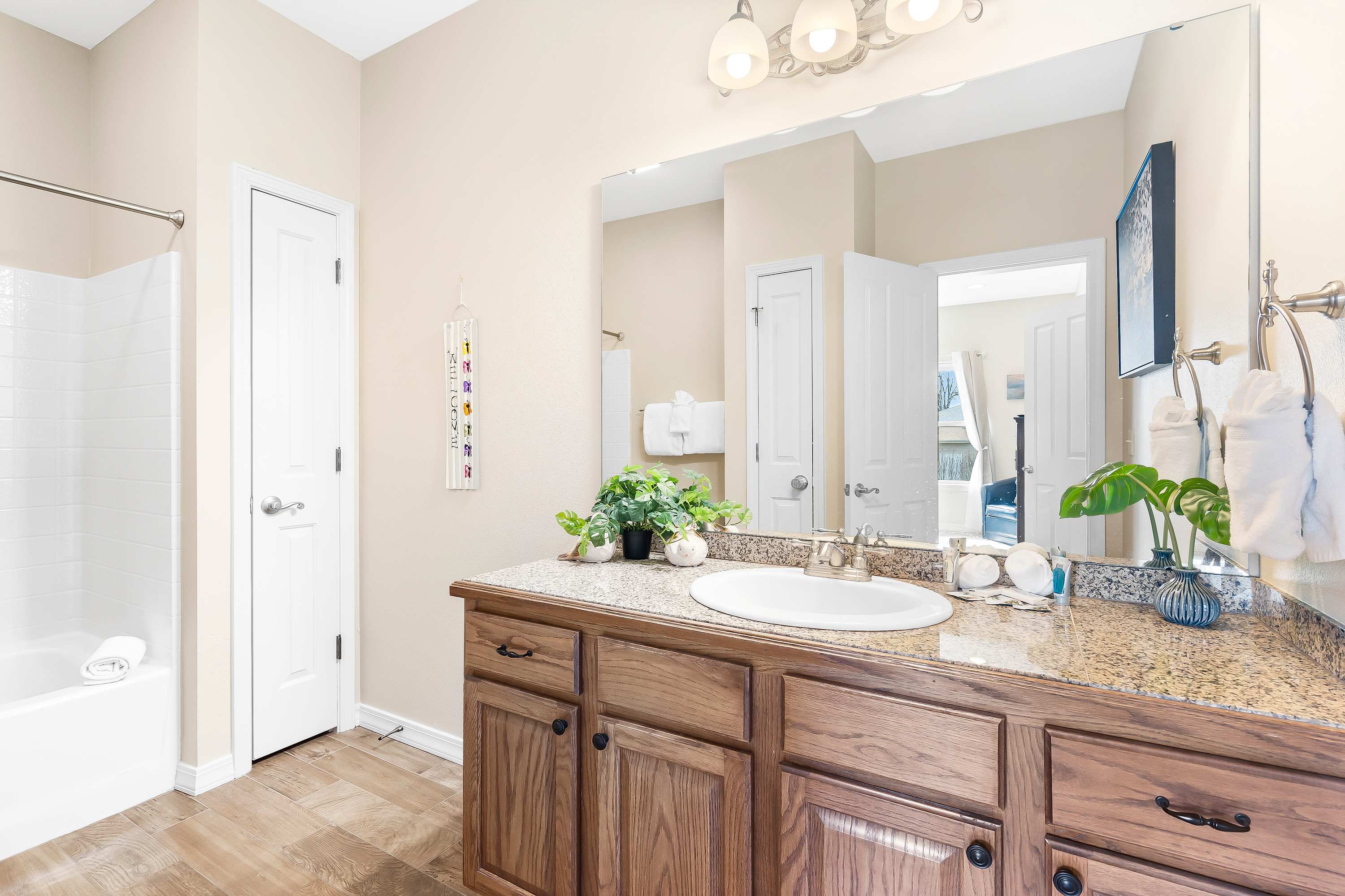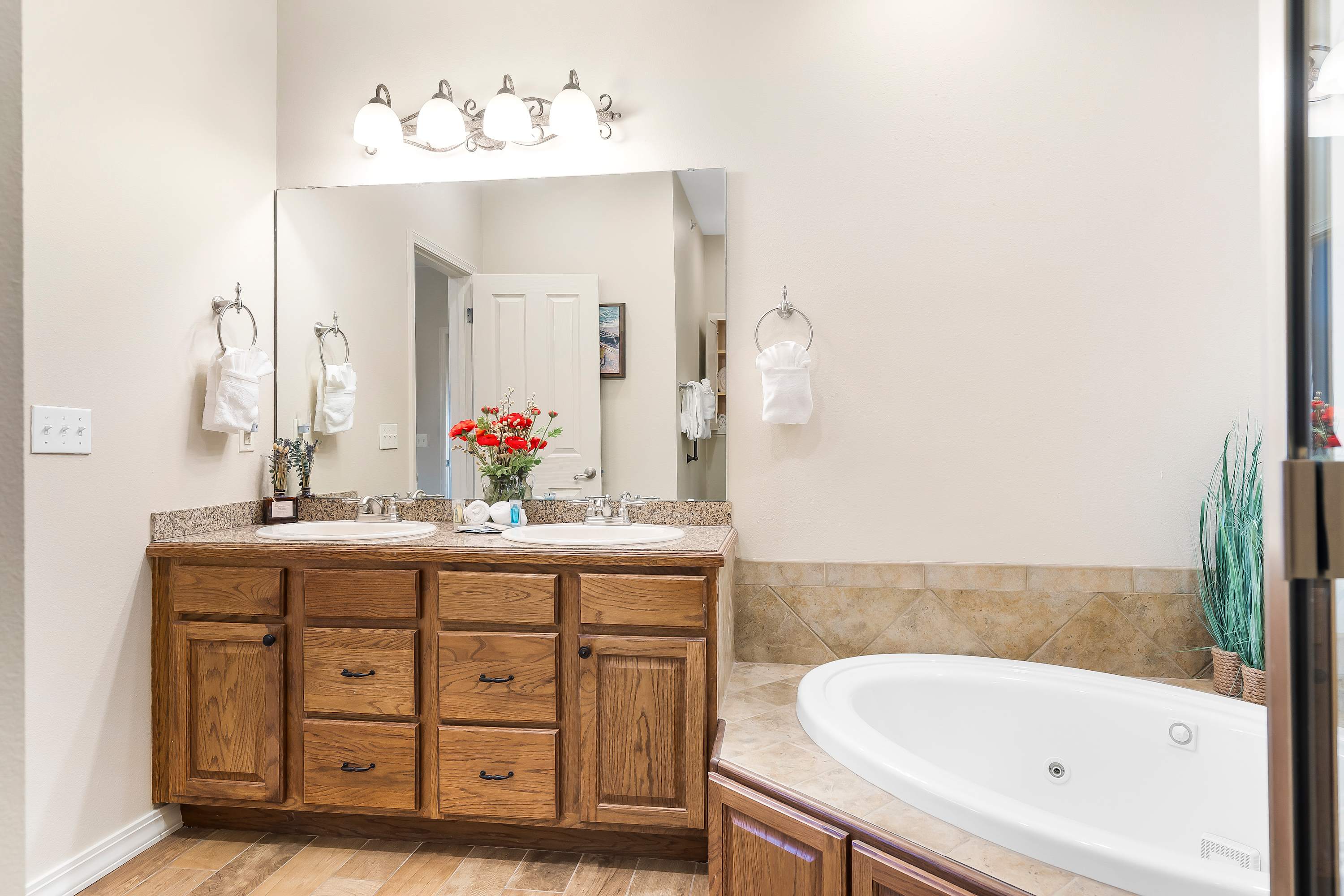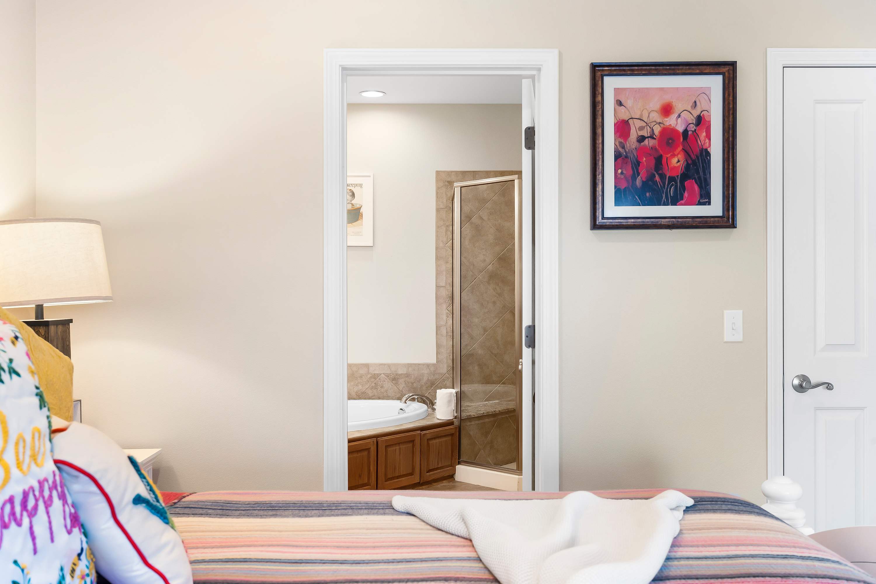 Bedroom #1 includes a king size bed, TV, and ensuite bathroom with a dual vanity, jetted tub, and walk-in shower.