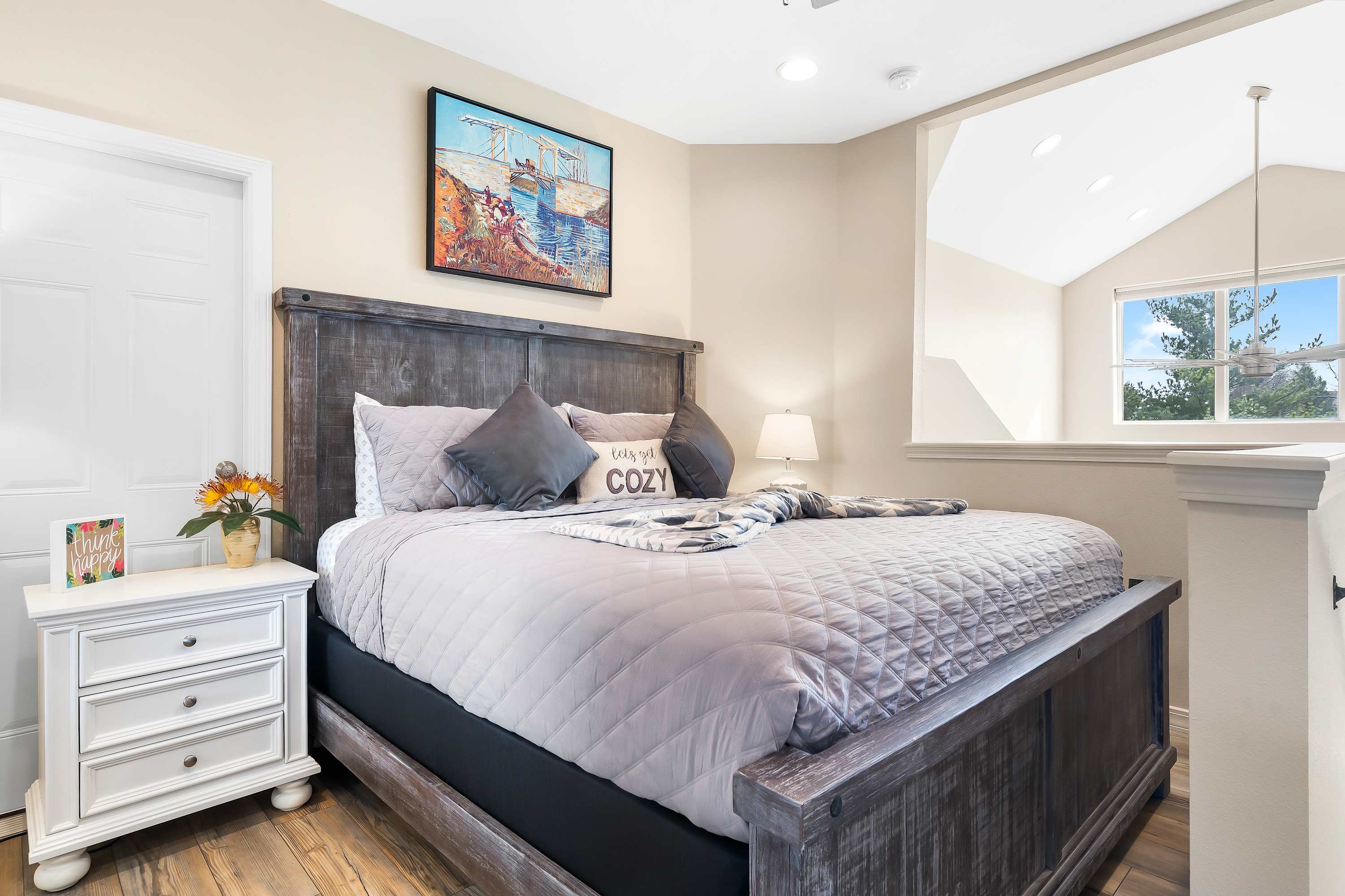 Bedroom #4 loft style - includes a king size bed, TV, and ensuite bathroom with a single vanity and shower/tub combo.