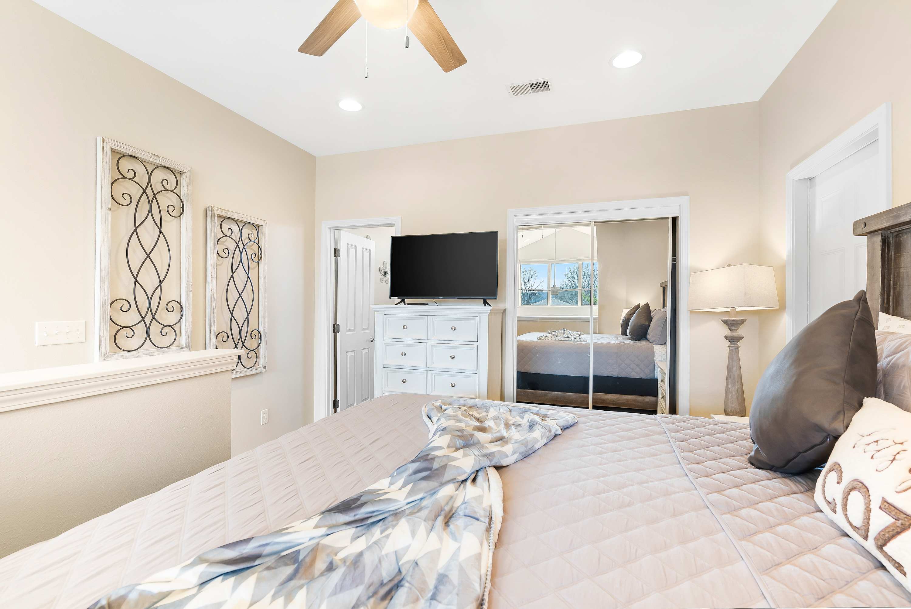 Bedroom #3 includes a king size bed, TV, and ensuite bathroom with a single vanity and shower/tub combo.