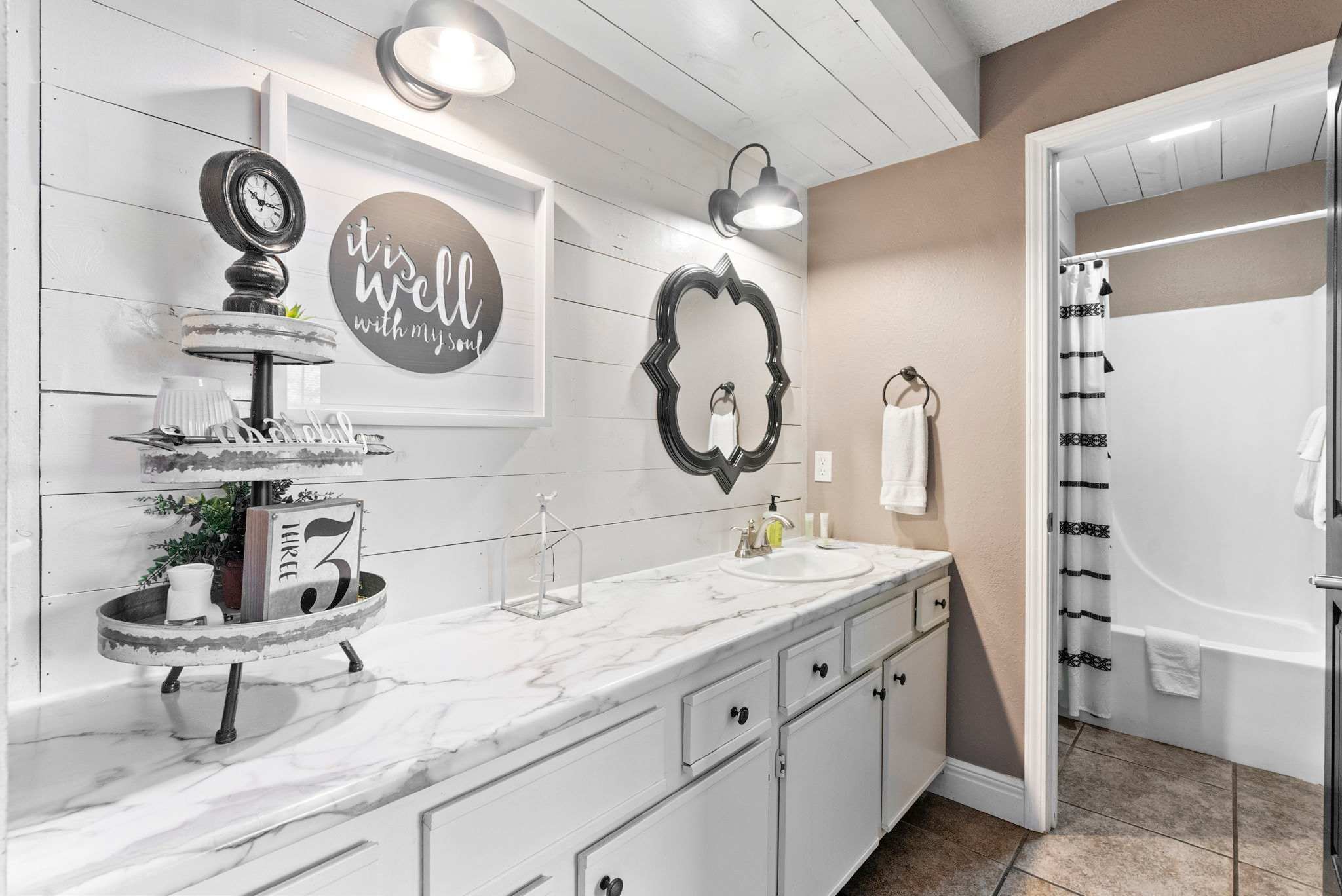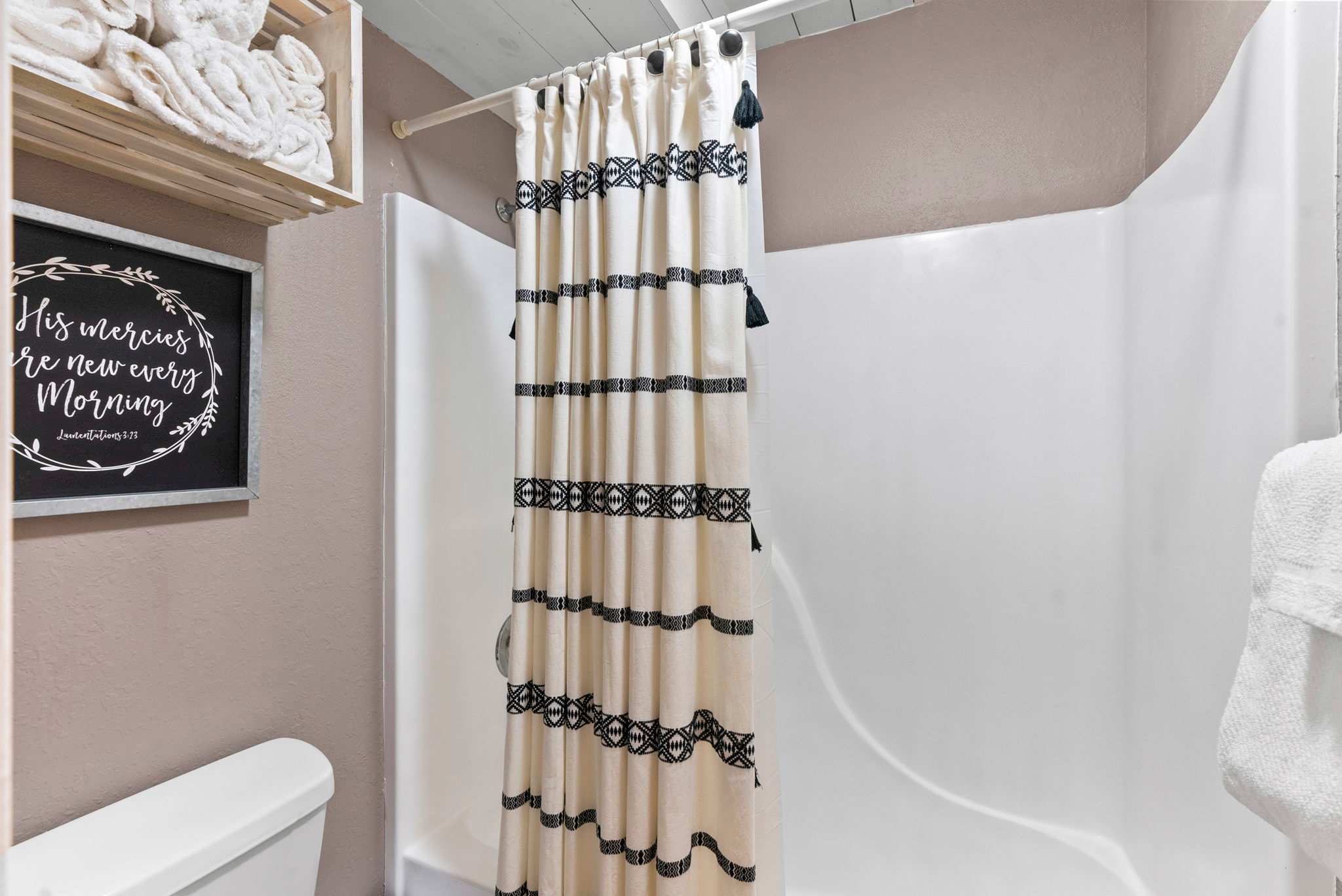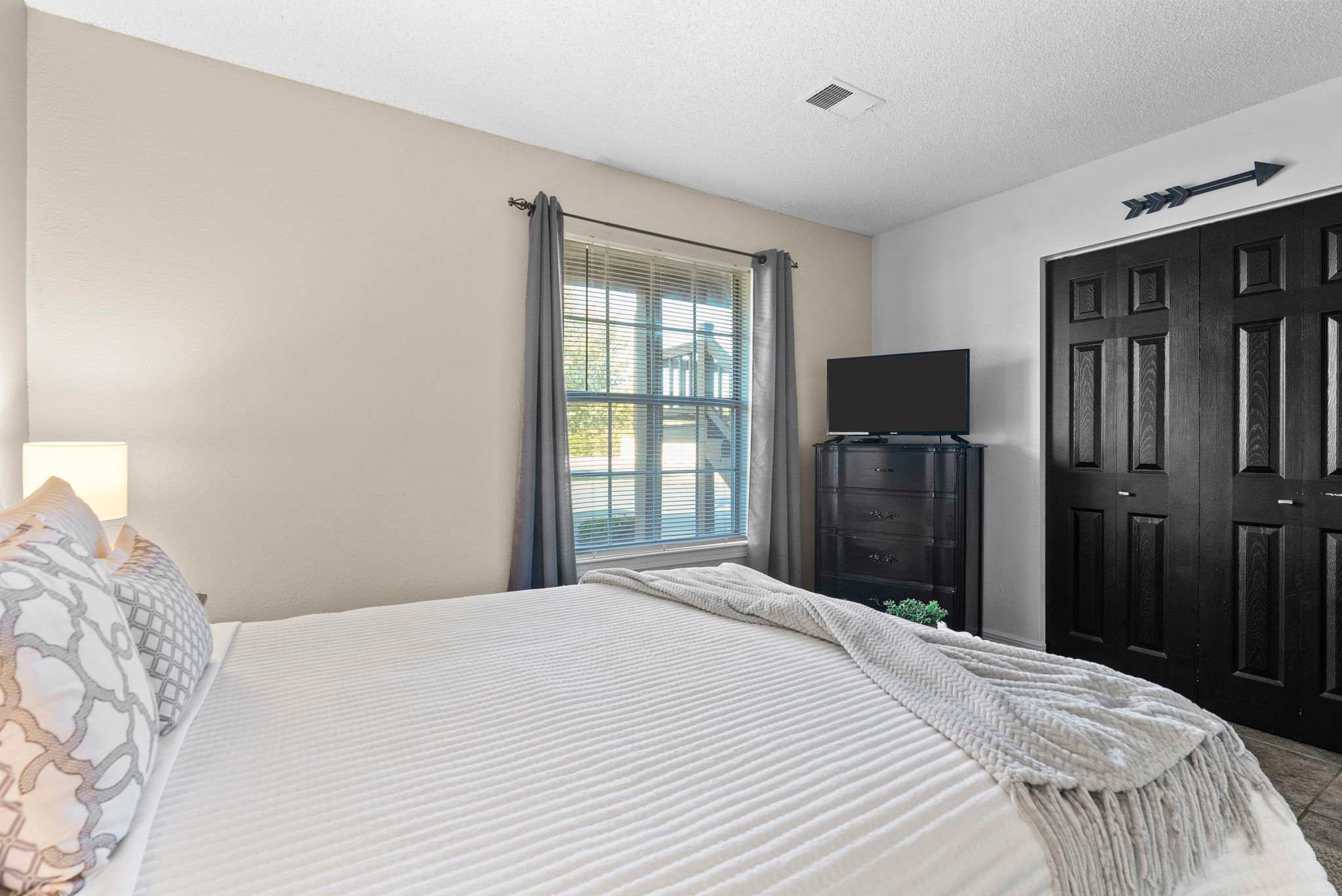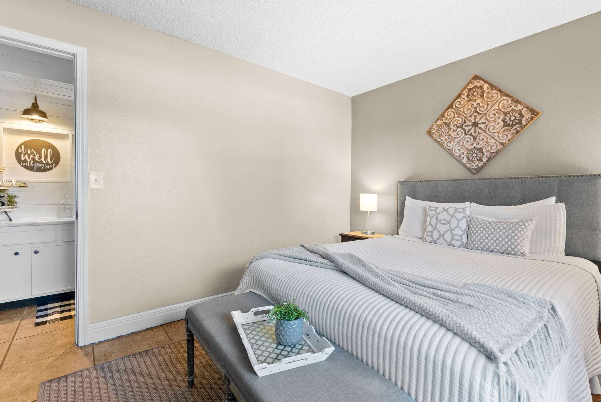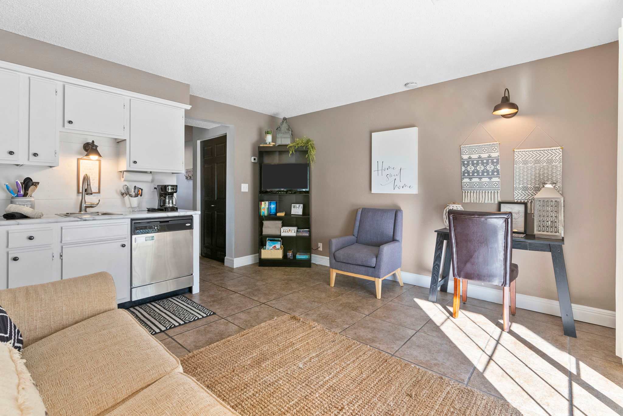 This home comfortably sleeps 2 guests in 1 private bedroom. The bedroom includes a spacious queen-size bed with crisp linens and soft blankets for a great night’s rest, along with a TV. The home’s full bathroom is an ensuite to the bedroom, with an oversized single vanity and shower/tub combo.